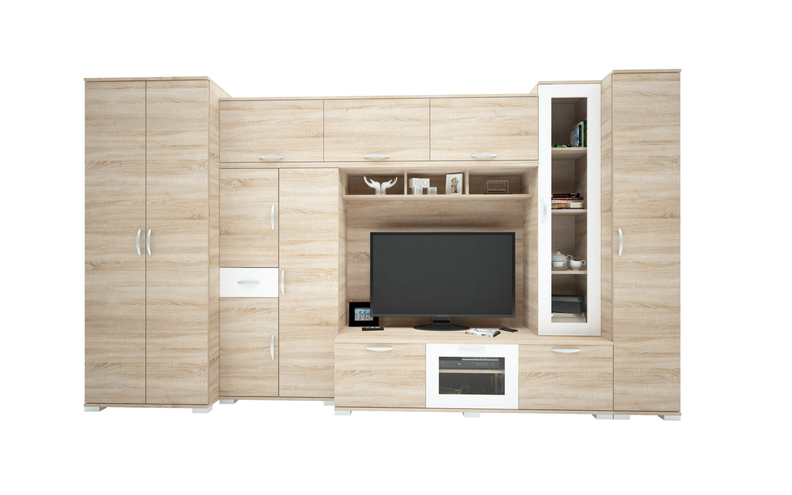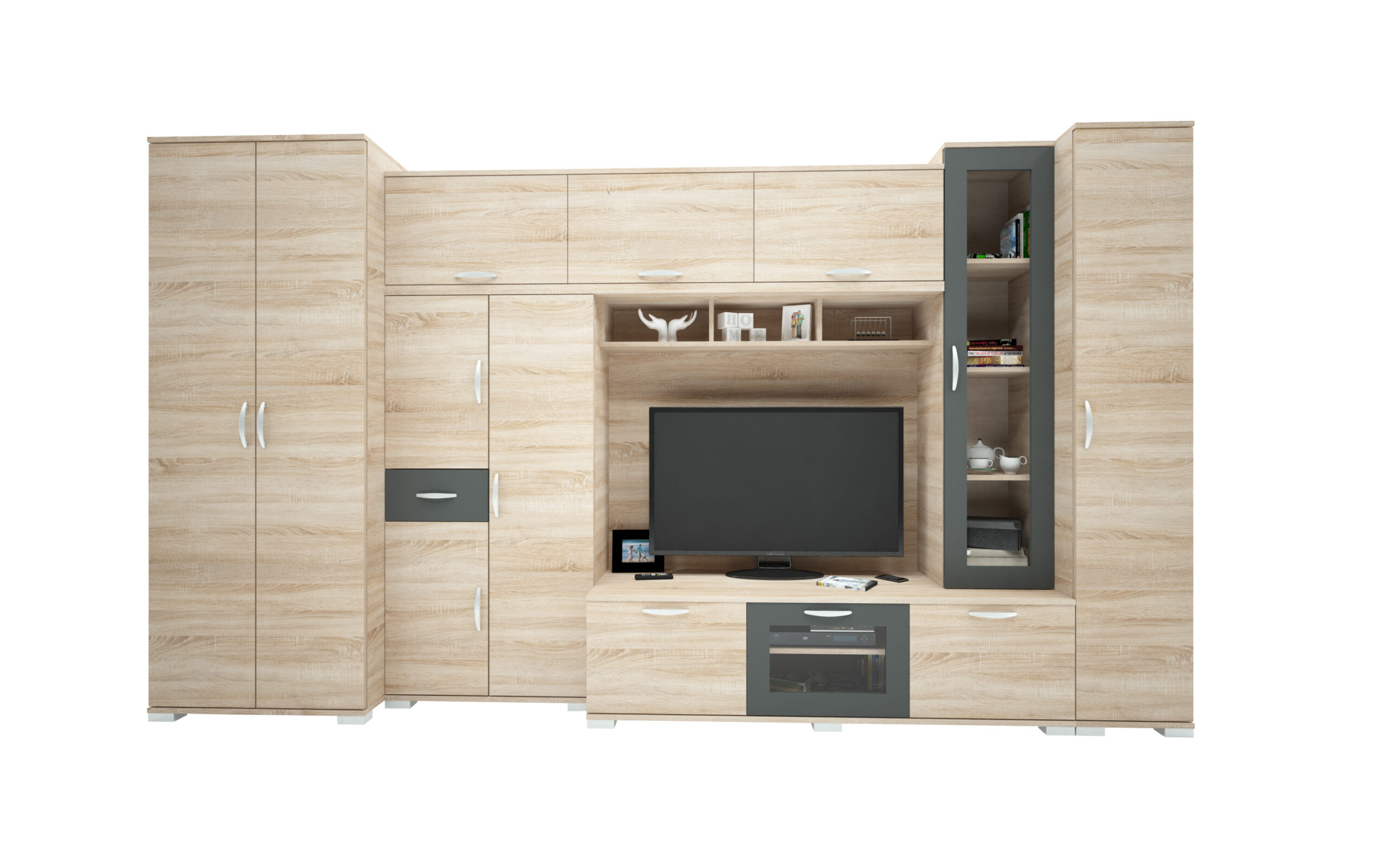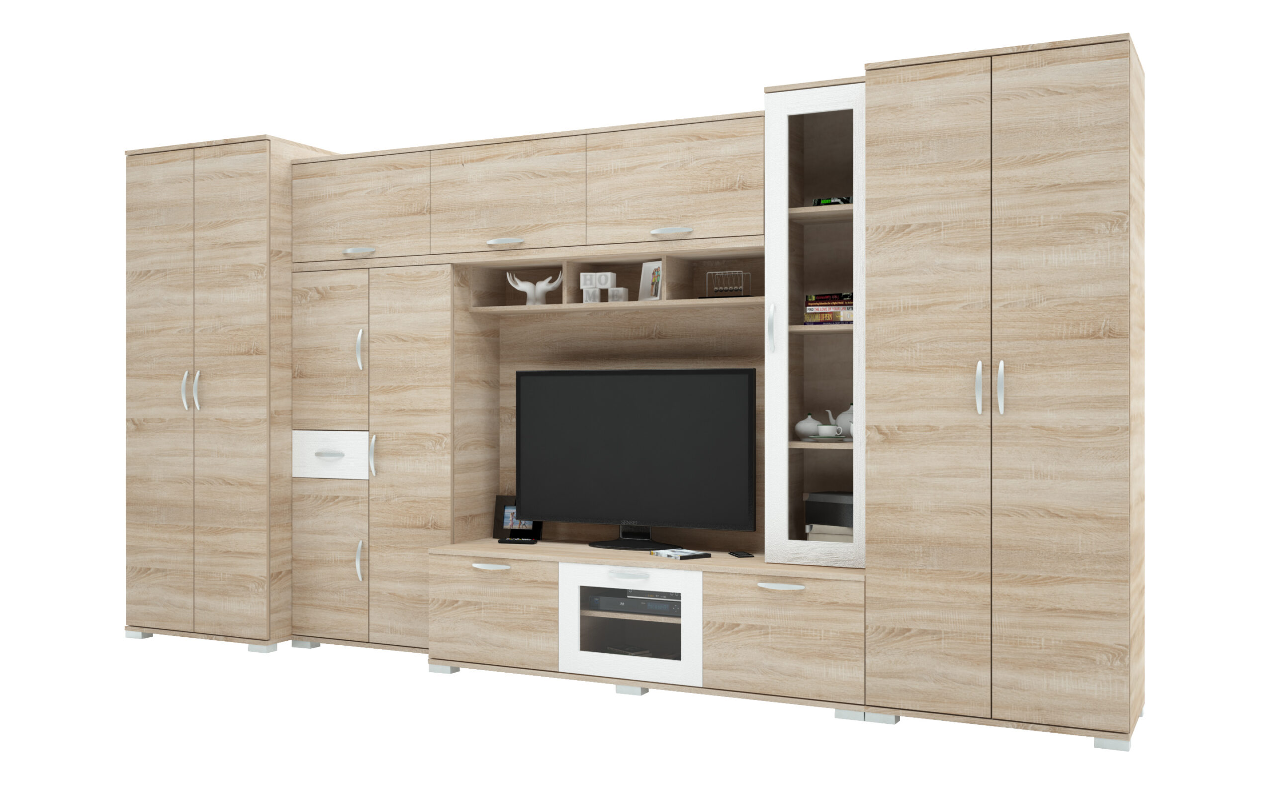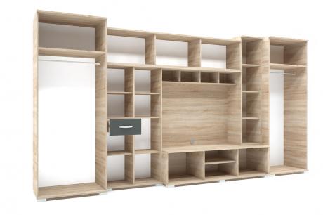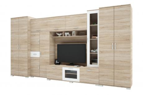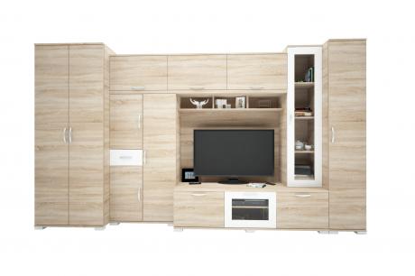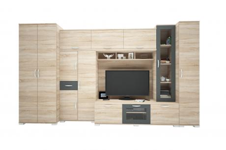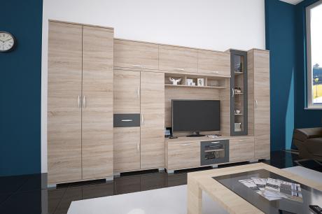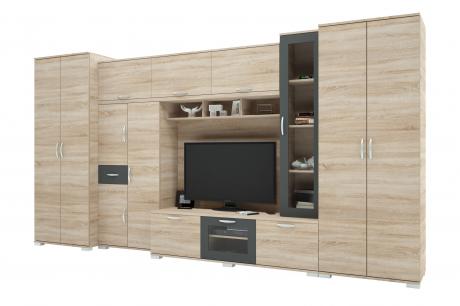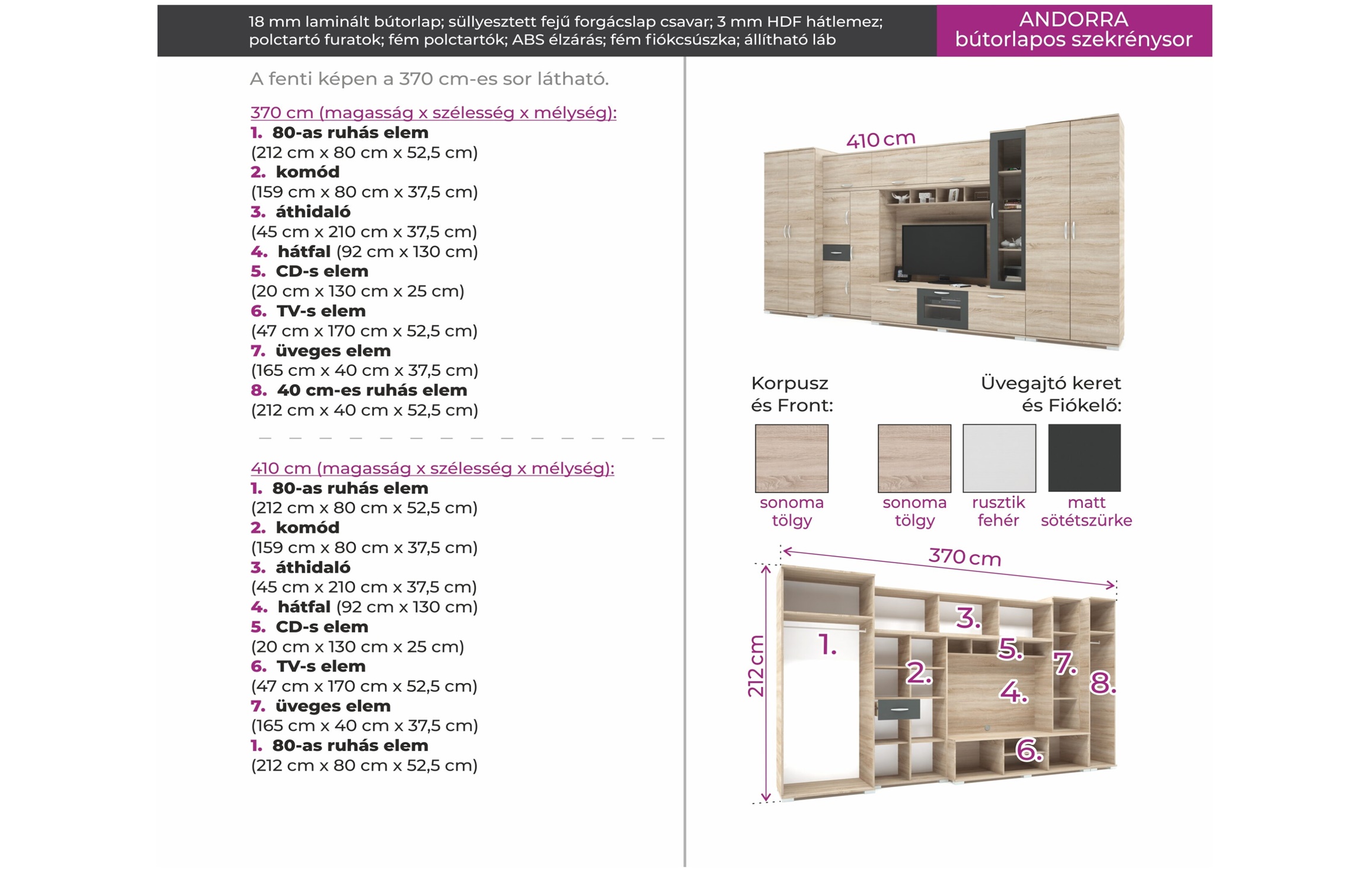 Az Andorra szekrénysor a képen látható, közkedvelt onoma tölgy színben rendelhető rusztik fehér, matt sötétszürke vagy sonoma üvegajtó kerettel, illetve fiókelővel. A legtöbb otthonba könnyedén beilleszkedik. Nappali szekrénysor szerepe mellett méretének köszönhetően nem okoz gondot a ruhák tárolása sem. A bútor 370 cm széles és 410 cm széles változatban választható.