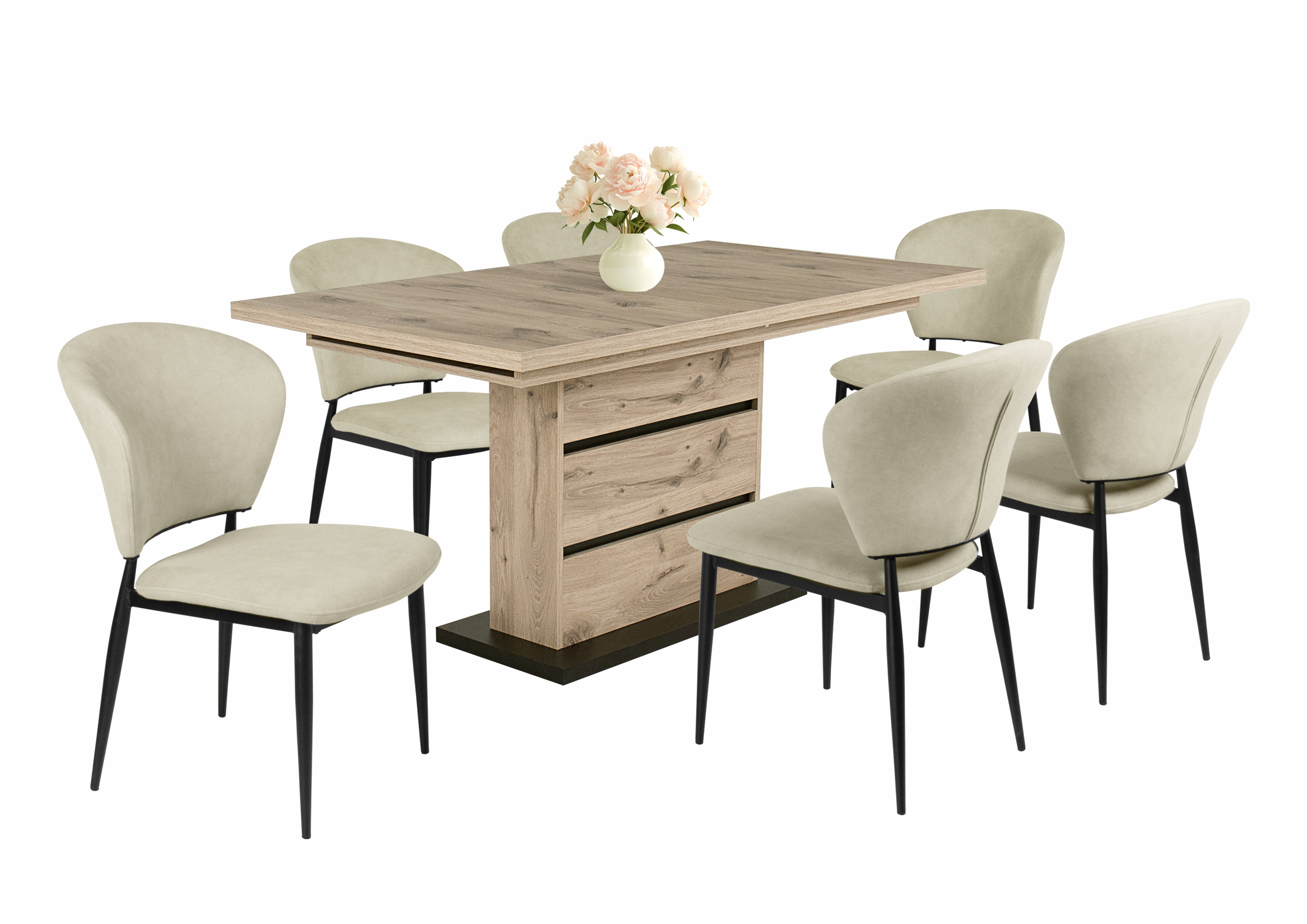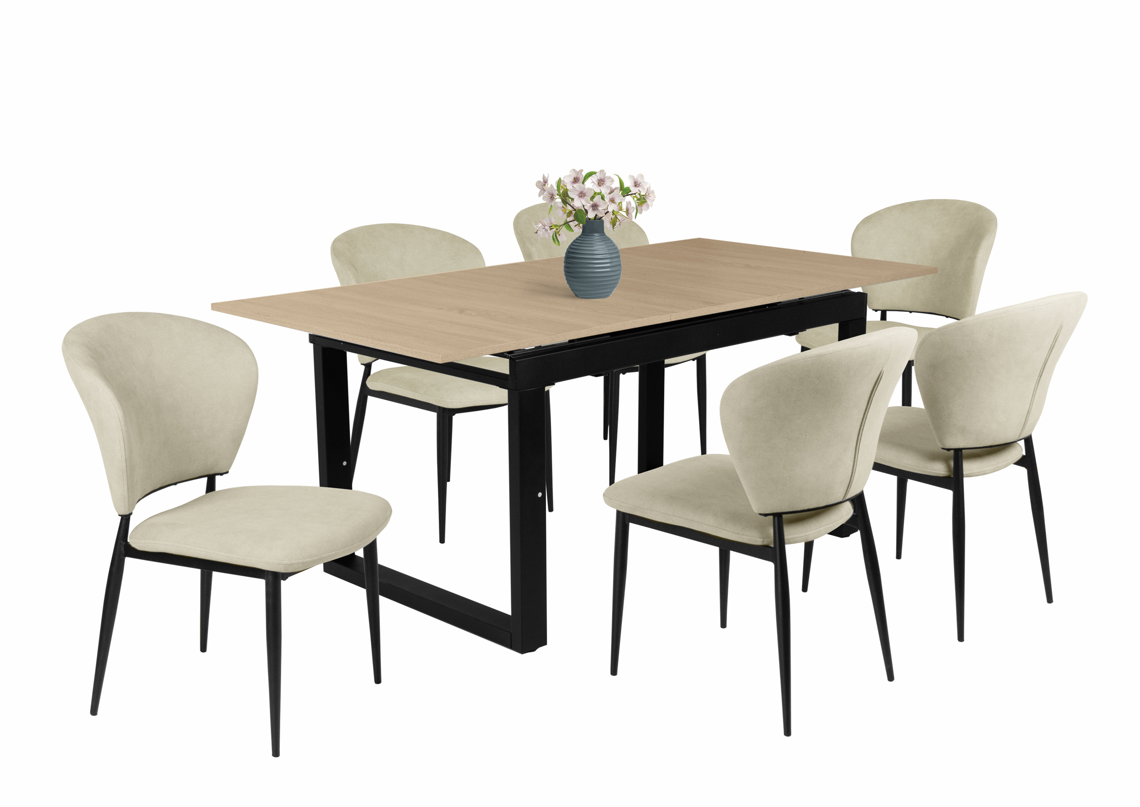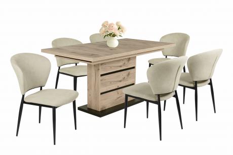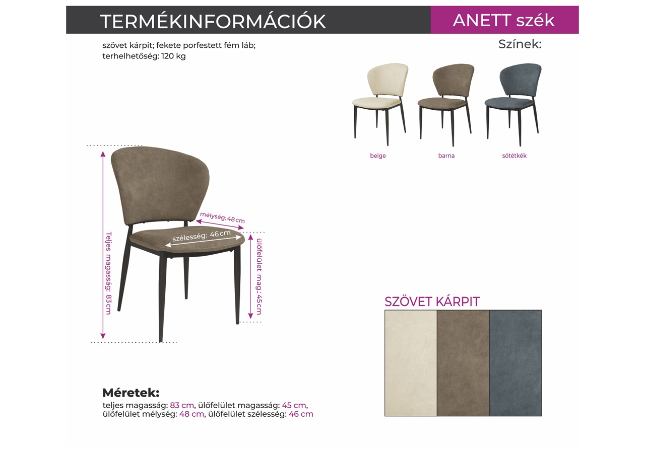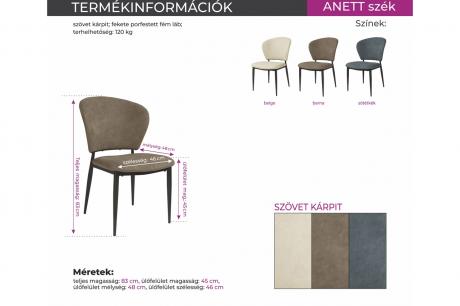 Az Anett szék szövet kárpitja beige, barna vagy sötétkék színben és fekete porfestett fém lábakkal rendelhető. Kényelmes ülőfelülettel és háttámlával rendelkezik.