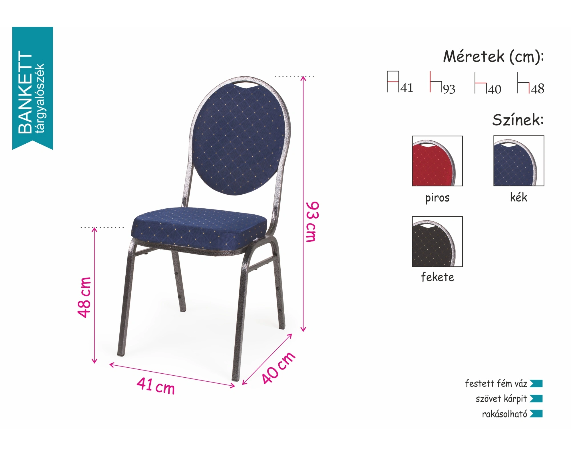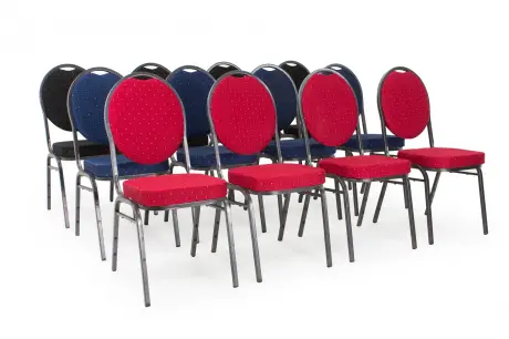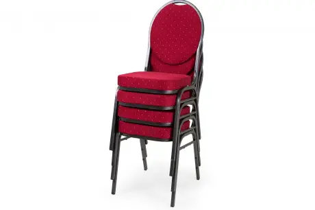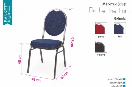 A Bankett tárgyalószék kiválóan alkalmas konferenciákra, illetve dísztermekbe, rendezvényekre, esküvőkre. A szövetből készült ülőfelület és a háttámla is nagyon kényelmes. Nagy előnye, hogy rakásolható, tehát szükség esetén akár nagyszámú szék tárolható kis helyen. A lába festett fém, ami praktikus, könnyen tisztán tartható és stabil.