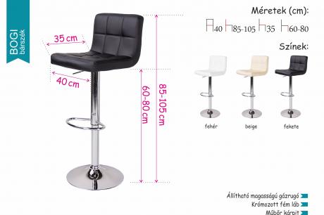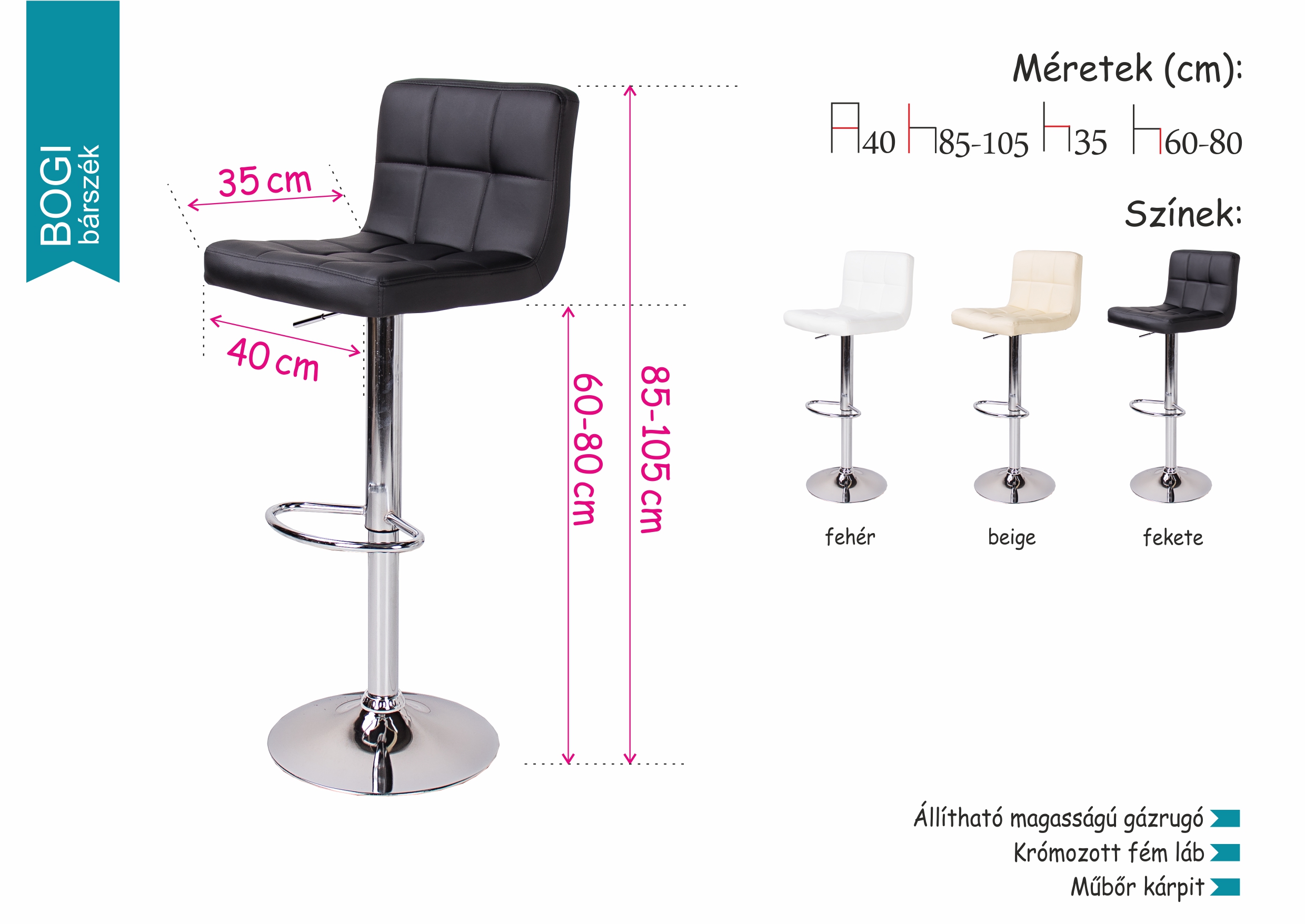 A Bogi bárszék krómozott fém lábbal és 3 színben rendelhető műbőr kárpitozással készül. Állítható magasságú gázrugója segítségével bárasztalunkhoz, pultunkhoz igazíthatjuk az ülőlap magasságát, hogy a lehető legkényelmesebb legyen számunkra. Bogi bárszék trendi megjelenést és tökéletes kényelemet varázsol a modern otthonokba!