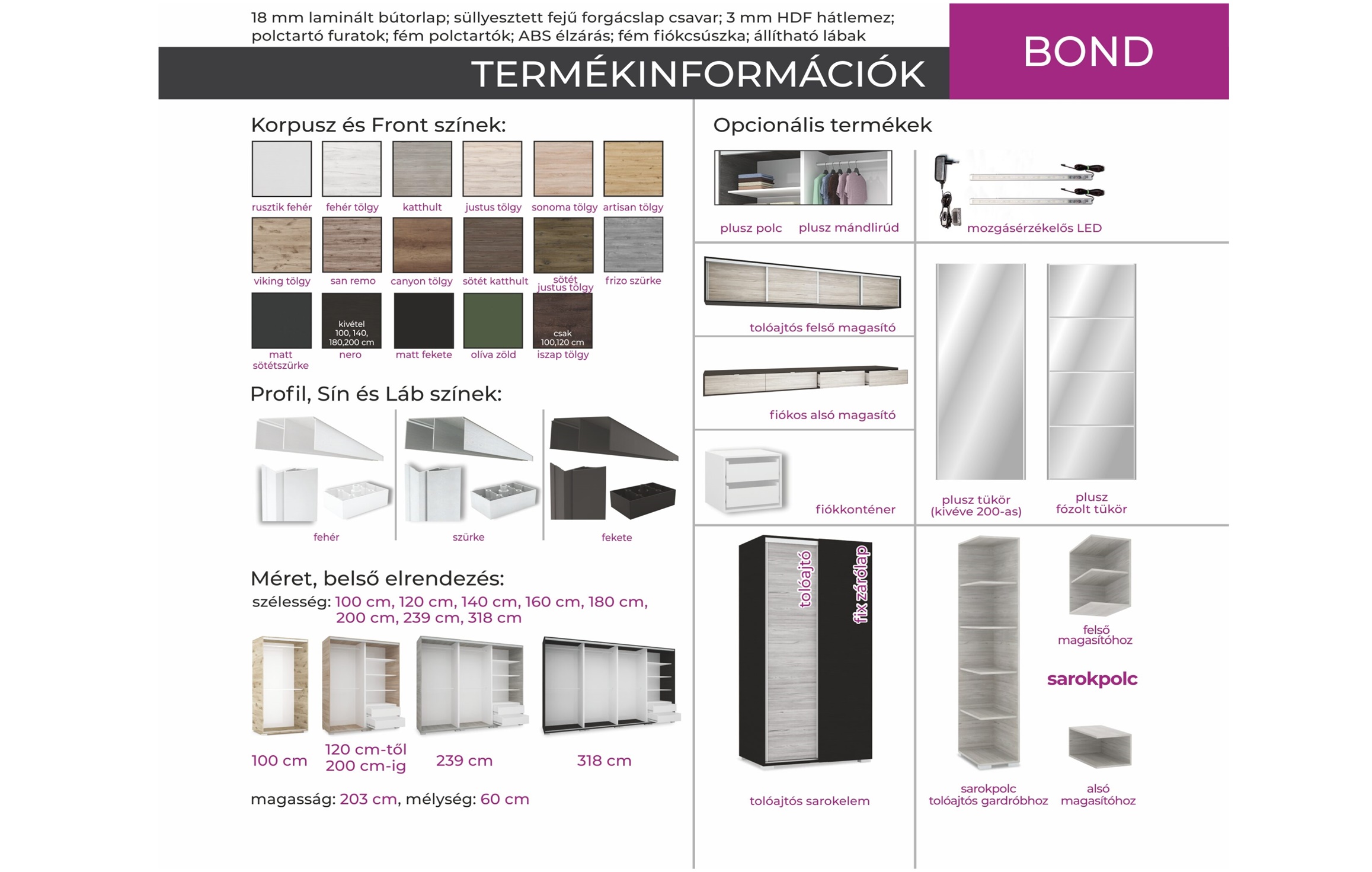 A Bond gardrób széles választékkal igyekszik mindenki igényeinek megfelelni. Számos méret és megannyi bútorlapszín közül lehet választani. 15 bútorlapszínének köszönhetően könnyen kiválaszthatjuk a szobánkhoz leginkább passzoló árnyalatot. A bútor továbbá kérhető szürke vagy fekete profillak és lábbal is. Belső elrendezését tekintve teljesen személyre szabható, köszönhetően az akár egymásra is helyezhető fiókdobozoknak, a polcoknak és mándlirudaknak, melyek külön rendelhetőek a gardróbhoz. A gardrób tárolókapacitása is tovább bővíthető fiókos alsó és tolóajtós felső magasítókkal. A bútorlapos tolóajtók tükrös ajtókkal és fózolt tükrös ajtókkal (ajtónként 4 osztott tükör) egészíthetők ki, mely a tér növelését is elősegíti, illetve még dekoratívabbá teszi a bútort.