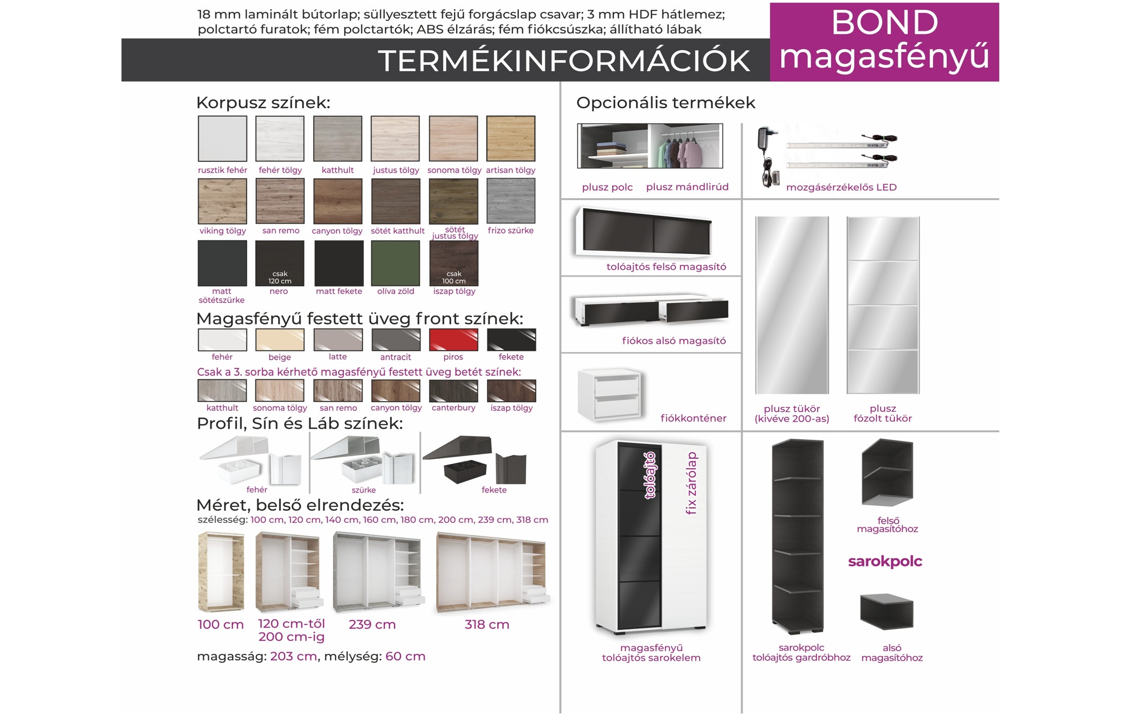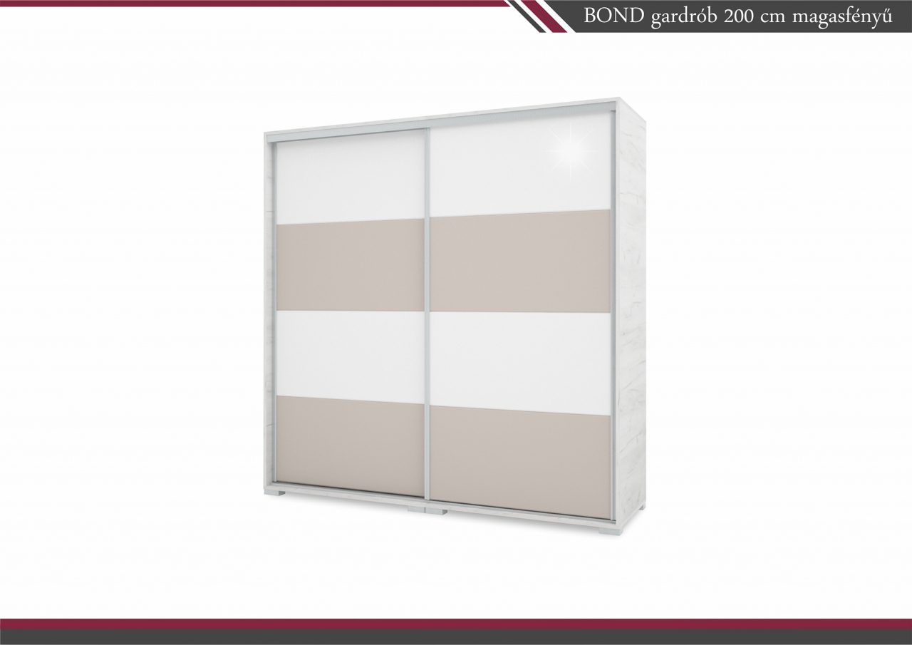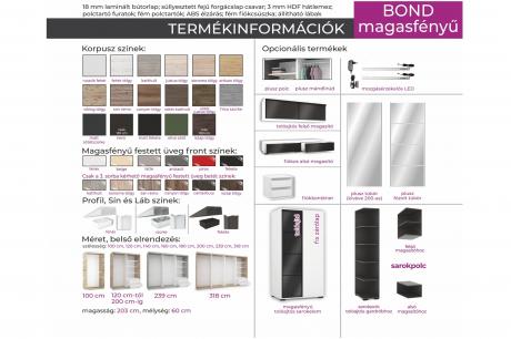 A Bond magasfényű gardrób széles választékával igyekszik mindenki igényeinek megfelelni. Egy igazán stílusos és modern bútordarab, amely ideális választás lehet a modern lakberendezés szerelmeseinek. Ha ez nem lenne elegendő sima teli tükörrel, vagy fózolt tükörrel (osztott tükör) is feldobhatja a gardrób külső megjelenését. Elegáns, letisztult vagy akár merész megjelenést is adhat a gardróbnak. Szinte csak a képzelete szab határt.