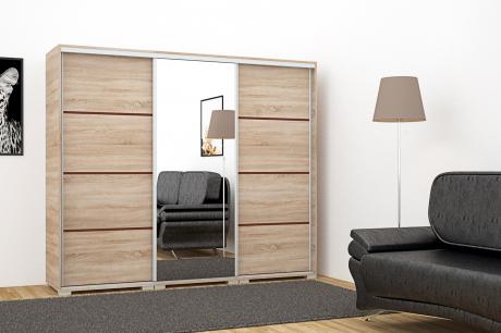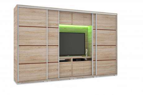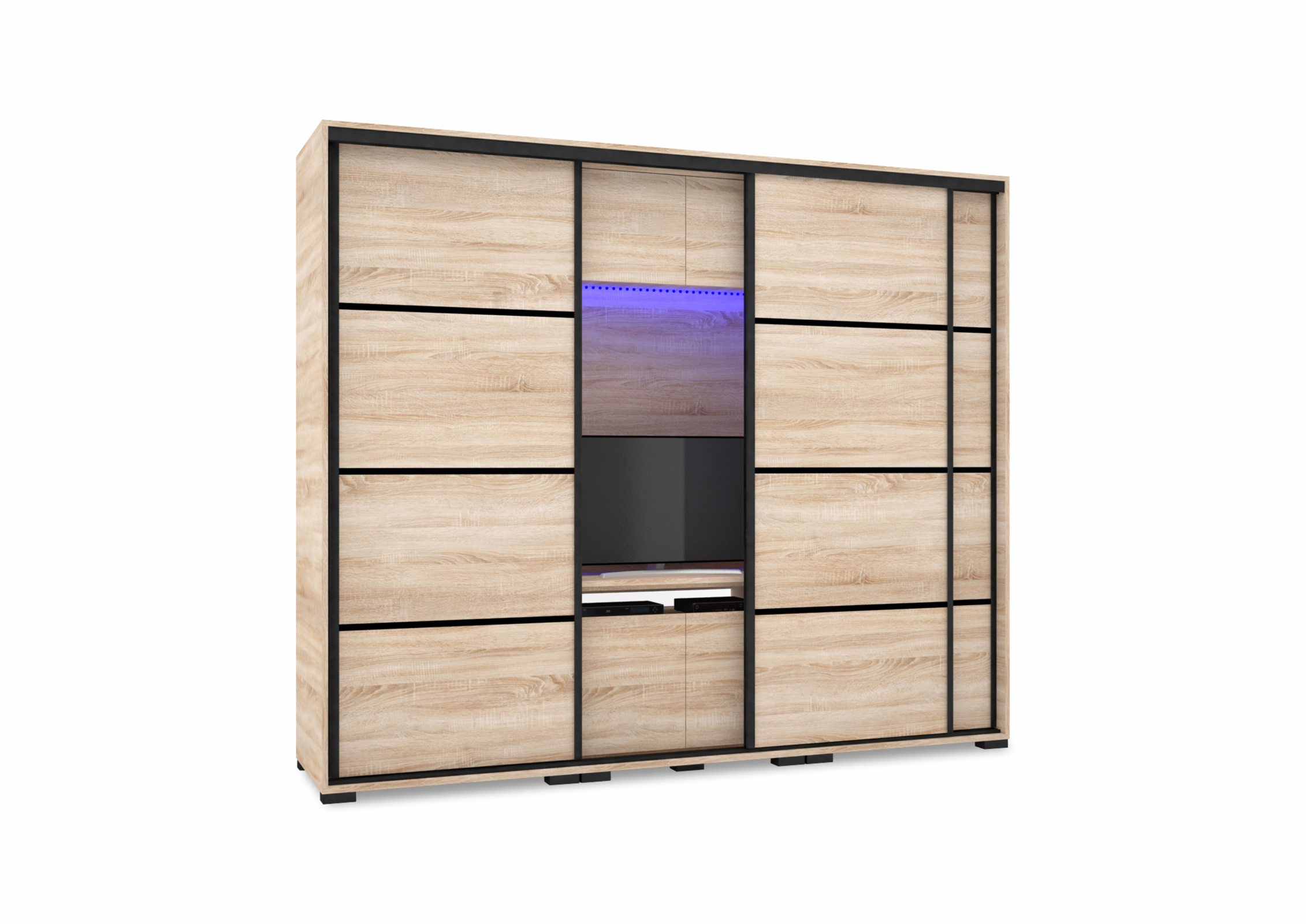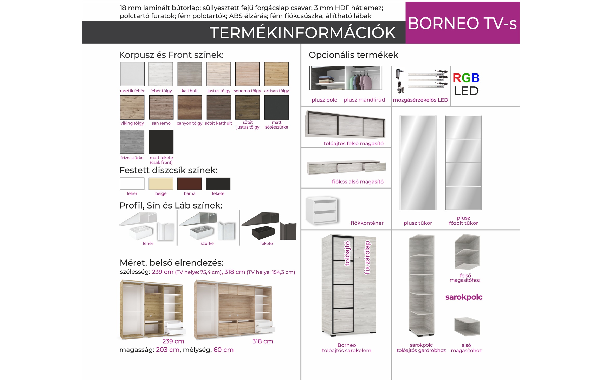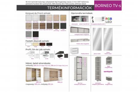 A Borneo TV-s gardrób a gardróbok legújabb generációját képviseli, ami annak köszönhető, hogy belső kialakítása már nemcsak ruhák tárolását teszik lehetővé, hanem a televíziónkat is el tudjuk benne "rejteni". A két ruhás elem között egy TV-s box lett kialakítva, ami tökéletesen beintegrálódik a gardrób egészébe. Különleges, díszcsíkkal ellátott Borneo gardróbunk széles színválasztékának köszönhetően mindenki megtalálhatja a számára legideálisabb darabot otthonába, hiszen 15 szín közül lehet választani, amelyekhez 4-féle díszcsík társítható. Jól pakolhatóság jellemzi a bútort a fiókos, polcos és ruhaakasztós kialakításnak köszönhetően, mely opcionálisan variálható és bővíthető, így mindenki a maga ízlésére tudja szabni. A gardrób kizárólag 239 cm vagy 318 cm széles változatban rendelhető, figyelembe véve az adott TV és a szoba méretét.