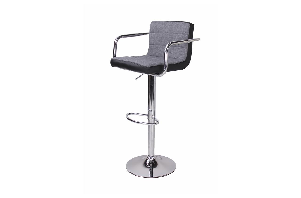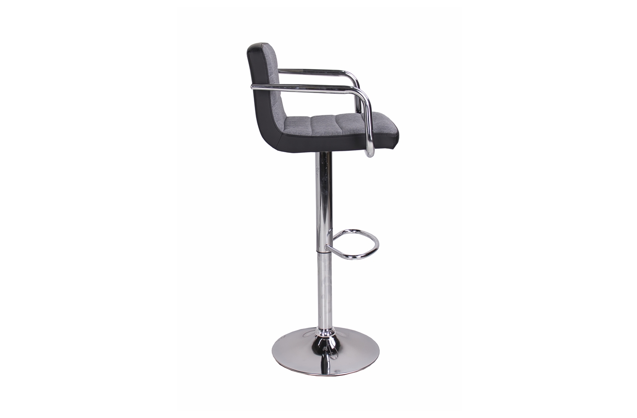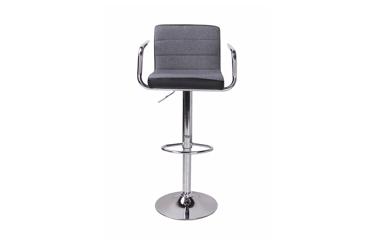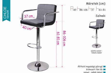 A Chloe bárszék szürke szövet - fekete műbőr kárpit kombinációjának köszönhetően a legtöbb lakás lakberendezési stílusába beilleszthető. Az elegáns, krómozott fém láb és kartámasz nemcsak modern külsőt kölcsönöz neki, hanem a tökéletes kényelmet is biztosítja. Állítható magasságú gázrugója segítségével könnyedén beállíthatjuk a számunkra leginkább megfelelő magasságot.