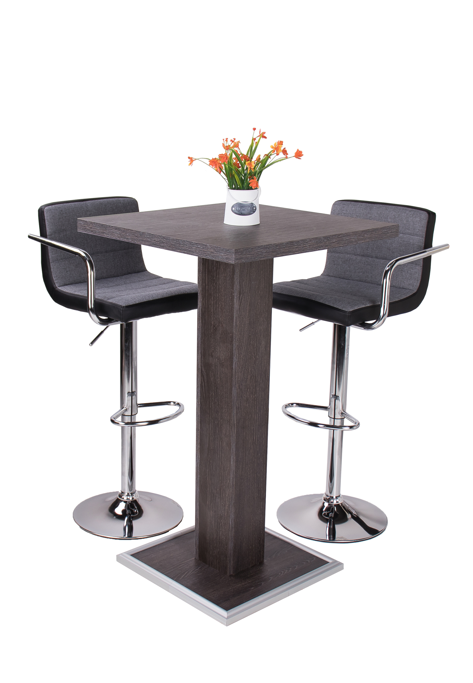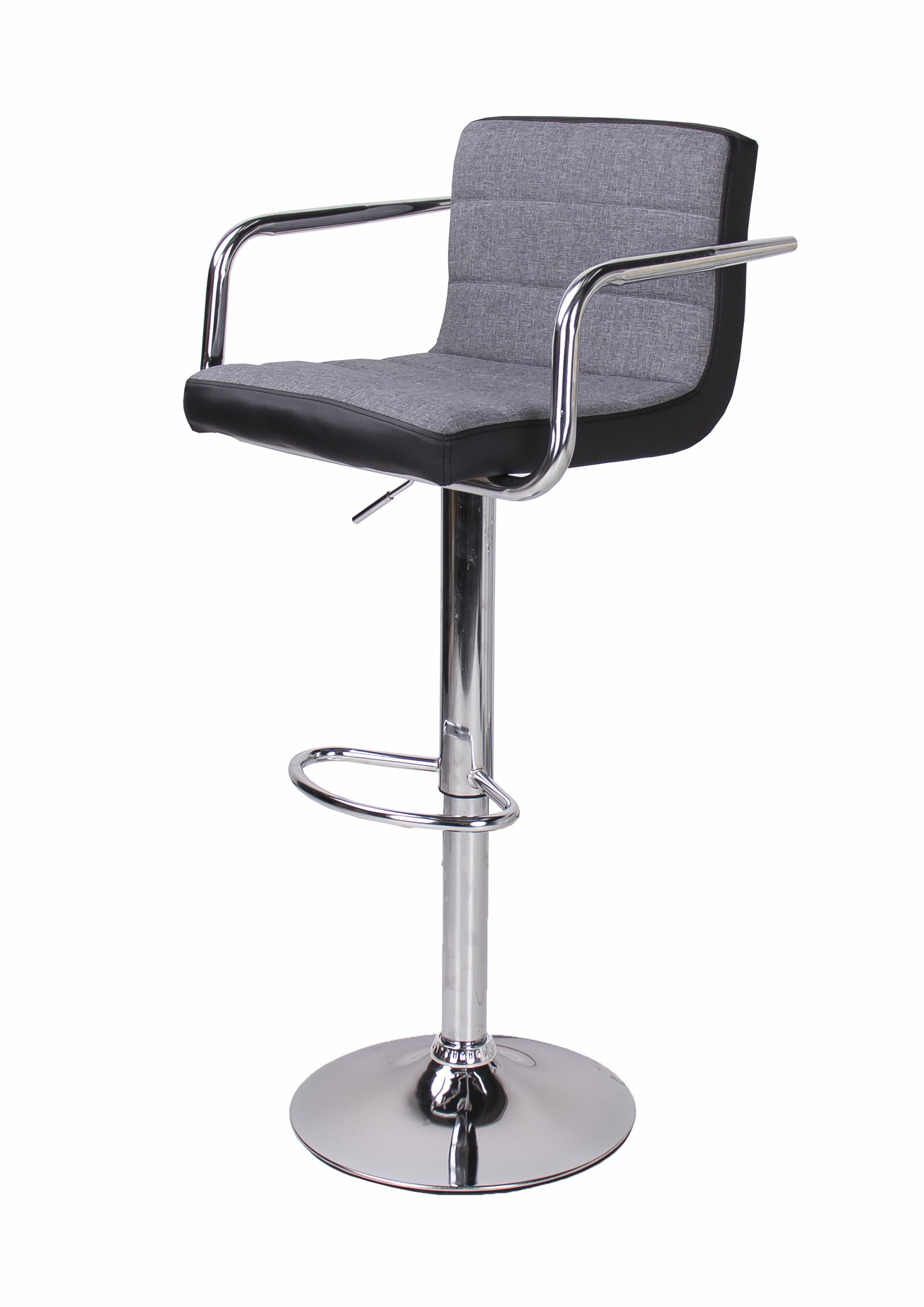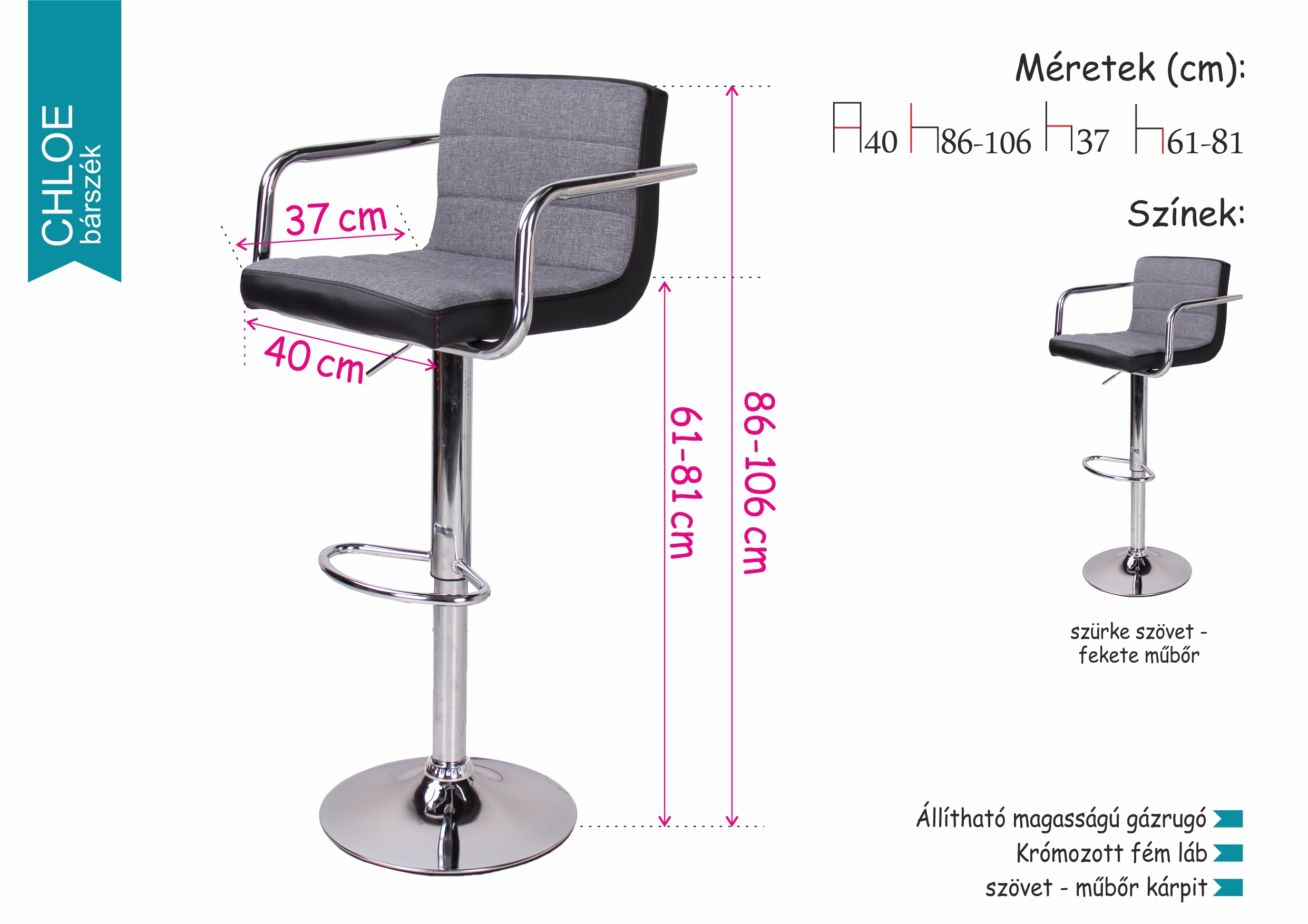 A Chloe bárszék szürke szövet - fekete műbőr kárpit kombinációjának köszönhetően a legtöbb lakás lakberendezési stílusába beilleszthető. Az elegáns, krómozott fém láb és kartámasz nemcsak modern külsőt kölcsönöz neki, hanem a tökéletes kényelmet is biztosítja. Állítható magasságú gázrugója segítségével könnyedén beállíthatjuk a számunkra leginkább megfelelő magasságot.