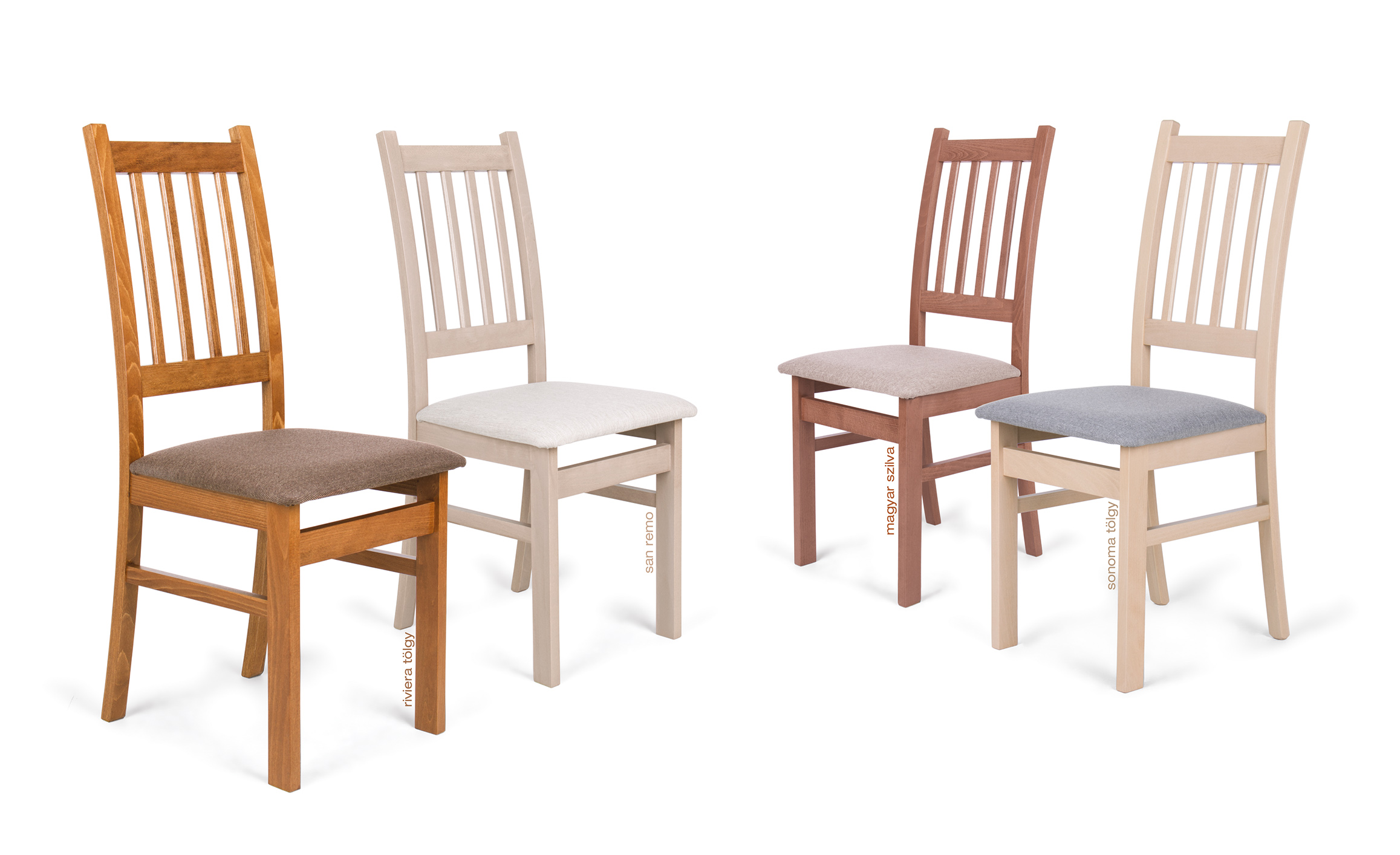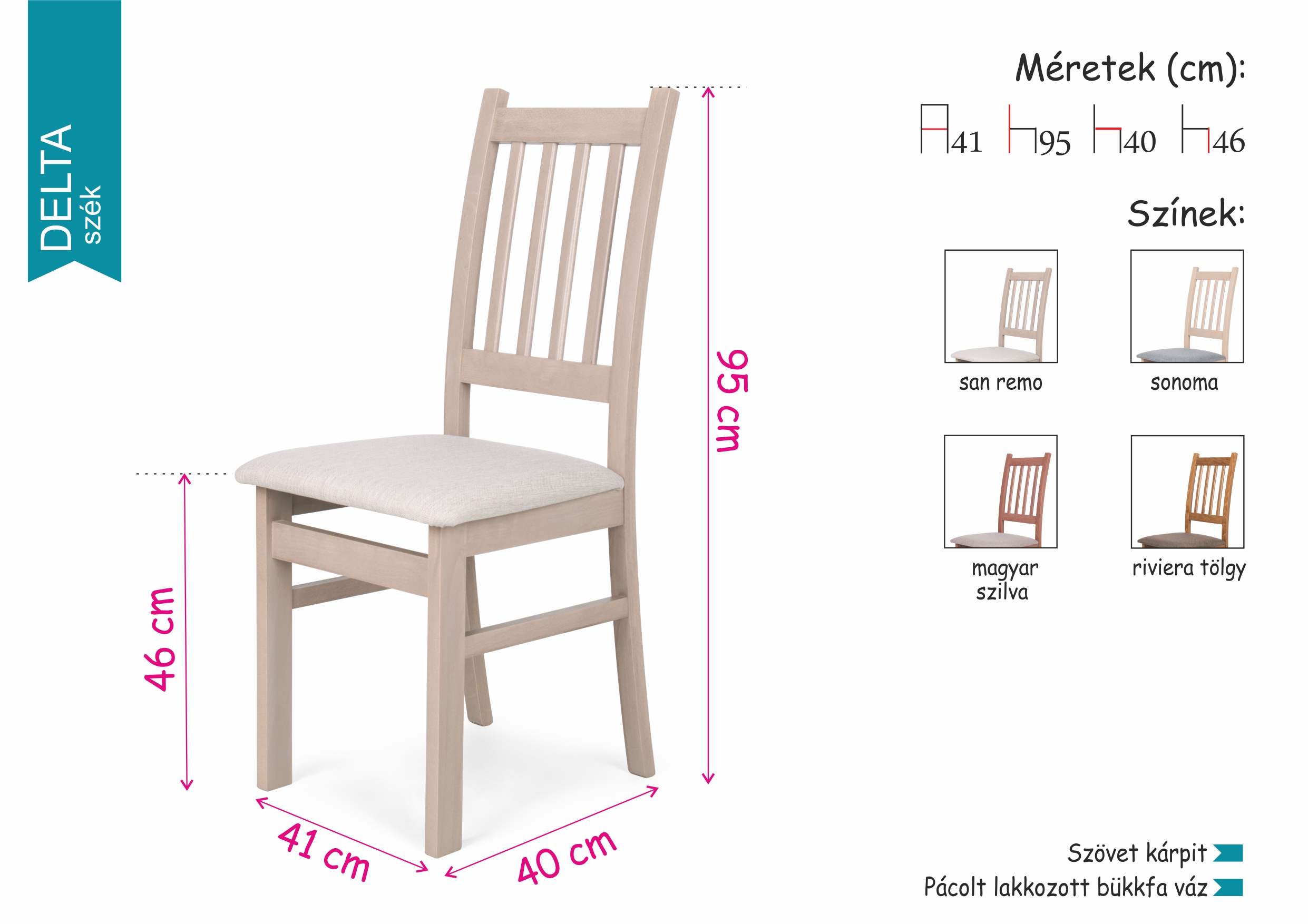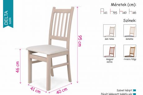 A Delta szék a klasszikus, hagyományos stílust és formákat kedvelőknek tökéletes választás lehet, legyen szó konyháról vagy akár étkezőről. A pácolt, lakkozott bükkfa váz négy különbőző árnyalatban áll rendelkezésre - magyar szilva, riviéra tölgy, san remo és sonoma - , melyet jó minőségű, kopásálló szövet kárpitozás egészít ki.
