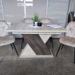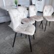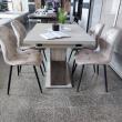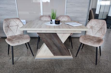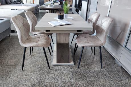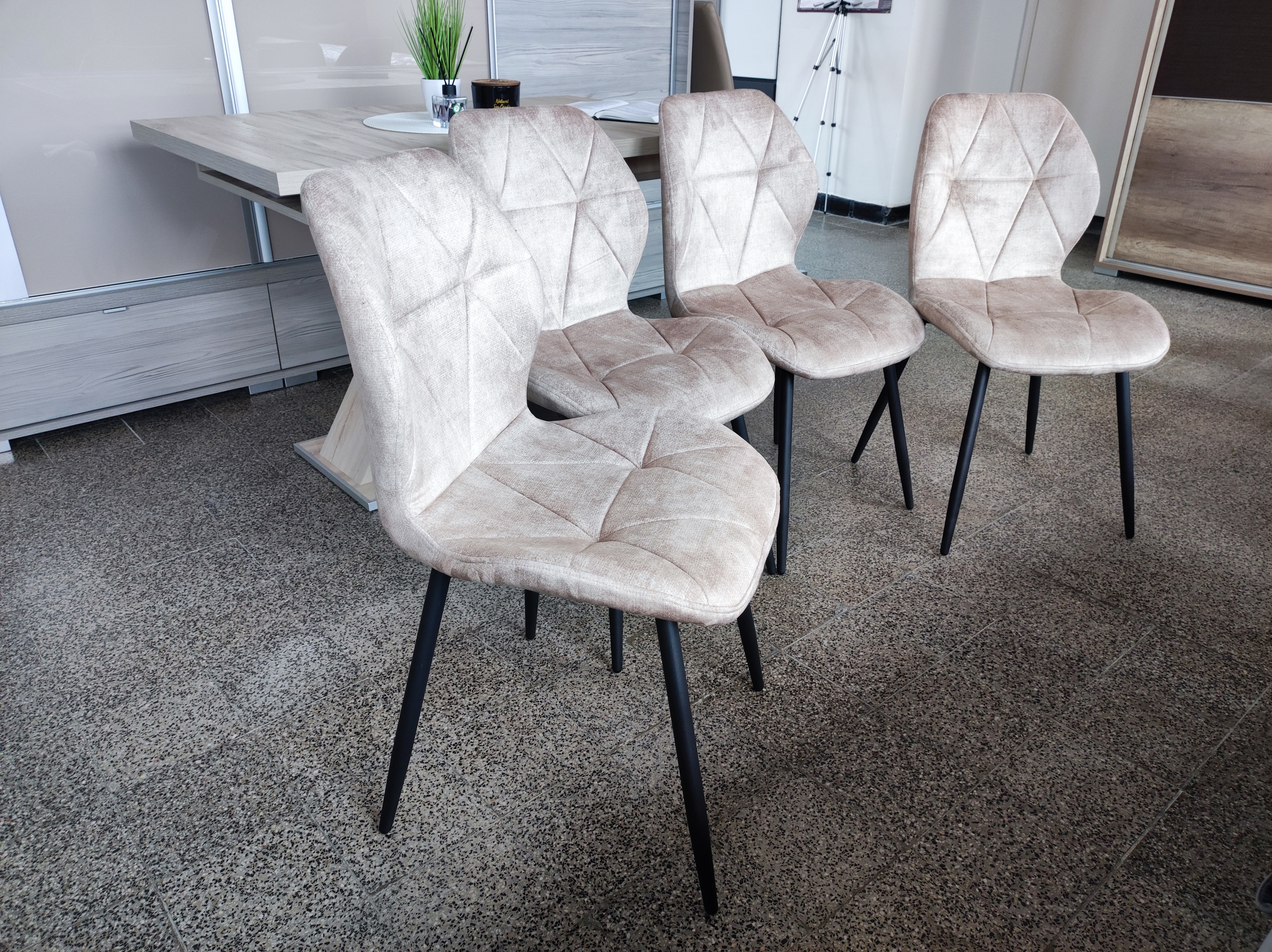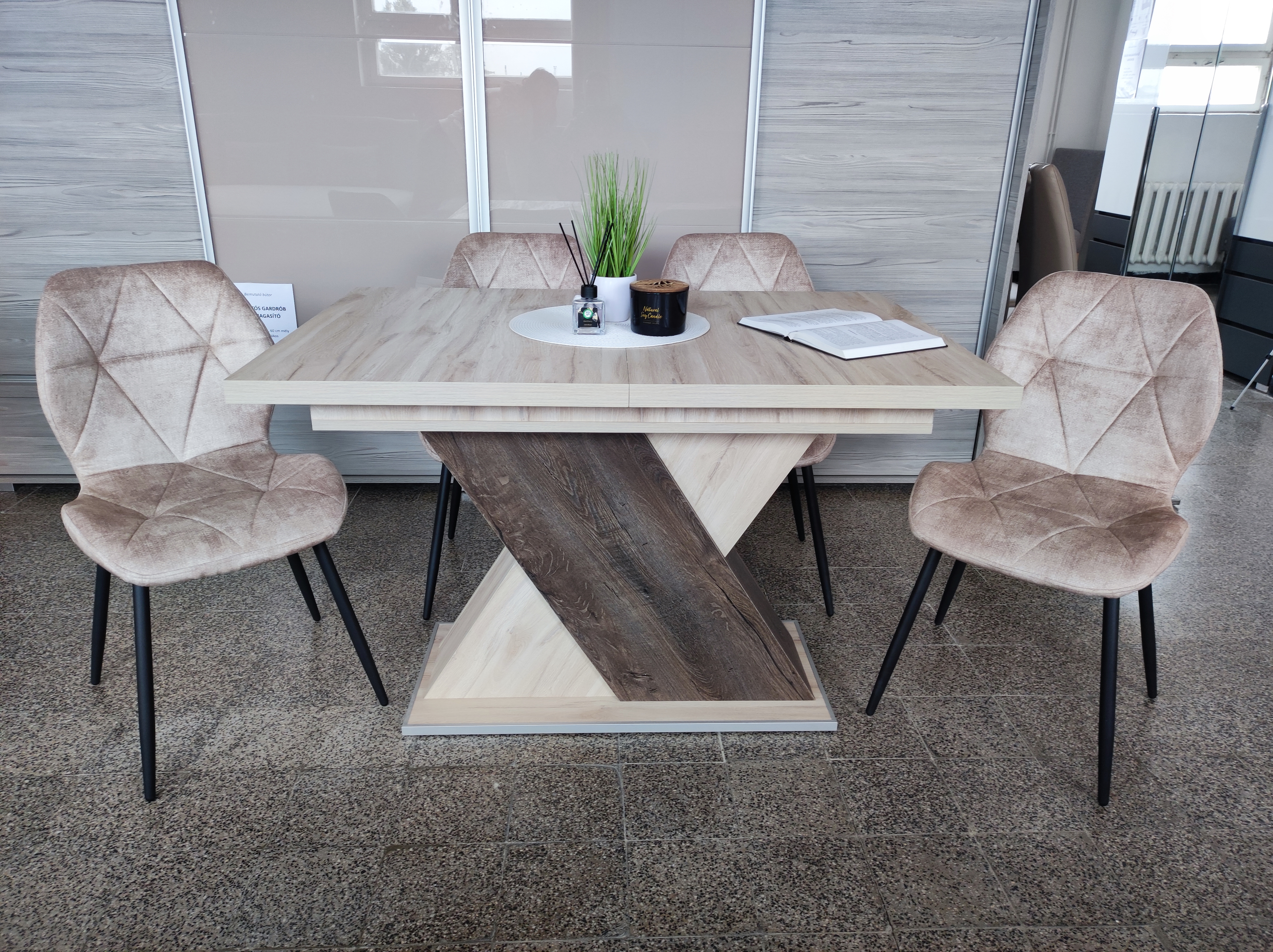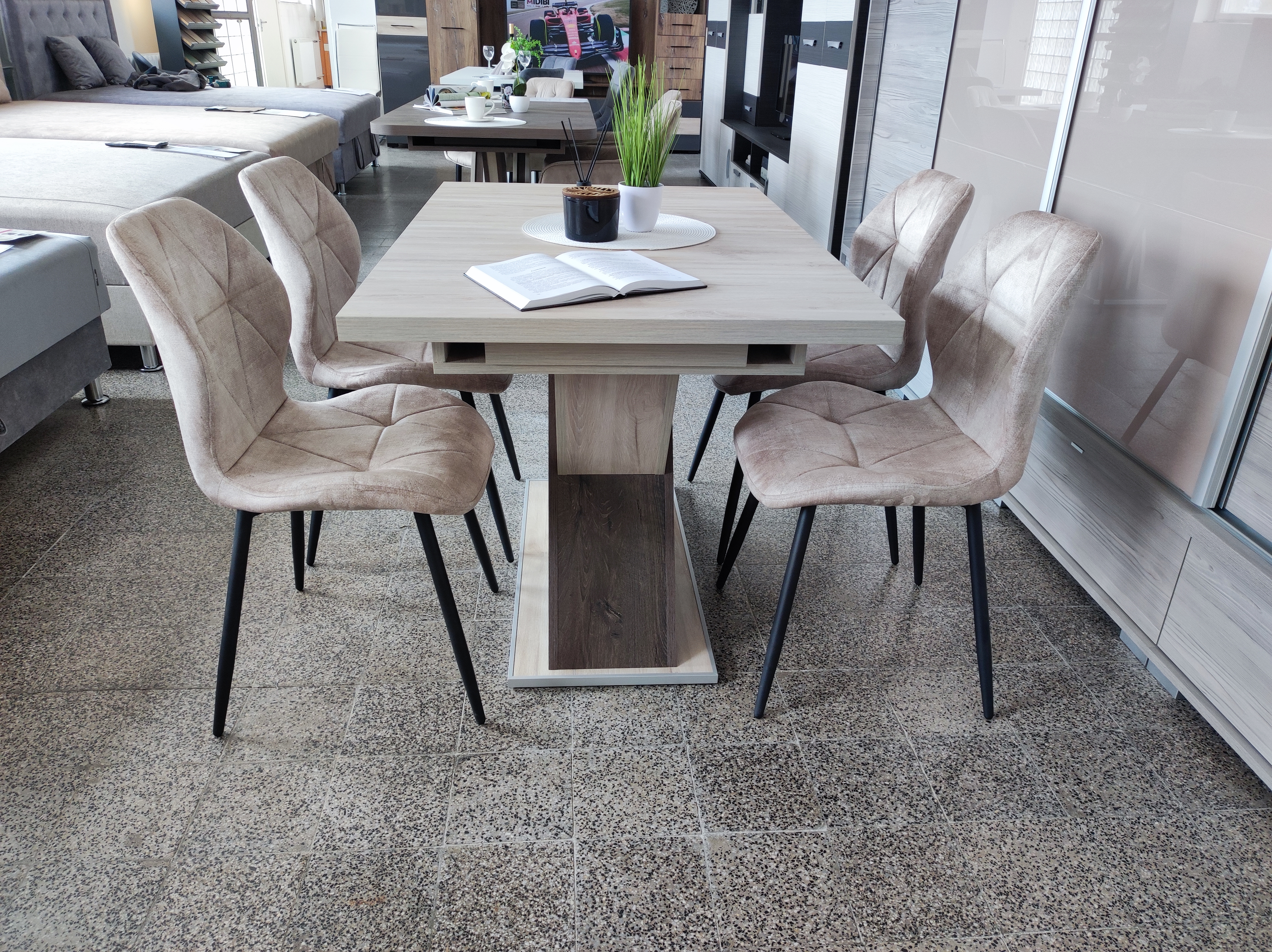 Az asztal 4 db beige szövet kárpitozású Vanda székkel egészül ki, mely különleges formájával igazán izgalmas megjelenést ad a színben harmonizáló asztalnak. Az étkezőgarnitúra ideális választás azoknak, akik a stílusos, modern darabokat részesítik előnyben.