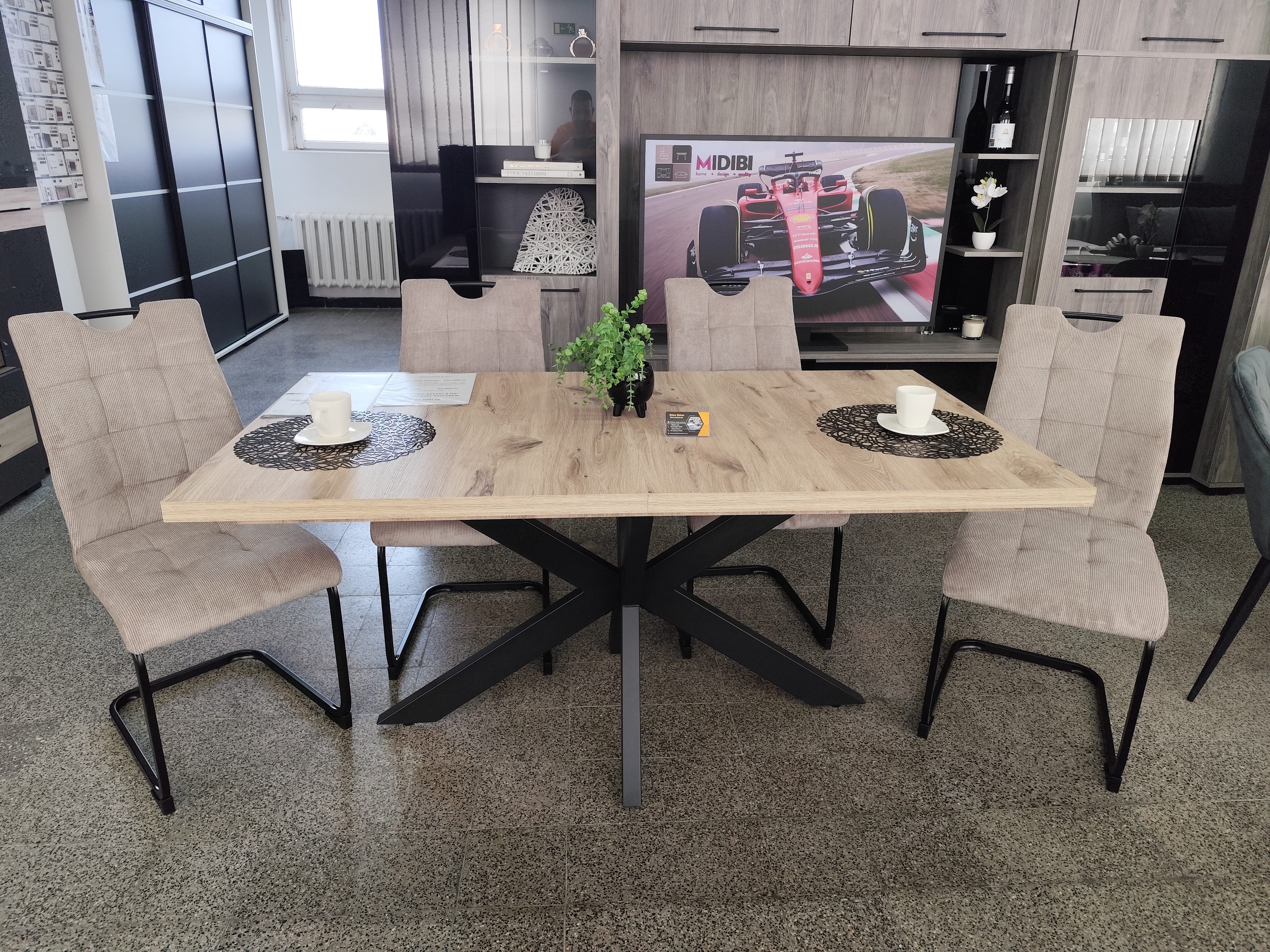 Az asztal 4 db Bruno székkel egészül ki, mely fekete porfestett fém lábával, beige színű kápitozásával kiválóan passzol a Dorothy asztalhoz. Az étkezőgarnitúra ideális választás azoknak, akik az időtálló és egyben stílusos darabokat részesítik előnyben.