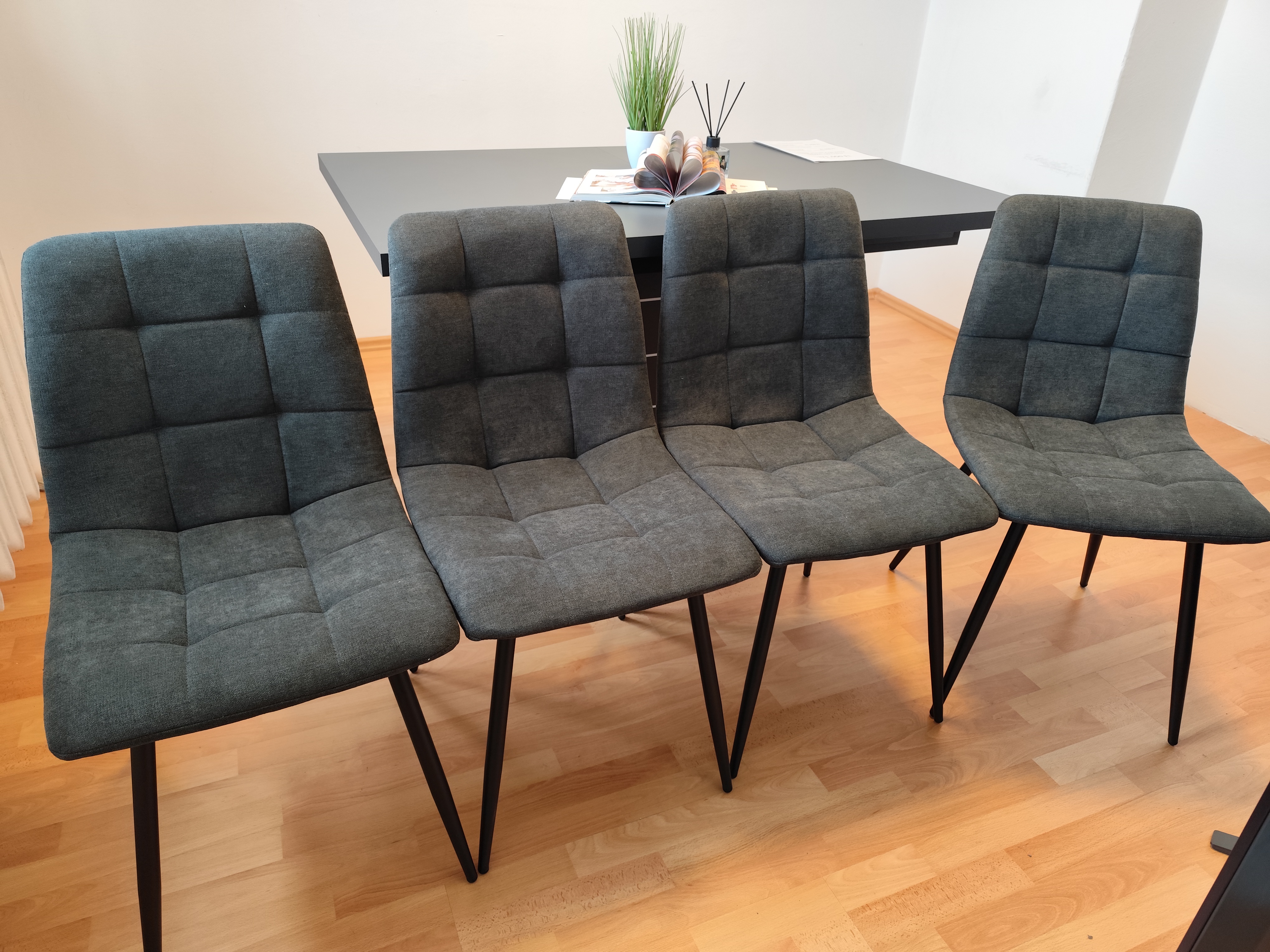 Az asztal 4 db Kamil székkel egészül ki, mely fekete porfestett fém lábával, szürke színű kárpitozásával kiválóan passzol a Dorothy asztalhaoz. Az étkezőgarnitúra ideális választás azoknak, akik az időtálló és egyben stílusos darabokat részesítik előnyben.