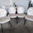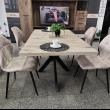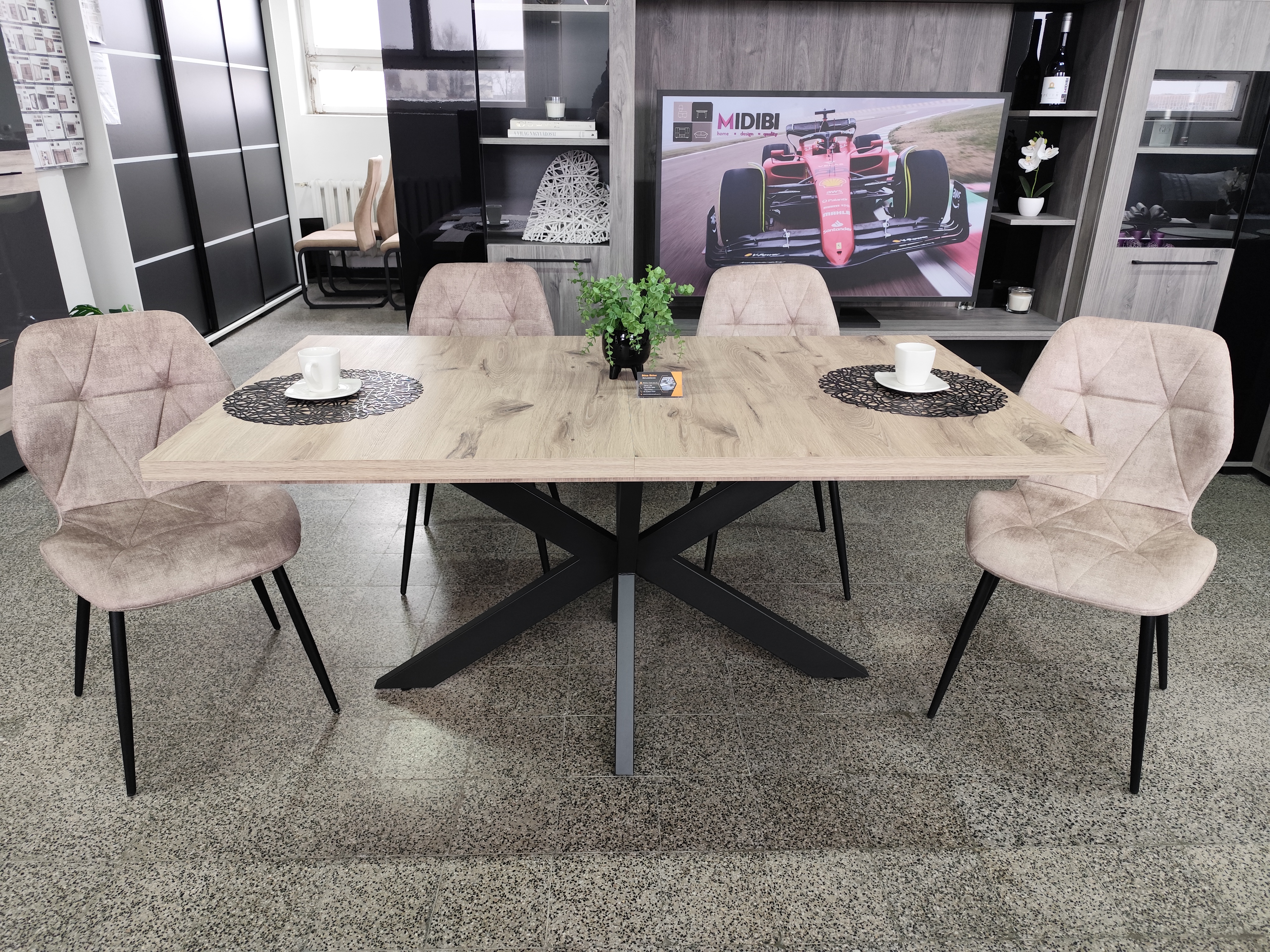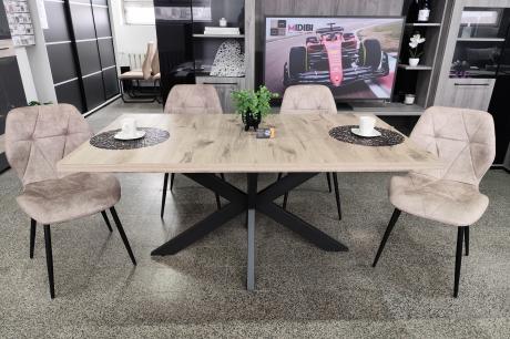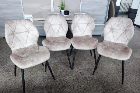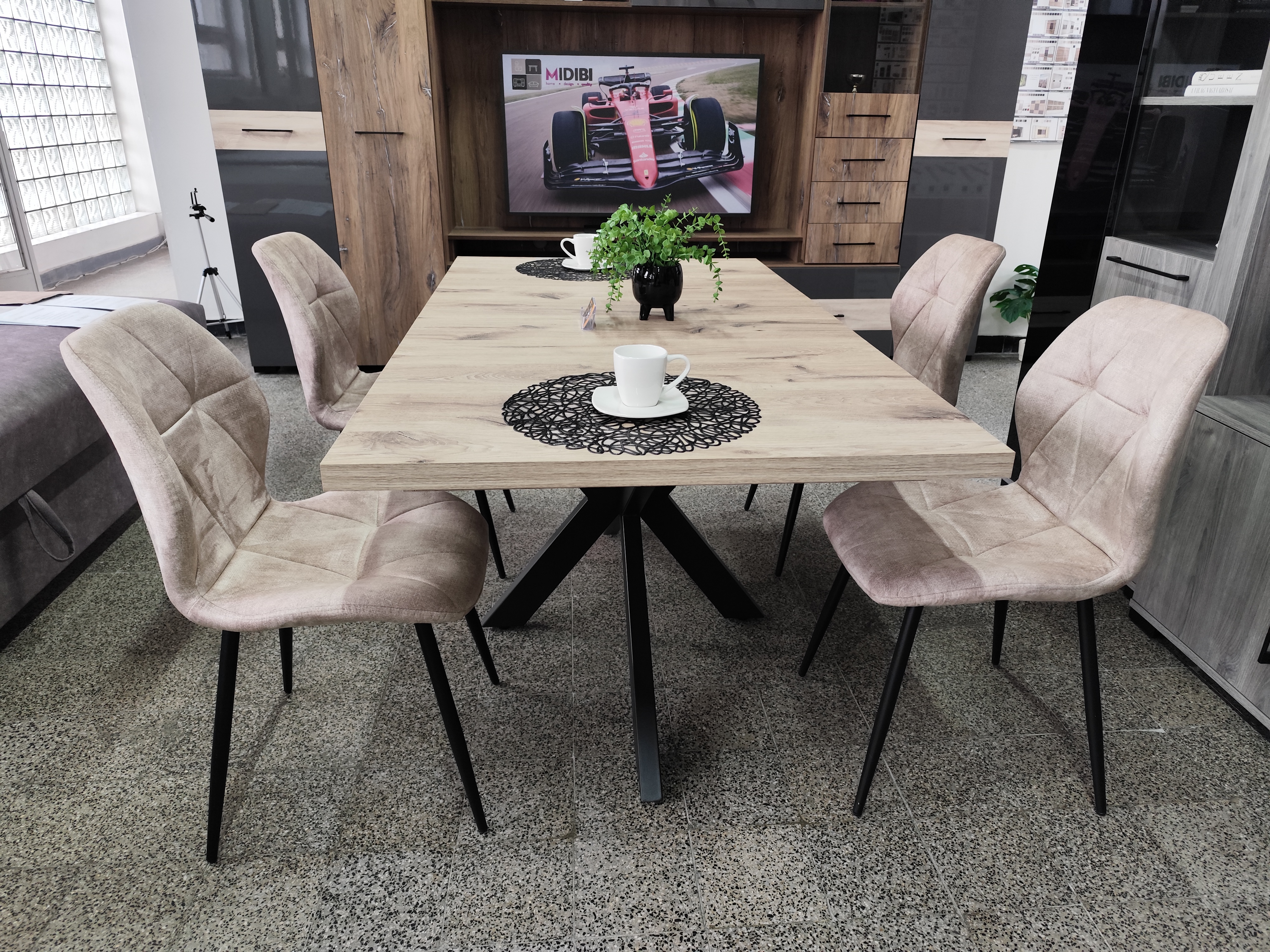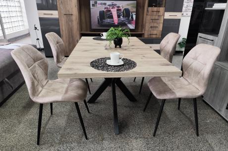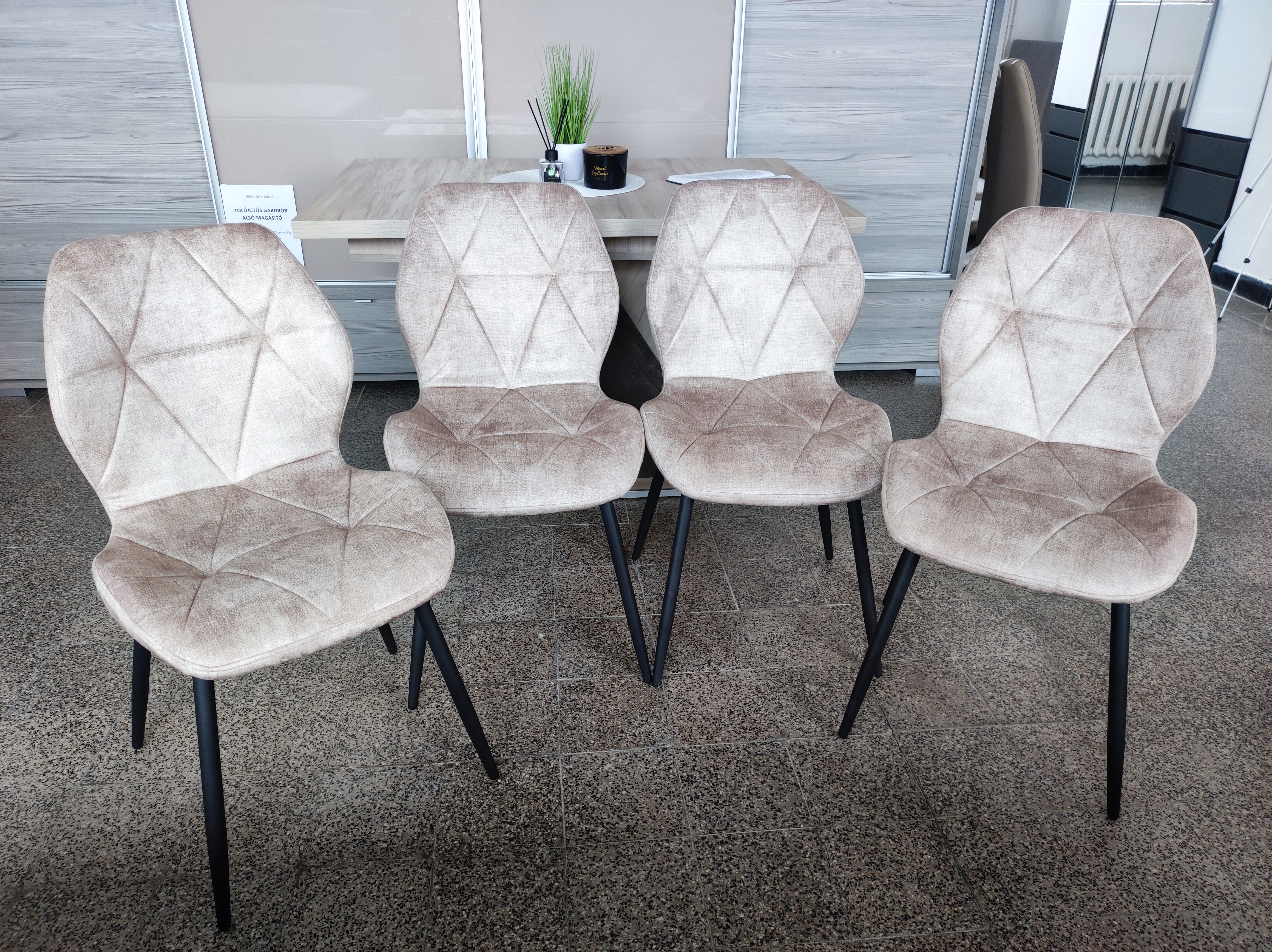 Az asztal 4 db beige szövet kárpitozású Vanda székkel egészül ki, mely különleges formájával igazán izgalmas megjelenést ad a színben harmonizáló asztalnak. Az étkezőgarnitúra ideális választás azoknak, akik a stílusos, modern darabokat részesítik előnyben.