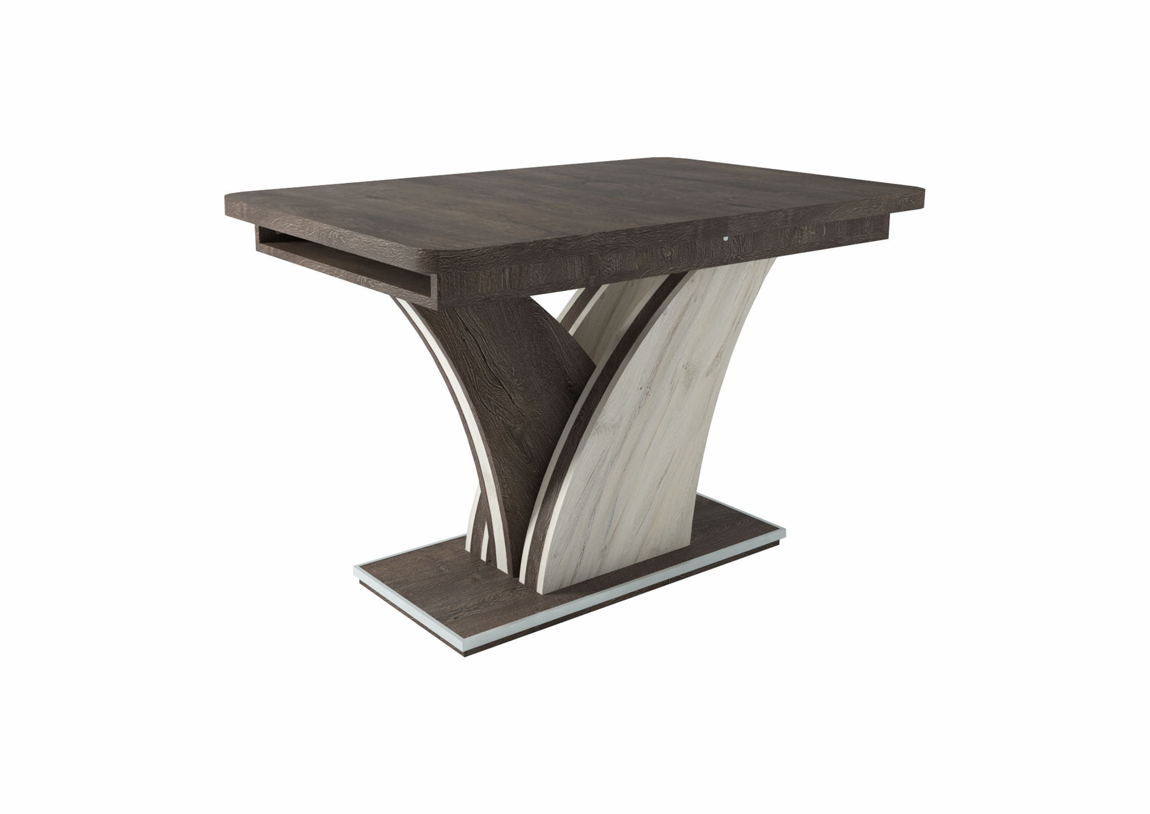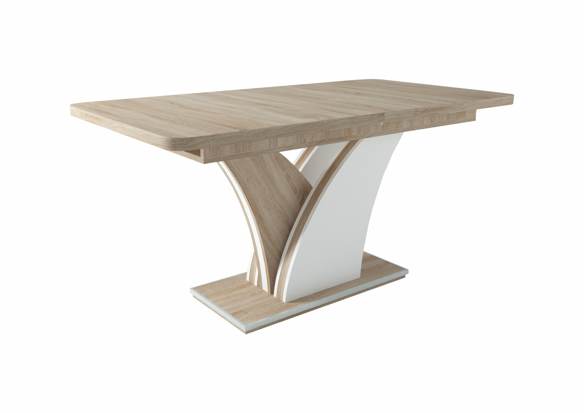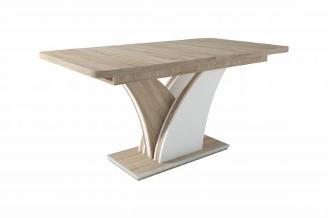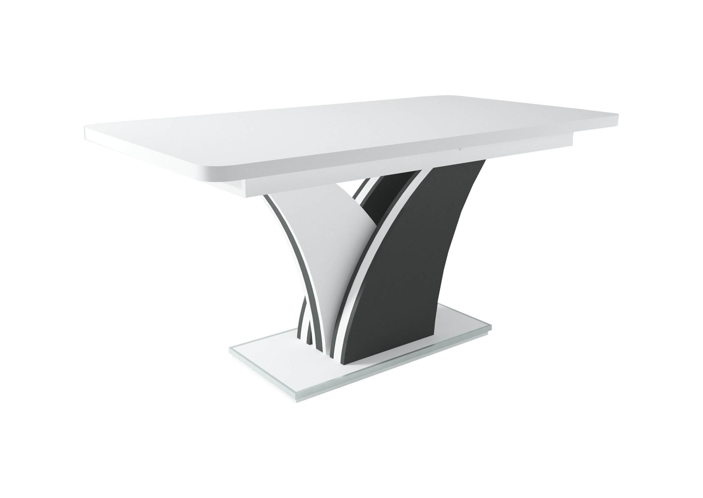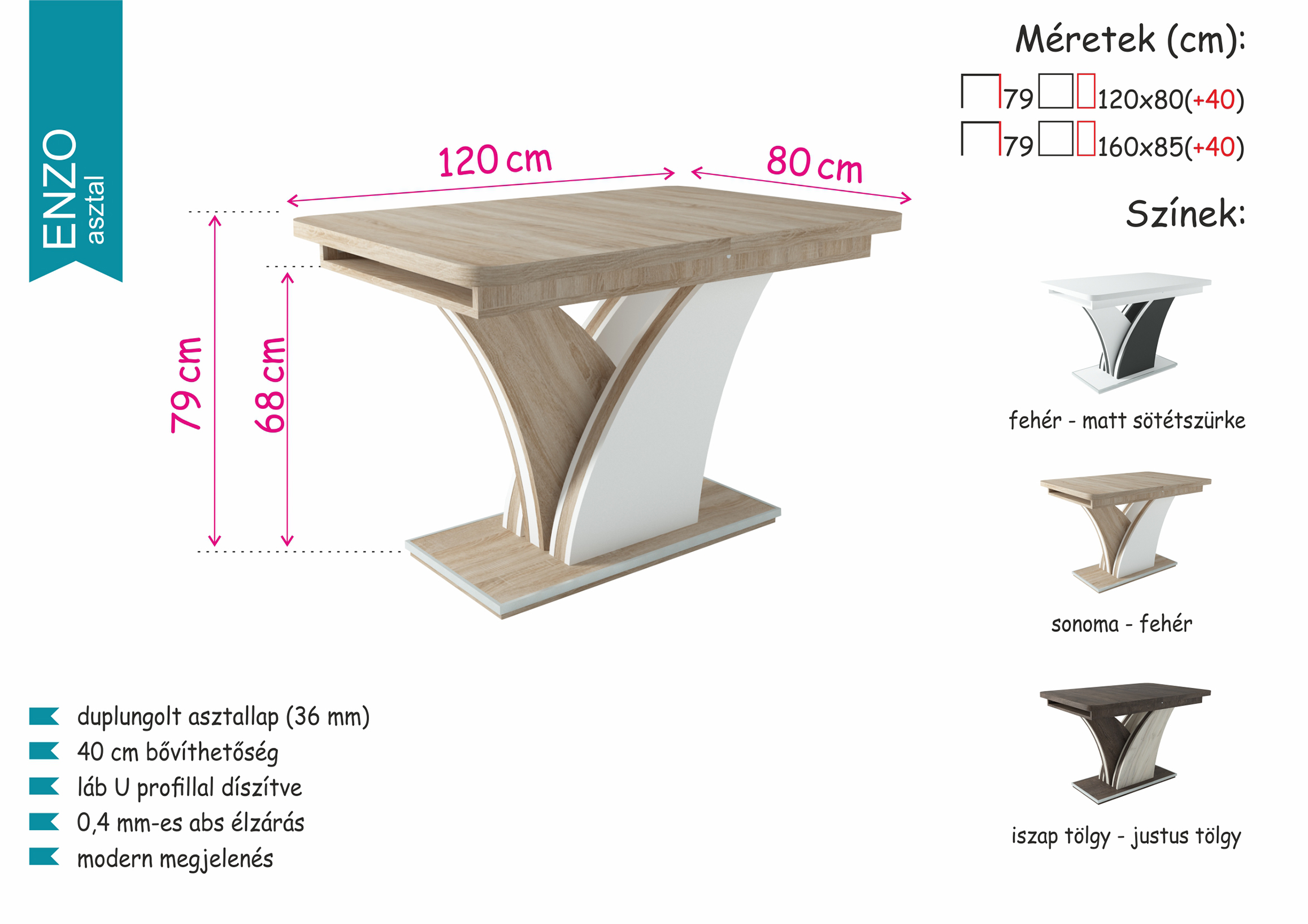 Ha trendi étkezőre vágyik az Enzo asztal igazán jó választás. Modern forma és kontrasztos színkombinációk jellemzik a terméket. 3 színkombináció közül választhatunk: fehér - matt sötétszürke, iszap tölgy - justus tölgy és sonoma tölgy - fehér. Az asztal 120 és 160 cm-es méretben rendelhető, mely vendégek fogadása esetén +40 cm-rel bővíthető.