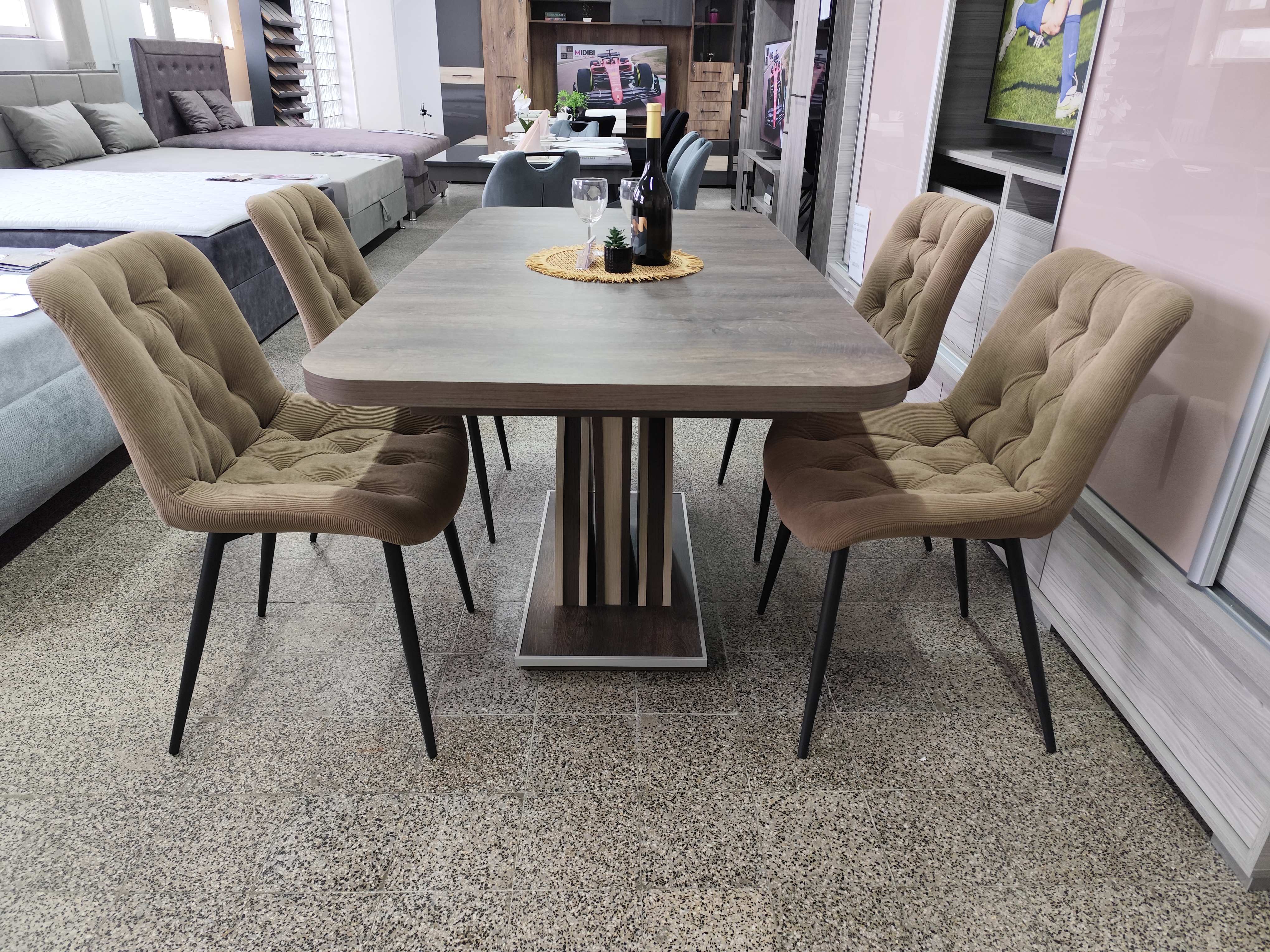 Az asztal 4 db barna színű Korina székkel egészül ki, amit szövet kárpit és fekete porfestett láb jellemzi, valamint egyedi formájának és kényelmes ülőfelületének köszönhetően kiválóan passzol az asztalhoz.