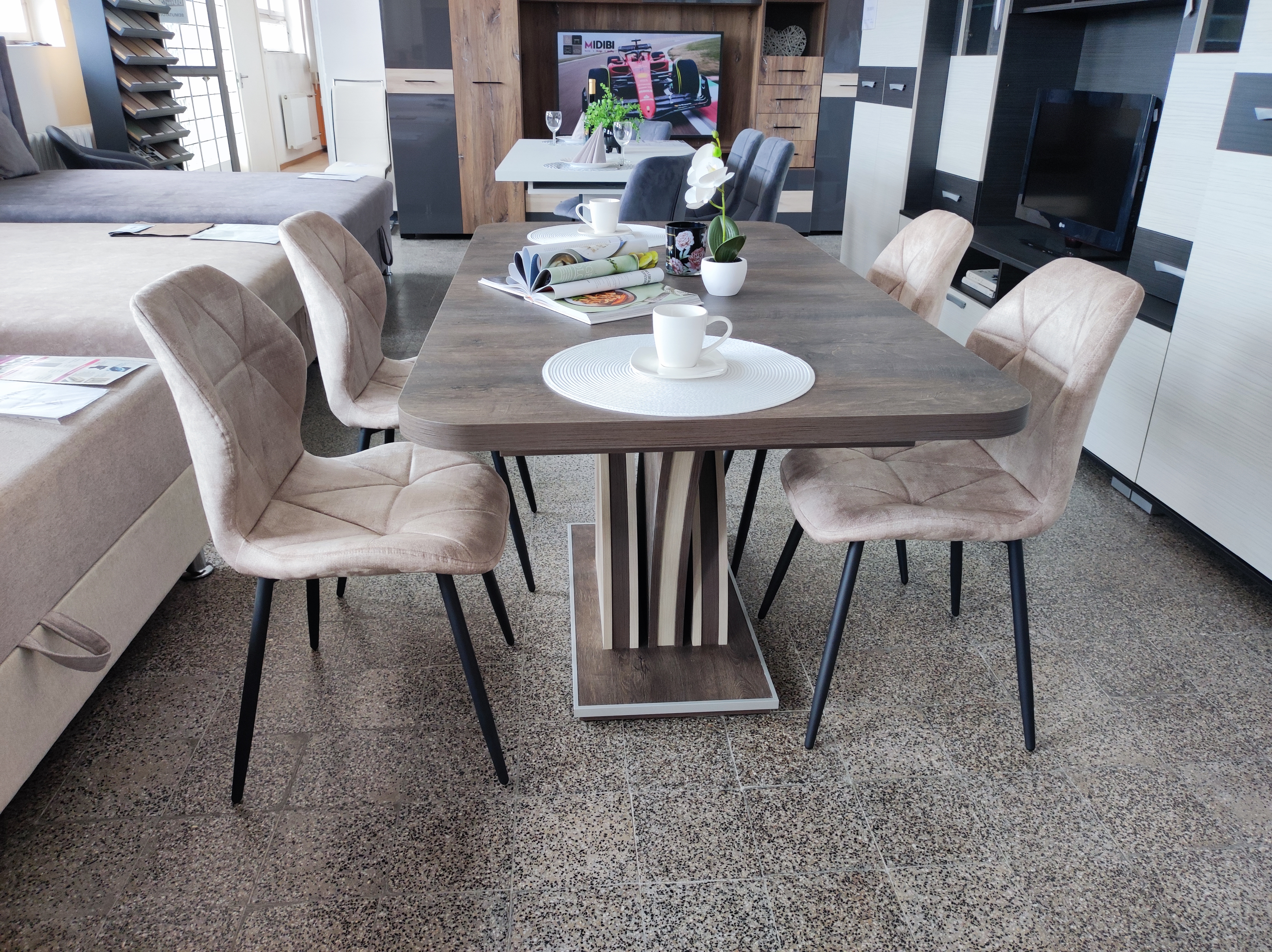 Az asztal 4 Vanda székkel egészül ki, mely fekete festett lábával, különleges szövet kápitozásával, valamint visszafogott, letisztult színével kiválóan passzol az asztalhoz. Az étkezőgarnitúra ideális választás azoknak, akik az időtálló és egyben stílusos darabokat részesítik előnyben.