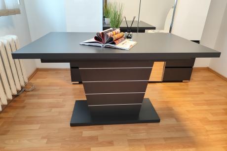 Ha trendi étkezőre vágyik a Fanni asztal modern, egyedi formavilágával igazán jó választás lehet. Matt sötétszürke színe pedig fehér fehér csíkozással egészül ki a lábon, mely nagyon mutatóssá teszi a bútort. Bemutatótermünkben 135x80 cm-es méretben tekinthető meg, mely plusz 40 cm-rel toldható, ami vendégek fogadása esetén kimondottan praktikus lehet.