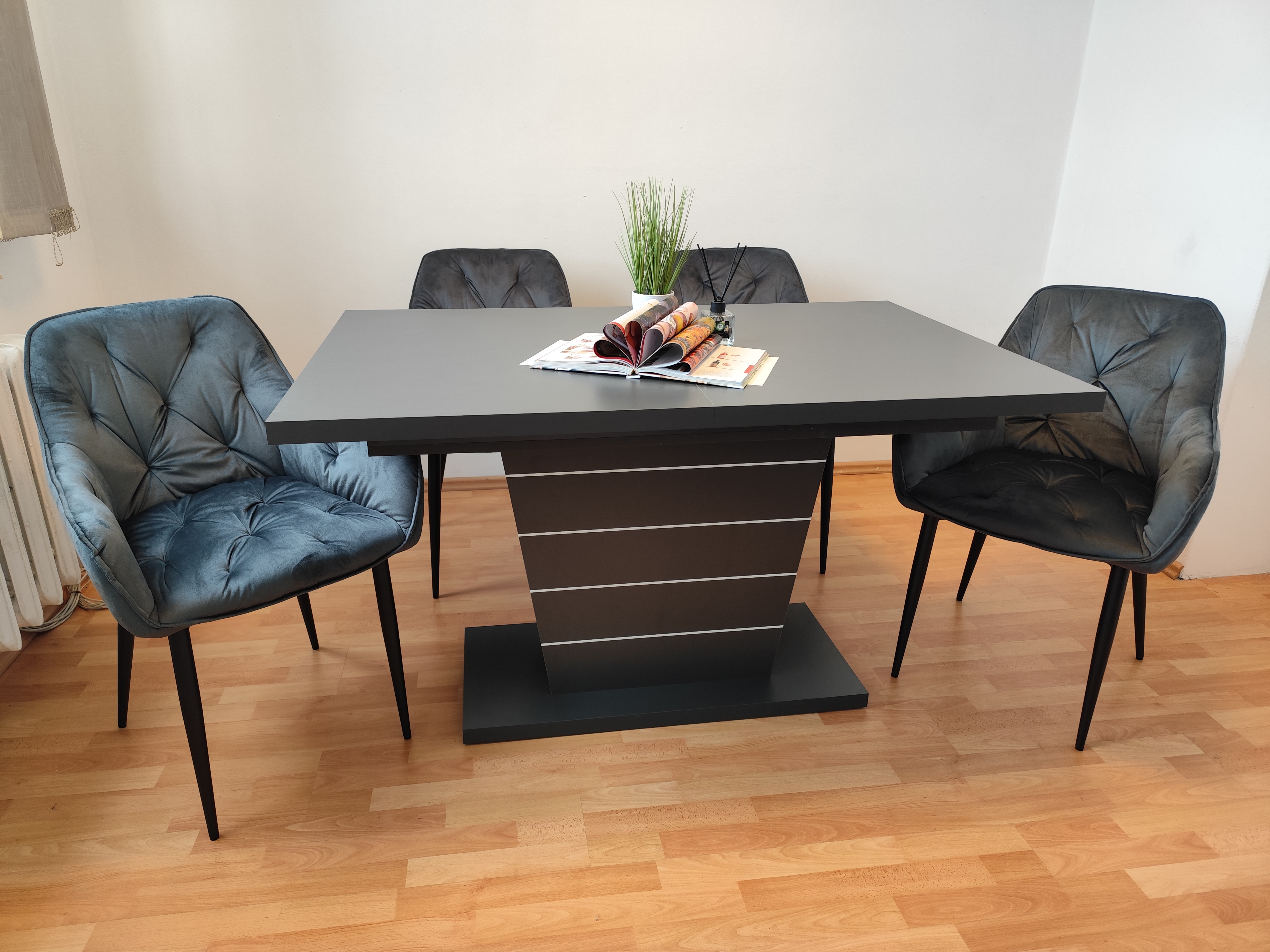 Az asztal 4 db Noel székkel egészül ki, mely fekete festett lábával, plüss, steppelt kápitozásával, grafit színével kiválóan passzol az asztalhoz. Az étkezőgarnitúra ideális választás azoknak, akik az időtálló és egyben stílusos darabokat részesítik előnyben.