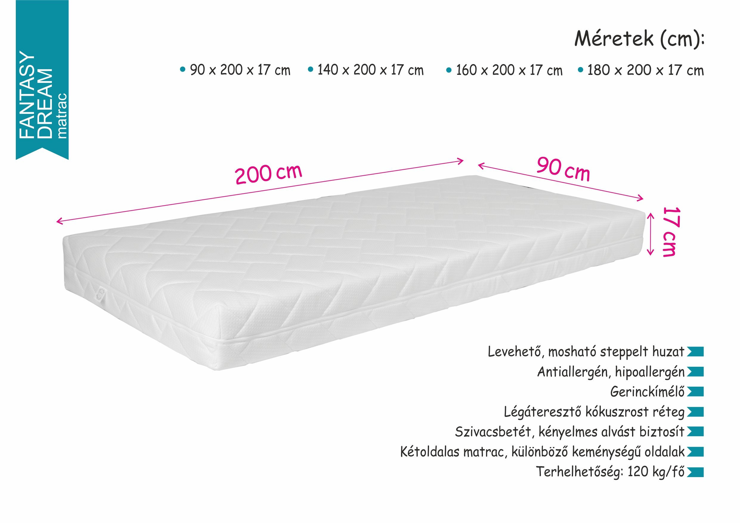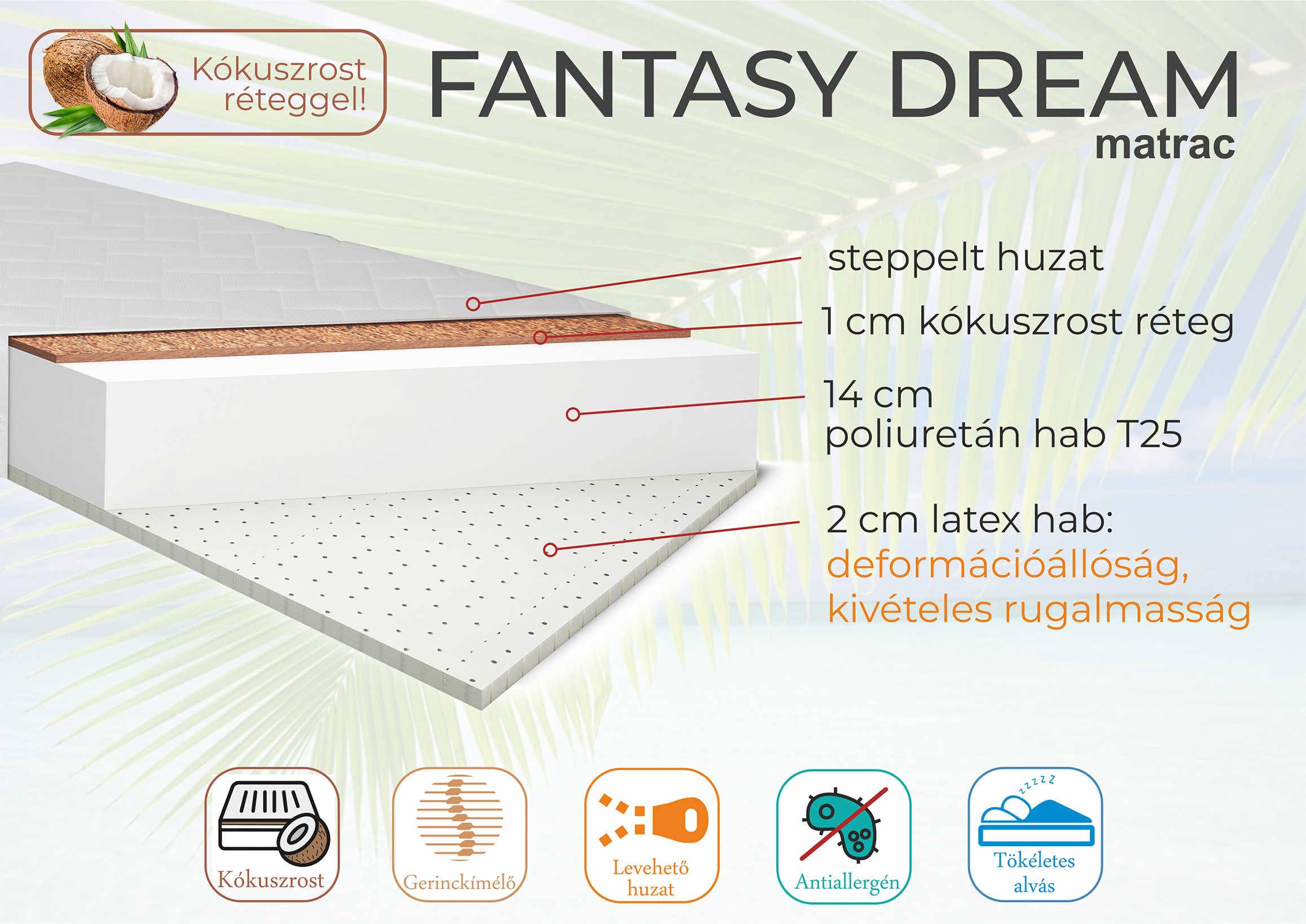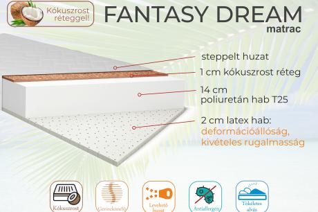 A Fantasy Dream matrac jellegzetességét a légáteresztő kókuszrost réteg adja. Gerinckímélő kialakításának köszönhetően minőségi alvást biztosít. A kétoldalas matrac, különböző keménységű oldalakkal rendelkezik. Levehető, mosható steppelt huzat borítja a matracot, melynek agyaga kellemes tapintású, puha és tartós is egyben.