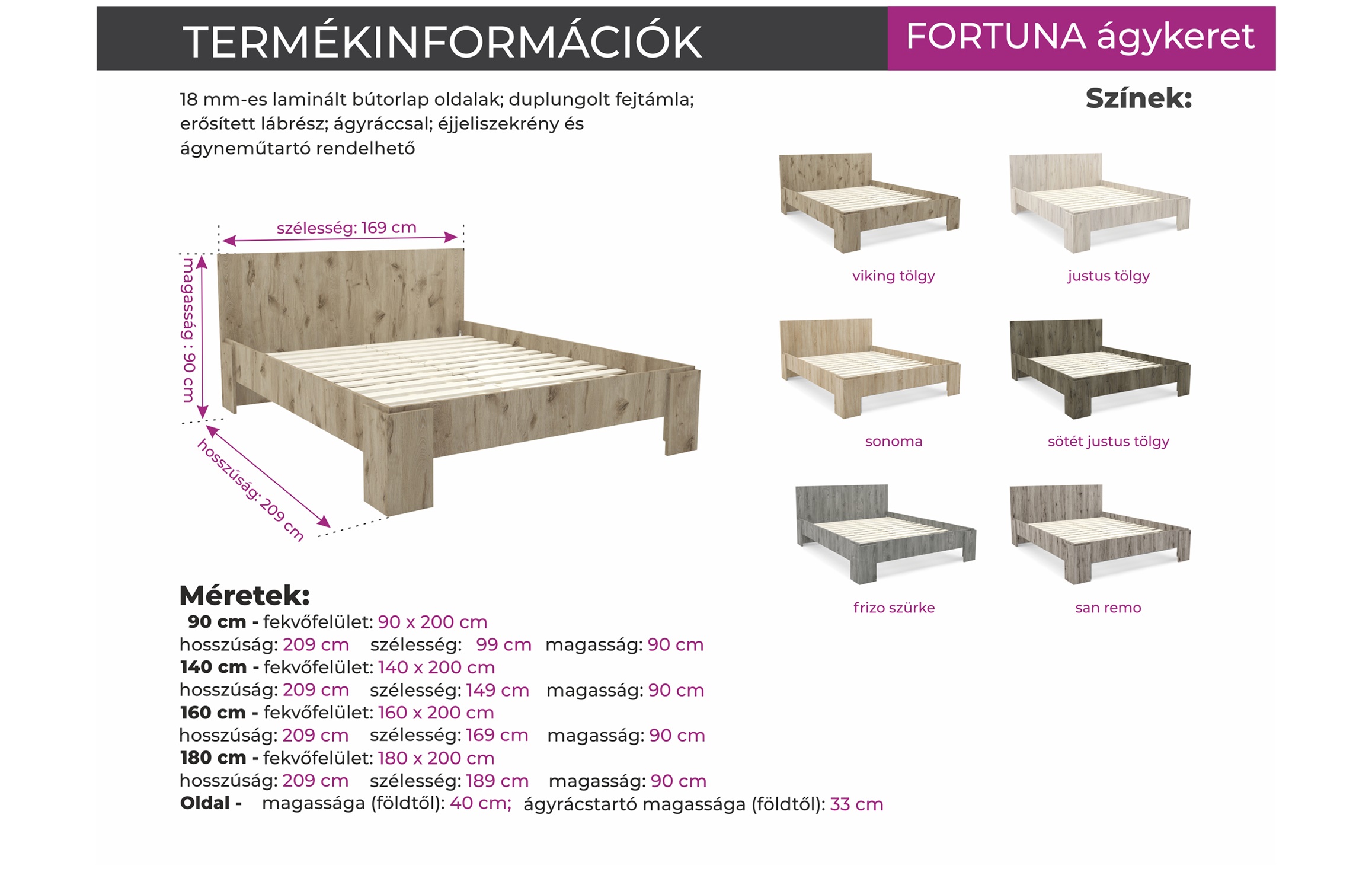 A Fortuna ágykeret 18 mm-es laminált bútorlap oldalakkal, duplungolt fejvéggel készült. A duplungolt bútorlap a termék tartósságát növeli, és esztétikailag is kellemes megjelenést kölcsönöz. Rendkívül nagy színválasztékának köszönhetően könnyedén található a hálószoba berendezéséhez illő darab. Az ágykeret négy féle méretben választható és az ár az ágyrácsot is tartalmazza.. Az ágykerethez kiegészítésként ágyneműtartó és matrac külön rendelhető!