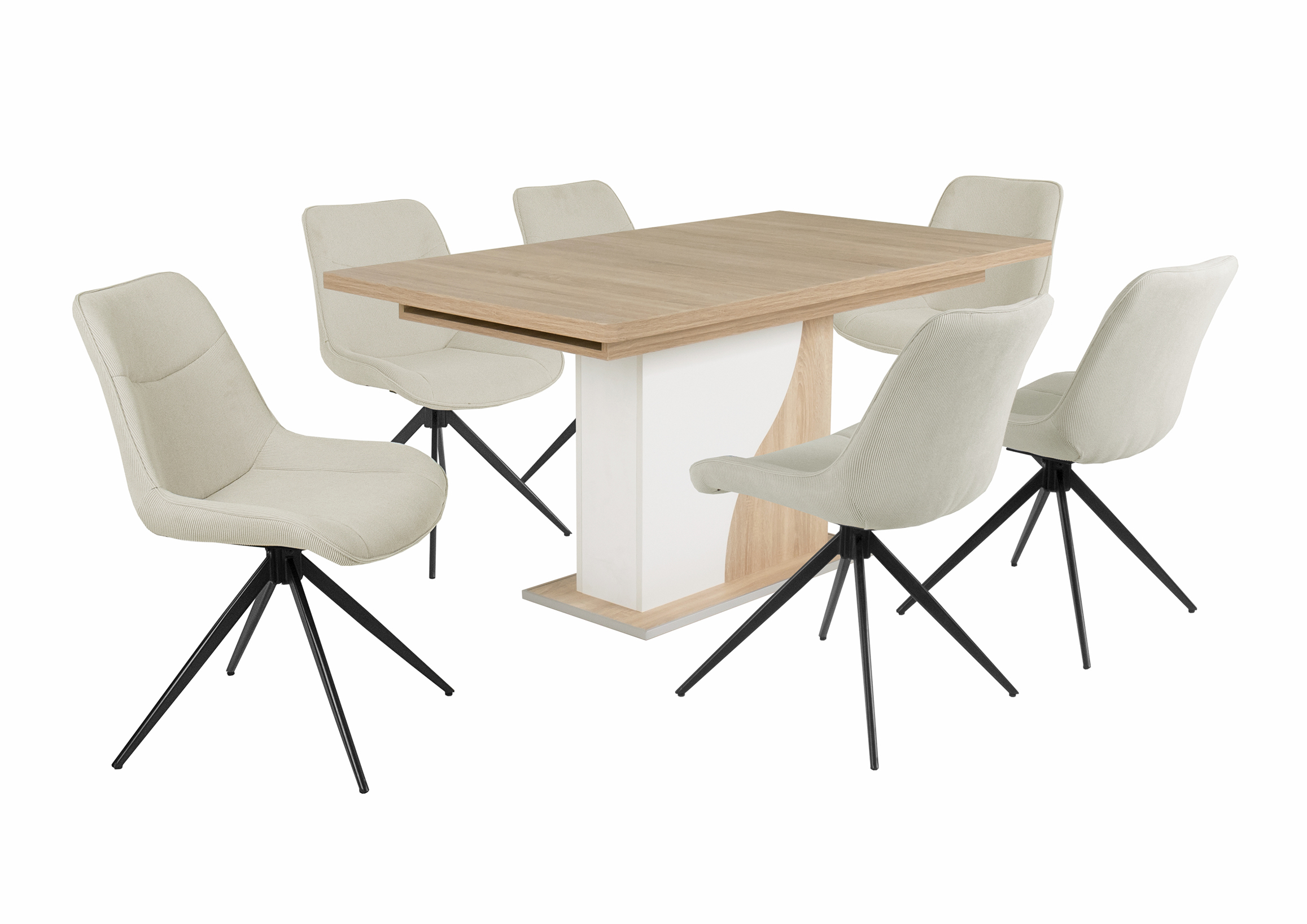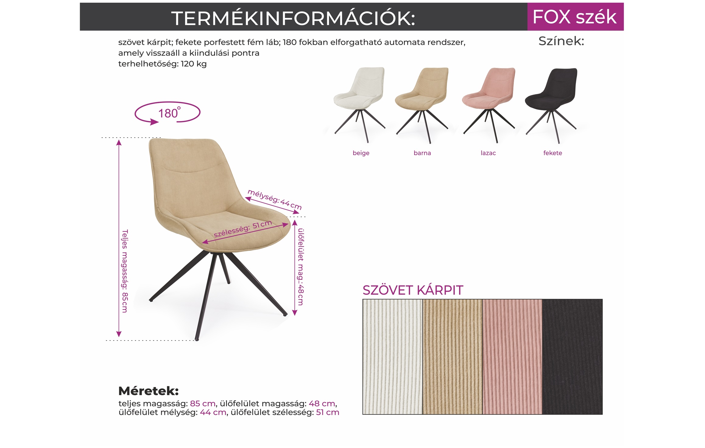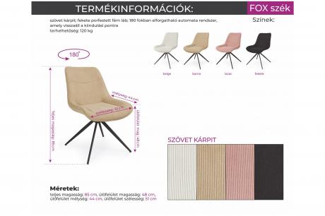 A Fox szék a modern étkezők tökéletes kiegészítőja. 4 színben elérhető: beige, barna, lazac és fekete. Kordbársony kárpittal és fekete porfestett fém lábbakkal rendelhető. Különlegessége, hogy 180 fokban elforgatható automata rendszerrel rendelkezik, amely visszaáll a kiindulási helyzetbe, ezzel segítve az asztalhoz való leülést és felállást.