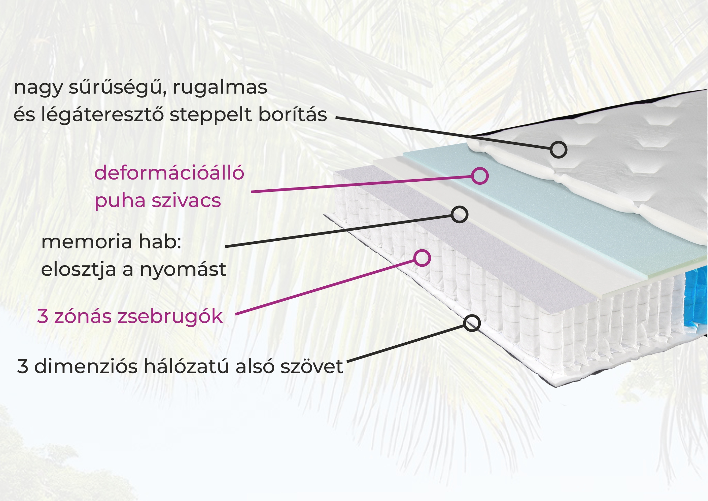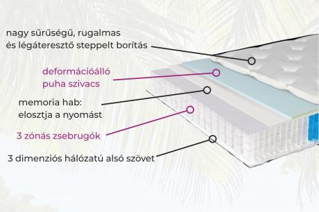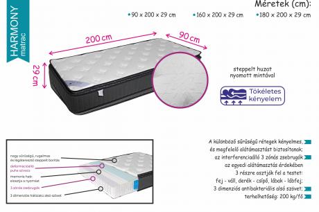 A Harmony matrac különböző sűrűségű rétegei kényelmes, és megfelelő alátámasztást biztosítanak. Az interferenciaálló 3 zónás zsebrugók az egyedi alátámasztás érdekében 3 részre osztják fel a testet: fej – váll, derék – csípő, lábak – lábfej. 3 dimenziós antibakteriális alsó szövettel rendelkezik. Terhelhetőség: 200 kg/fő.