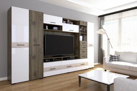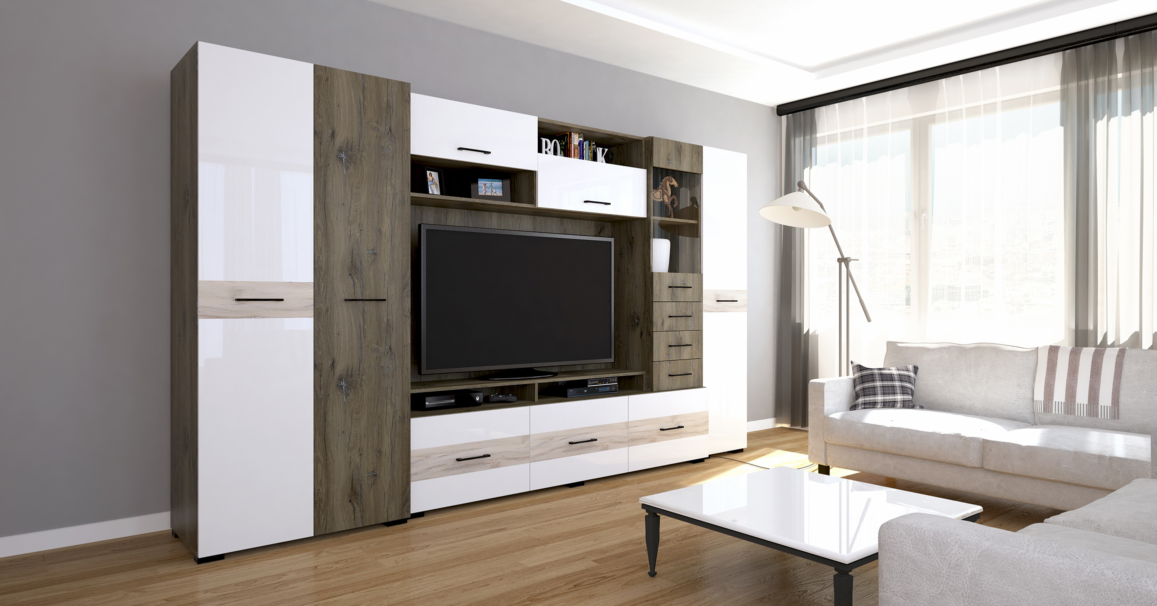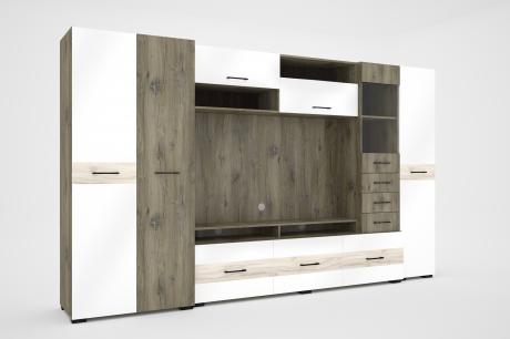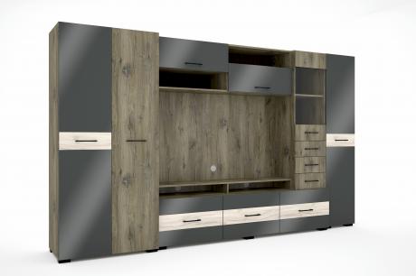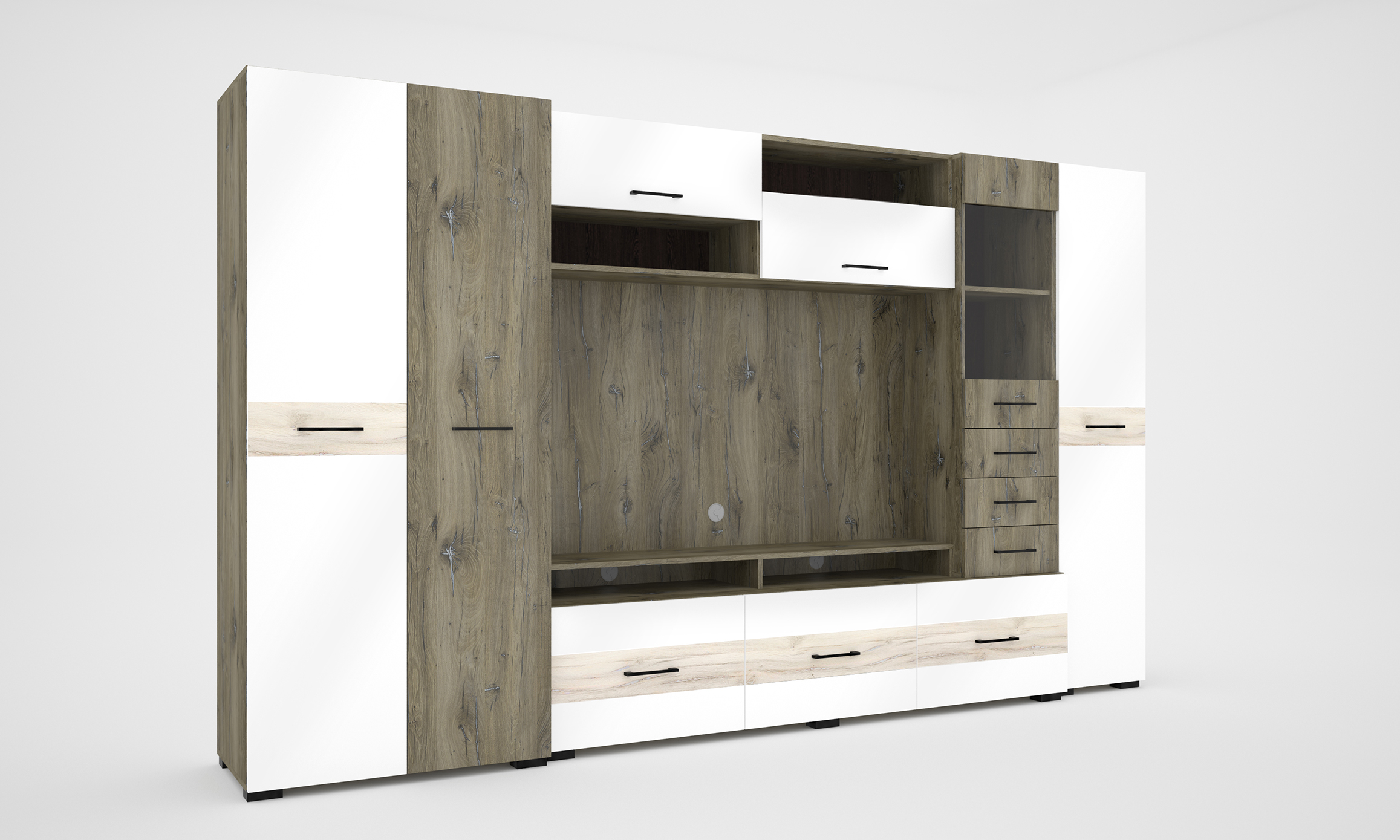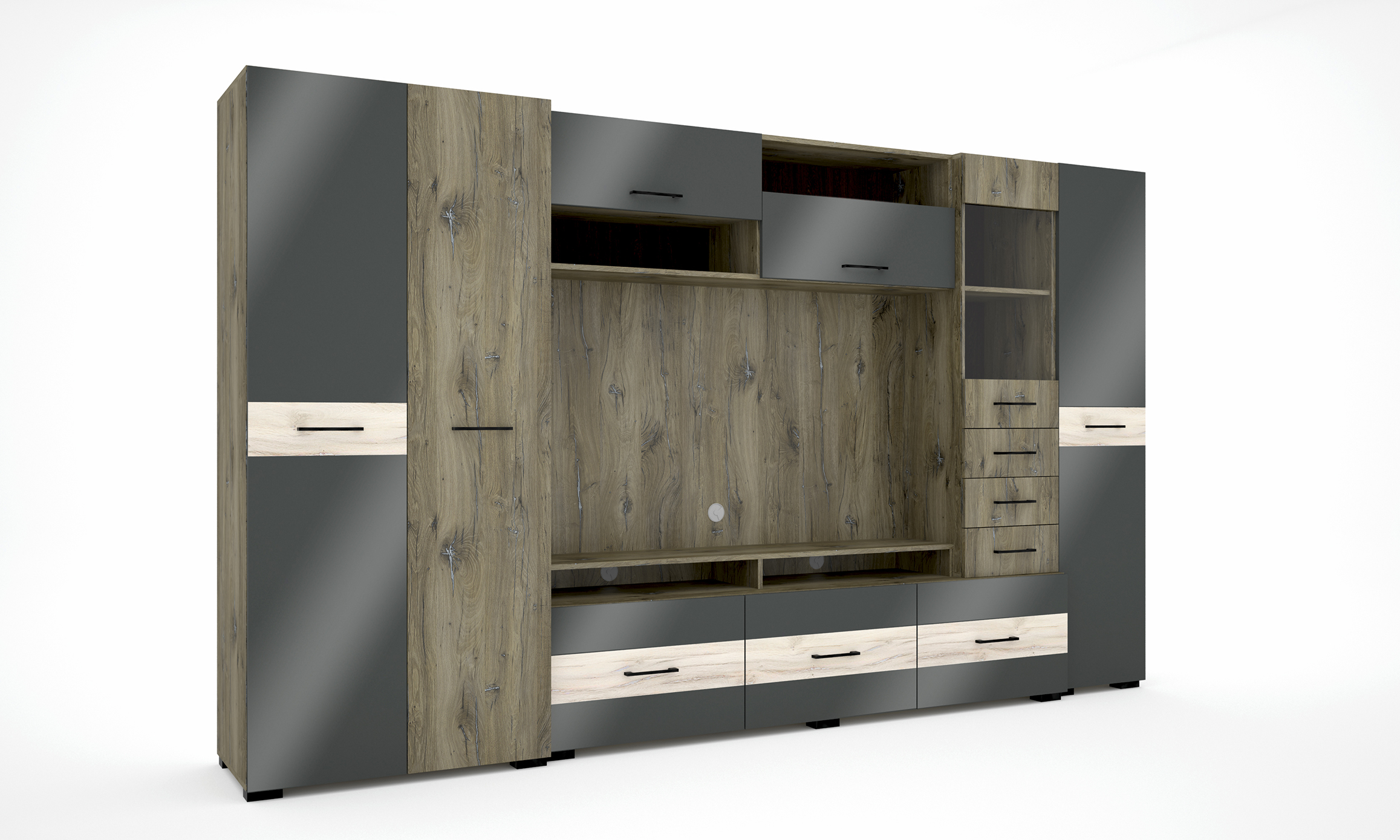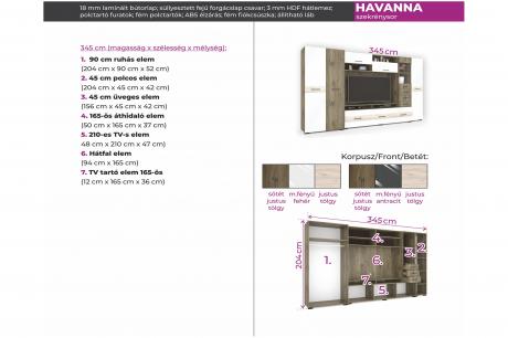 Karakteres, 345 cm-es méretben kapható Havanna szekrénysorunk 3-as színkombinációja különleges megjelenést kölcsönöz nappalijának. A szekrénysor sötét justus tölgy-magasfényű fehér-justus tölgy, valamint sötét justus tölgy-magasfényű antracit-justus tölgy színben rendelhető. A kiválóan pakolható részek, melyek akár plusz polcokkal is kiegészíthetőek, valamint a TV számára kialakított 165 cm hosszú rész, egyaránt a praktikusságot bizonyítják.