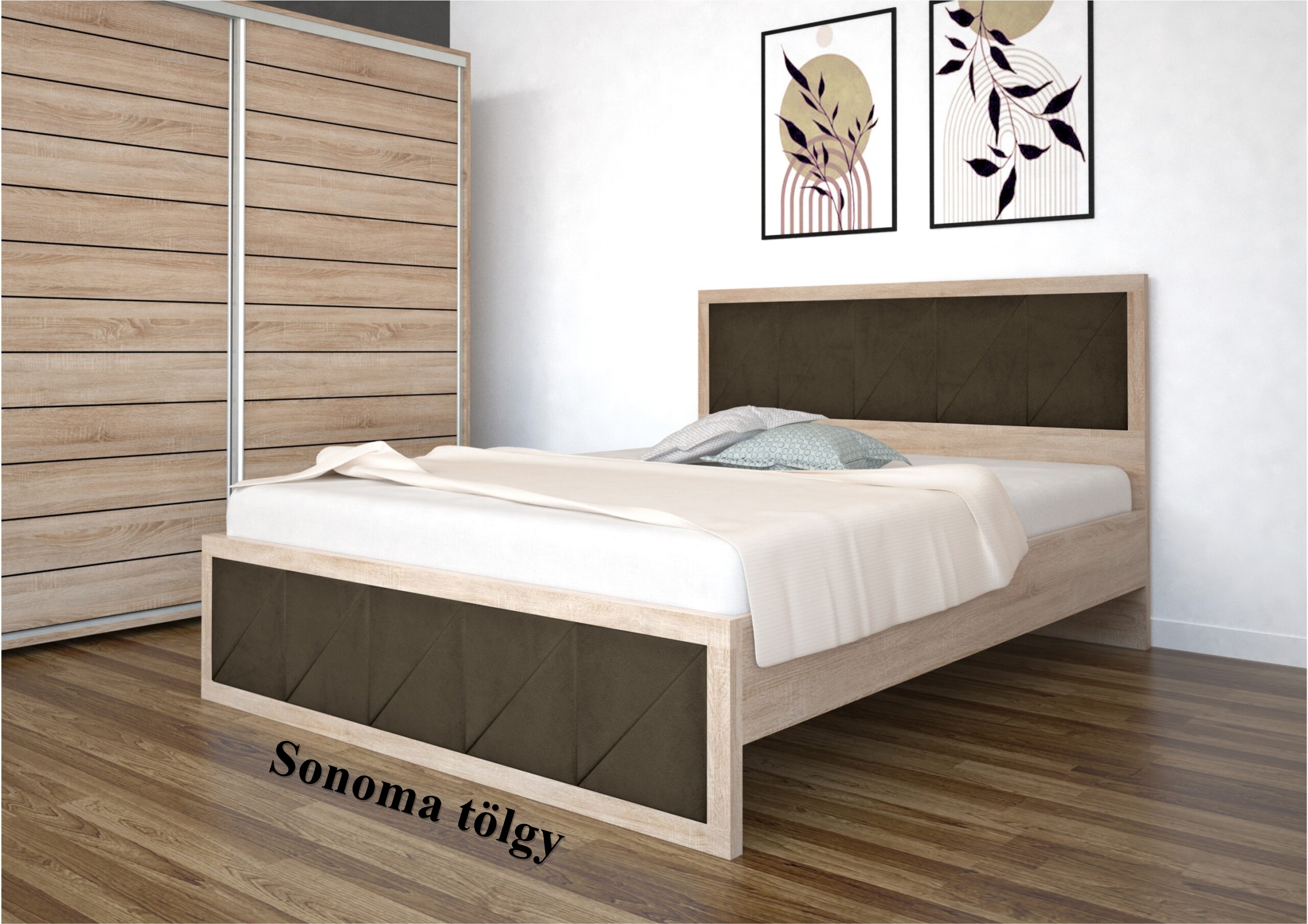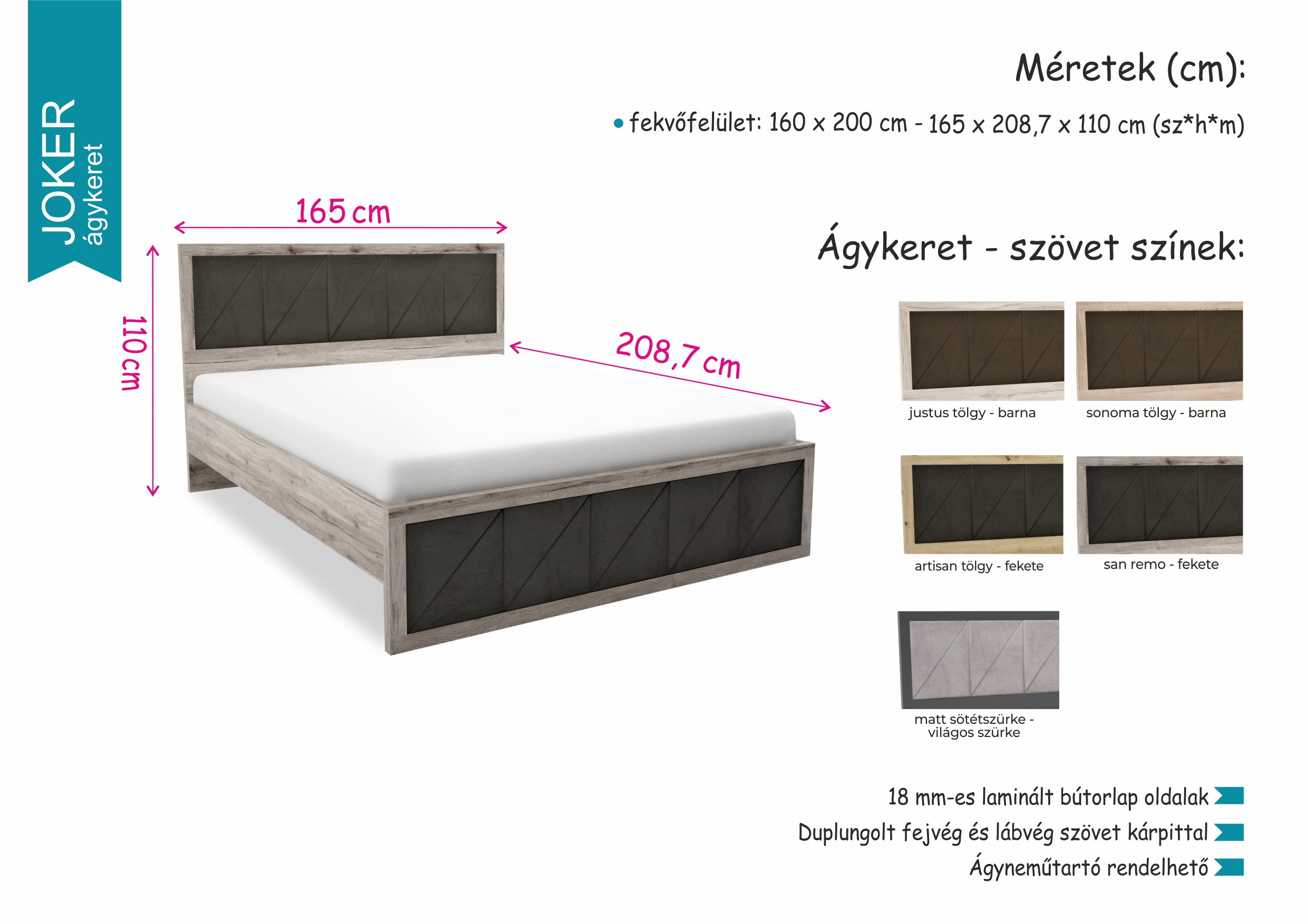 A Joker ágykeret egyedileg kialakított háttámlája karakteres megjelenést ad az egész hálószobának. Bársony hatású formázott támlája nem csak esztétikus, hanem kényelmes is. A lábnál megismétlődő bársony hatású formázott betét egységes és elegáns megjelenést ad az ágykeretnek. A duplungolt bútorlappal készült fej és lábvég a termék tartósságát növeli, és esztétikailag is kellemes megjelenést kölcsönöz. Az ágyat kizárólag 160x200 cm-es méretben és öt közkedvelt színben sonoma, san remo, justus tölgy, artisan tölgy, katthult és matt szürke színekben választható. Az ágykerethez kiegészítésként ágyneműtartó és matrac külön rendelhető!