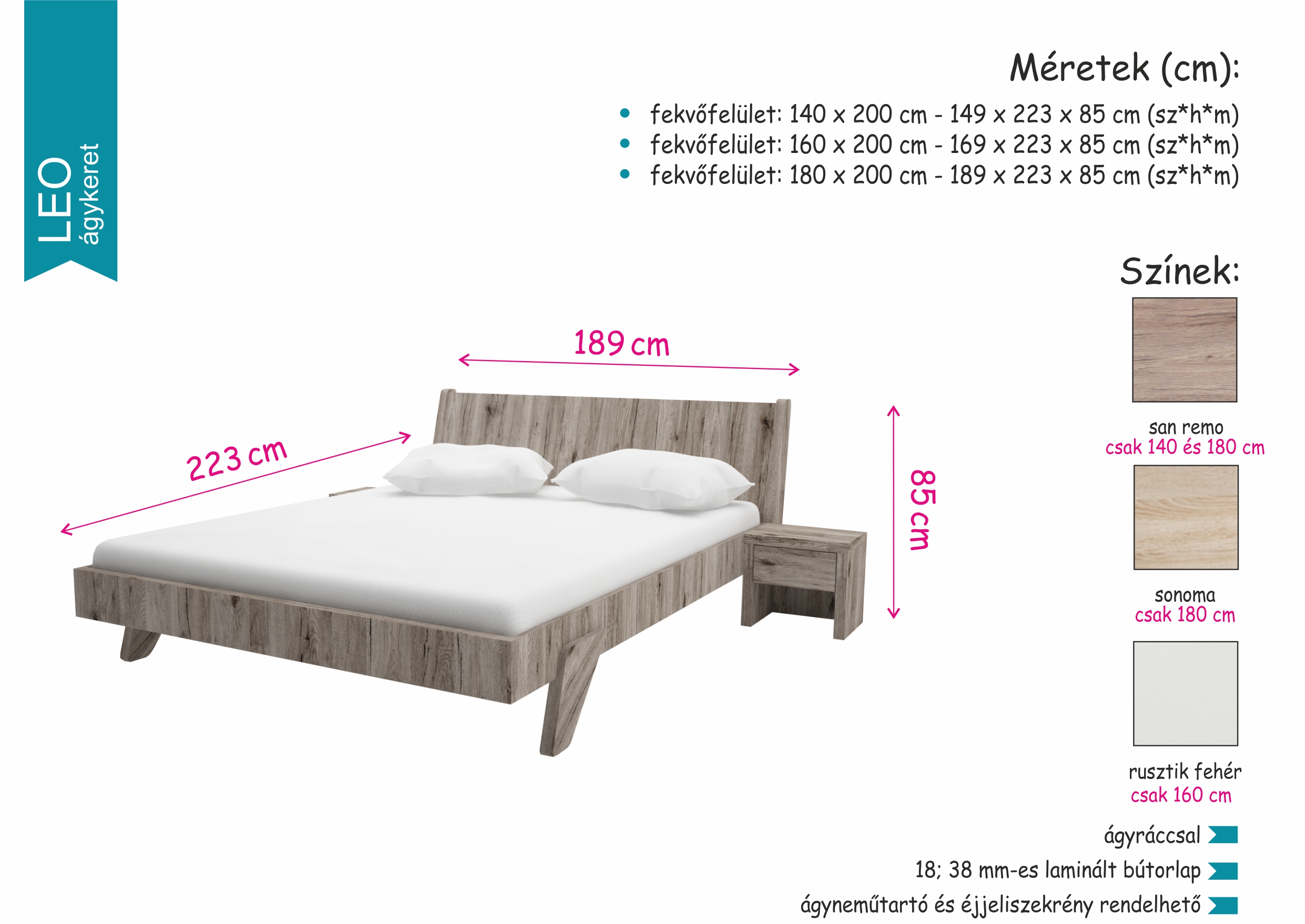 A Leo ágykeretet időtlen és letisztult forma jellemzi. Masszivitását a duplungolt - vastag fejtámla és oldallapok biztosítják. Az ágykeret egyik nagy előnye, hogy az átlagos 160-180 cm széles méreten kivül 140 cm széles méretben is rendelhető. Háromféle szín közül választhatnak, mely otthonuk színeihez igazítható. Az ágykeret ára magába foglalja az ágyrácsot is, azonban a képen látható matrac nem tartozéka. Az ágykerethez kiegészítésként ágyneműtartó és matrac is rendelhető.