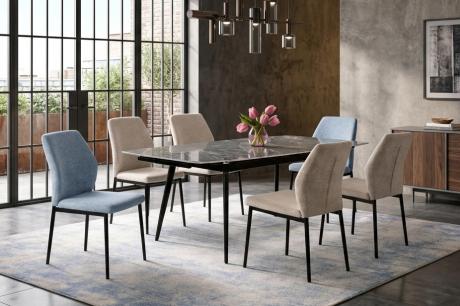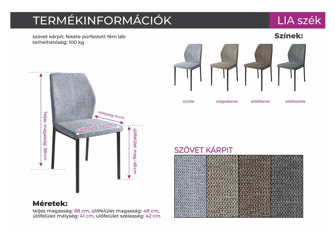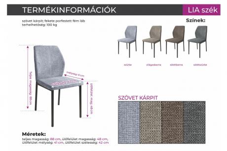 Egyszerű, letisztult vonalvezetés, szövet kárpit és porfestett fekete fém lábak jellemzik a Lia széket. A szék szövetborítása kellemes tapintású és a 4 különböző kárpitszín könnyen beilleszthető bármilyen színvilágú enteriőrbe. Minimalista megjelenésének köszönhetően kiváló választás modern étkezőkbe, irodai tárgyalókba vagy akár fésülködőasztal mellé is.