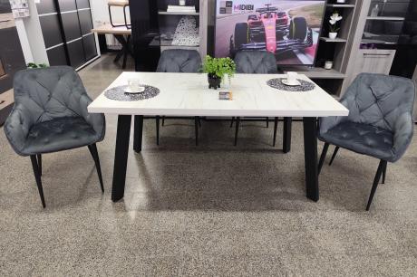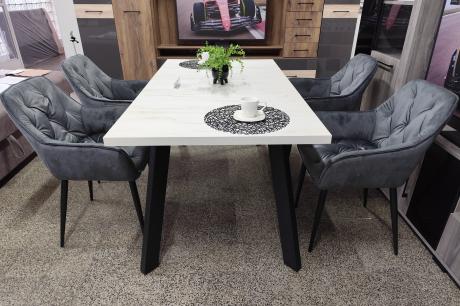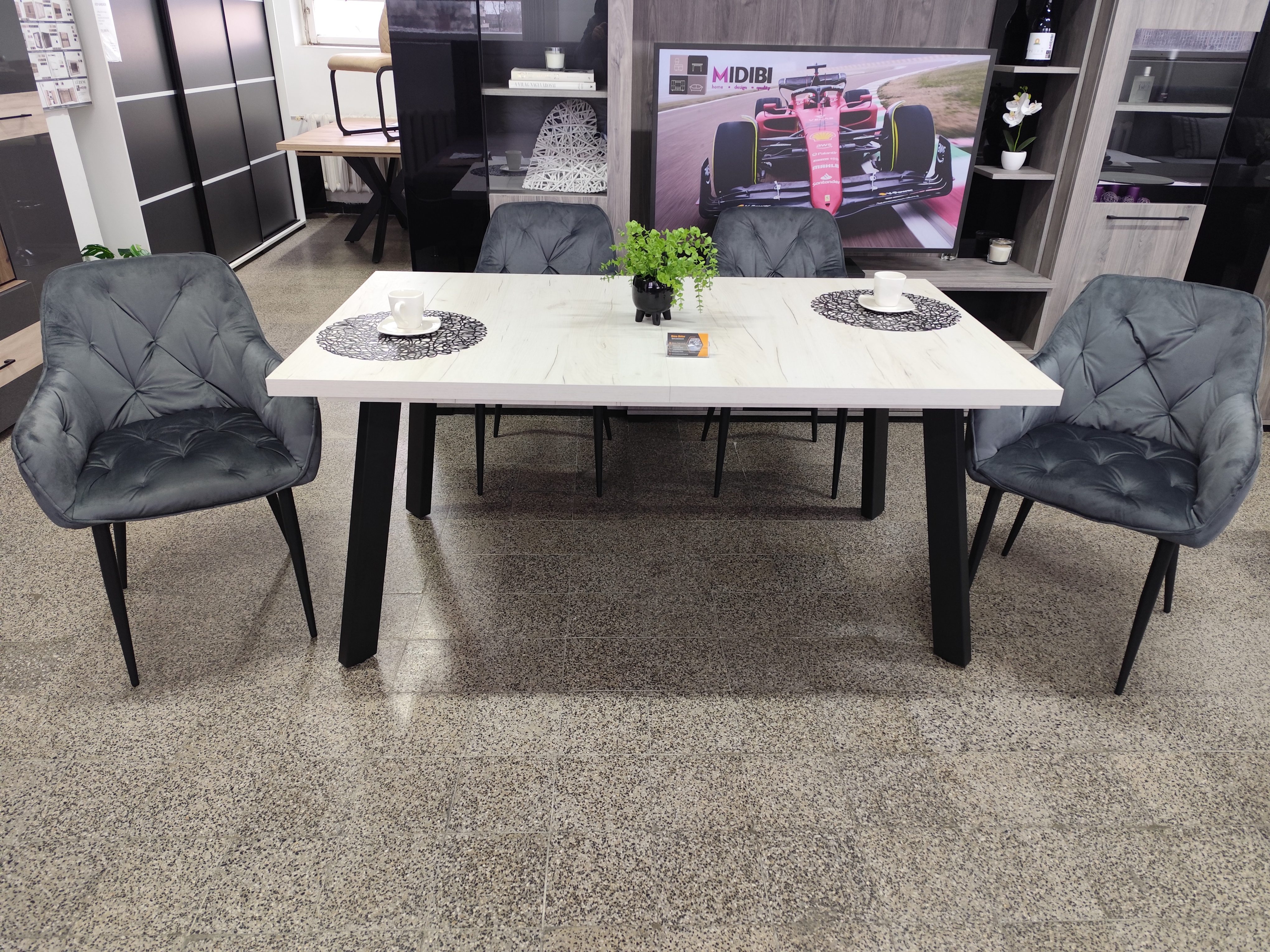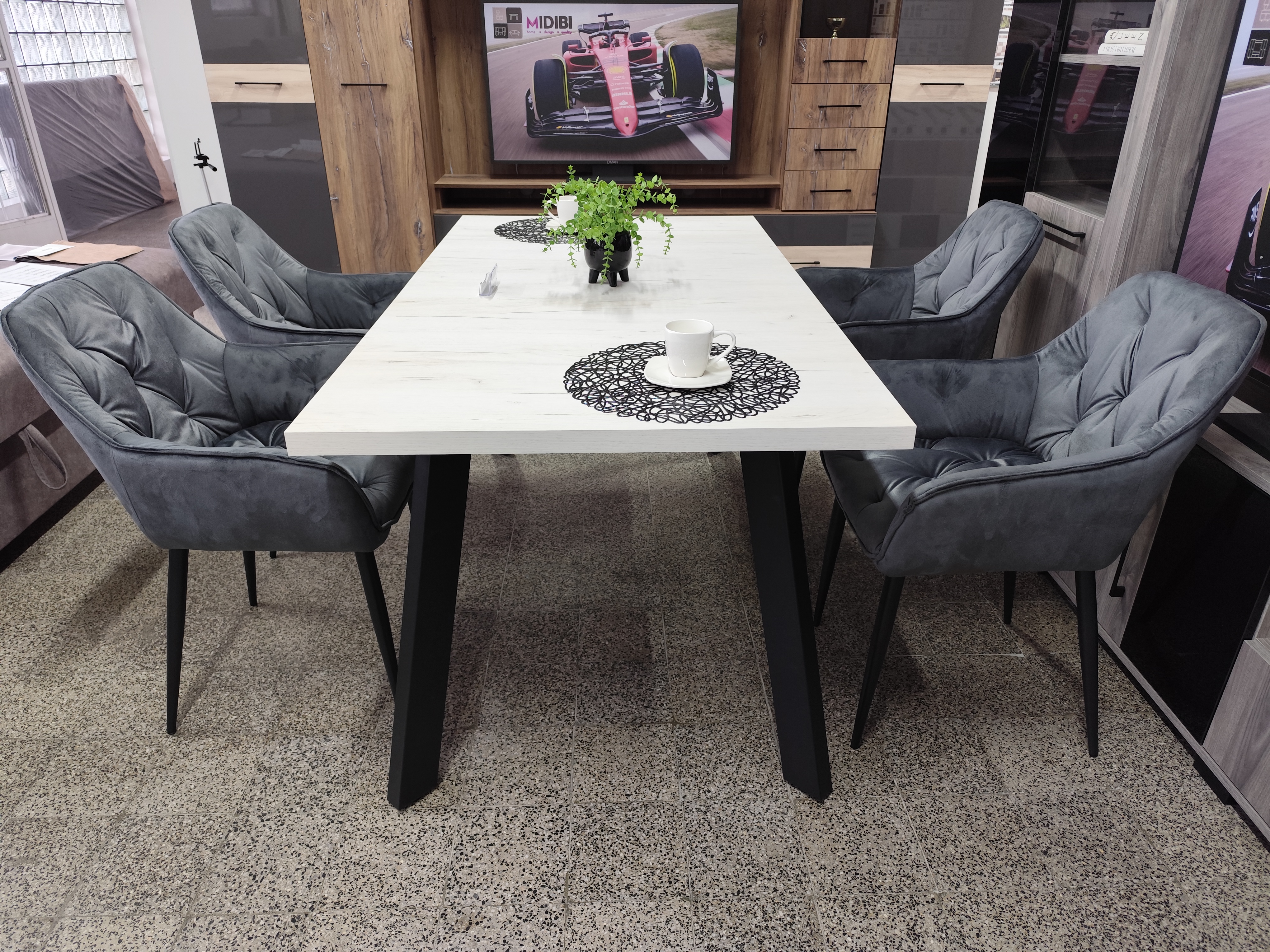 Az asztal 4 db Noel székkel egészül ki, mely az aktuális trendeknek megfelelő megjelenésével ideális döntés a modern stílusjegyeket magukon viselő otthonokba. Fekete porfestett fém lábával, grafit szürke színű plüss kárpitozásával kiválóan passzol a fehér tölgy Linett asztalhoz. Az étkezőgarnitúra ideális választás azoknak, akik az időtálló és egyben stílusos darabokat részesítik előnyben.