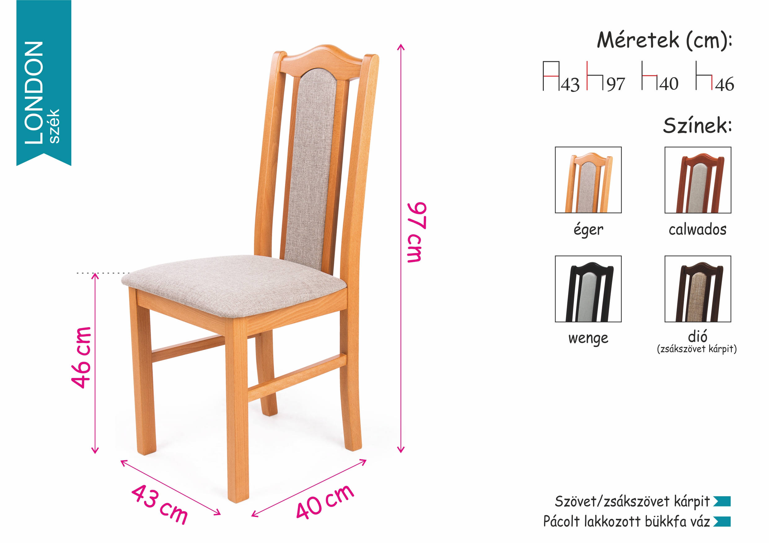 A London szék szövet kárpittal és pácolt lakkozott bükkfa vázzal a klasszikus formavilágú konyhák és ebédlők elengedhetetlen darabja. Széles színválasztékkal rendelkezik: éger, calwados, sötét dió és wenge színekben is rendelhető. Klasszikus és modern stílusú étkezőasztallal is jól variálható.