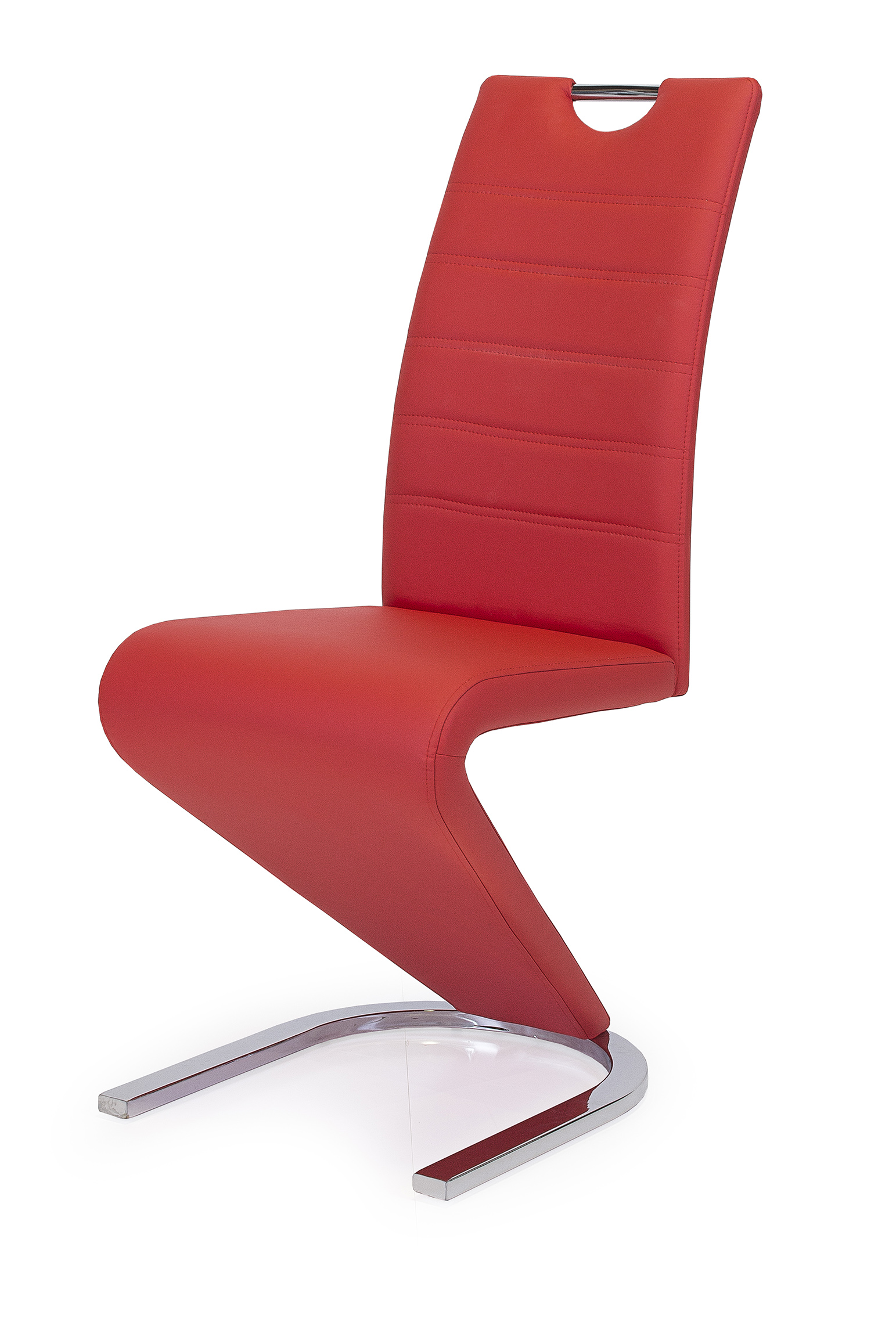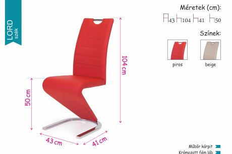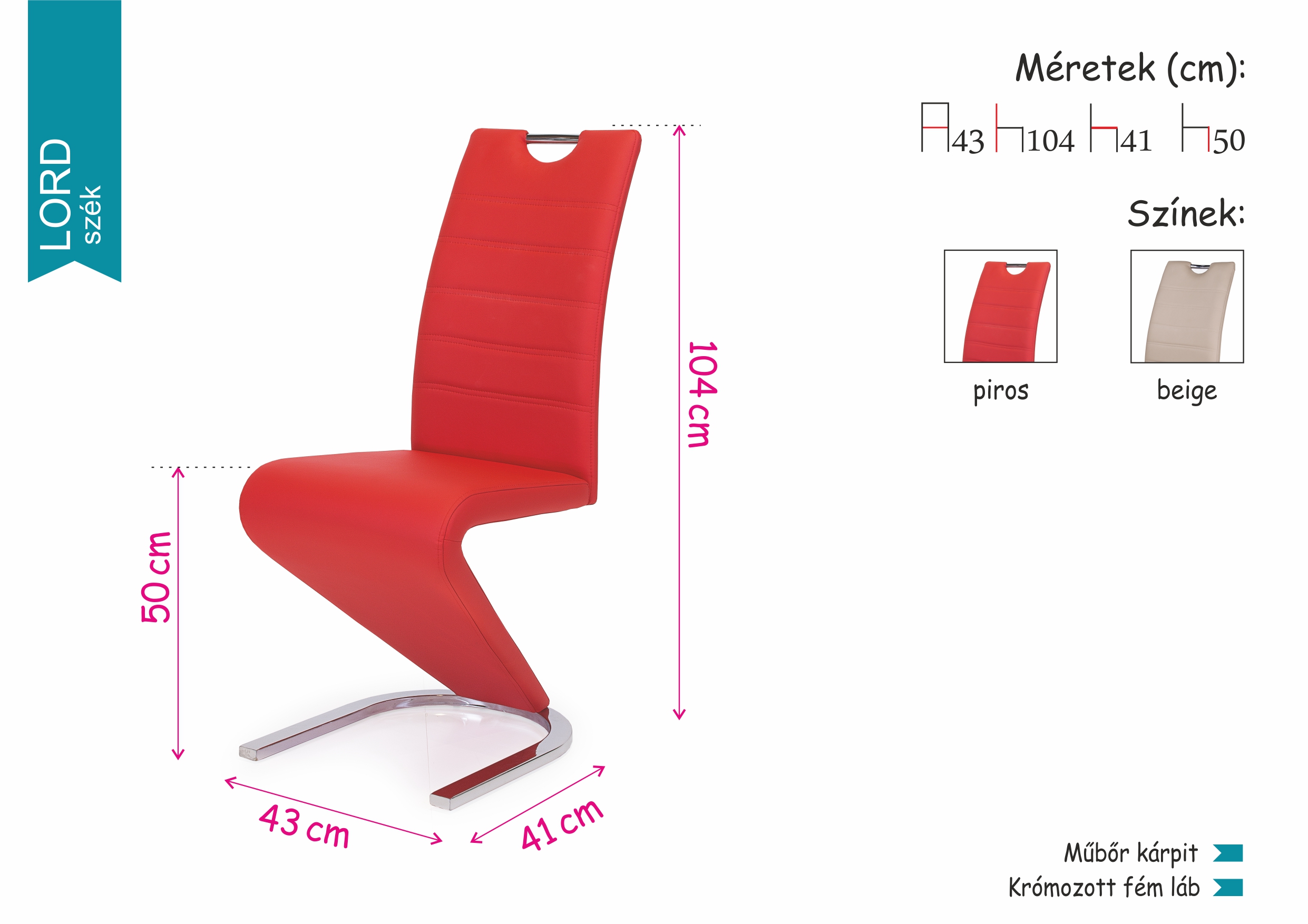 A Lord szék egy igazán stílusos étkezőszék egyedi formával, króm lábazattal és könnyen tisztítható műbőr kárpittal. A bútordarab hagyományos és modern asztalokhoz is kiválóan illik, mert izgalmas megjelenésével különleges összképet teremt az étkezőben. A szék kizárólag piros színben rendelhető.