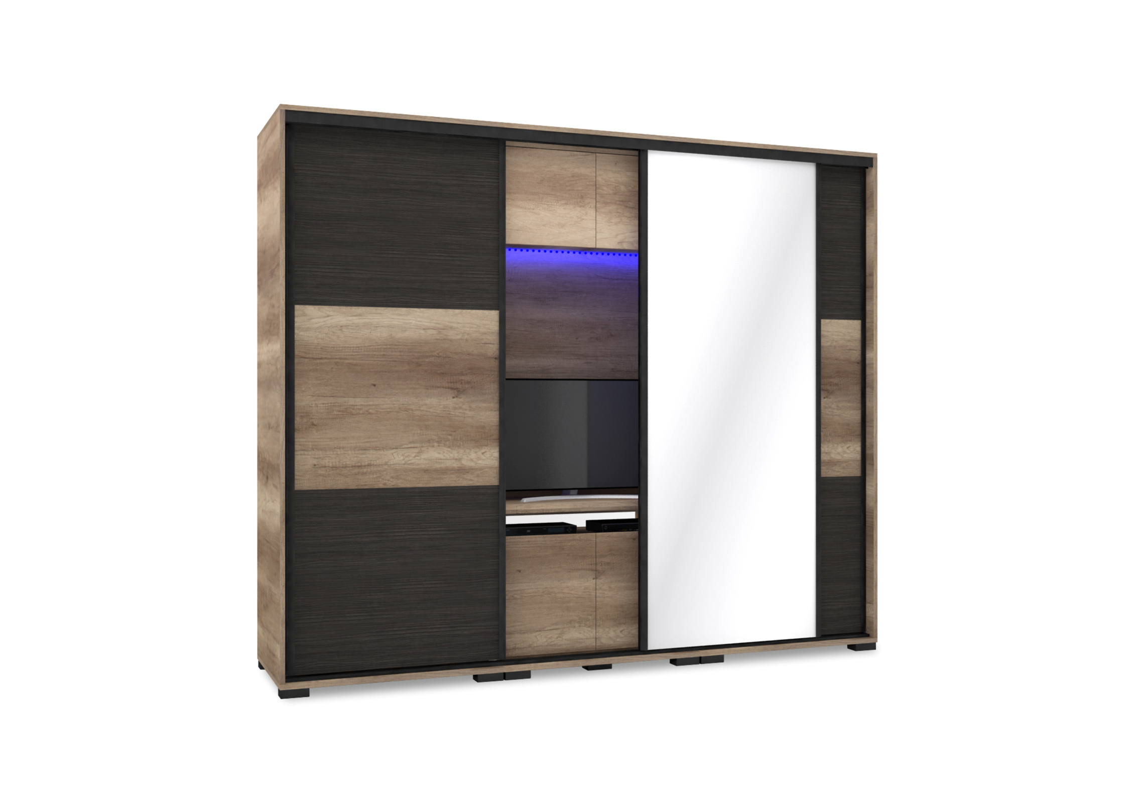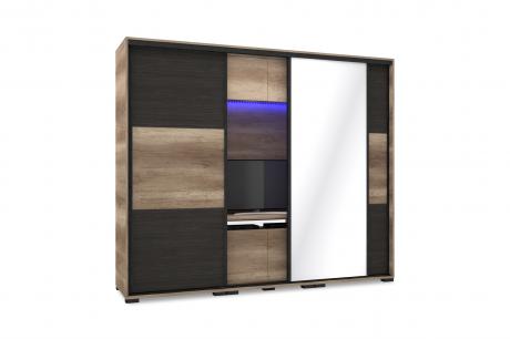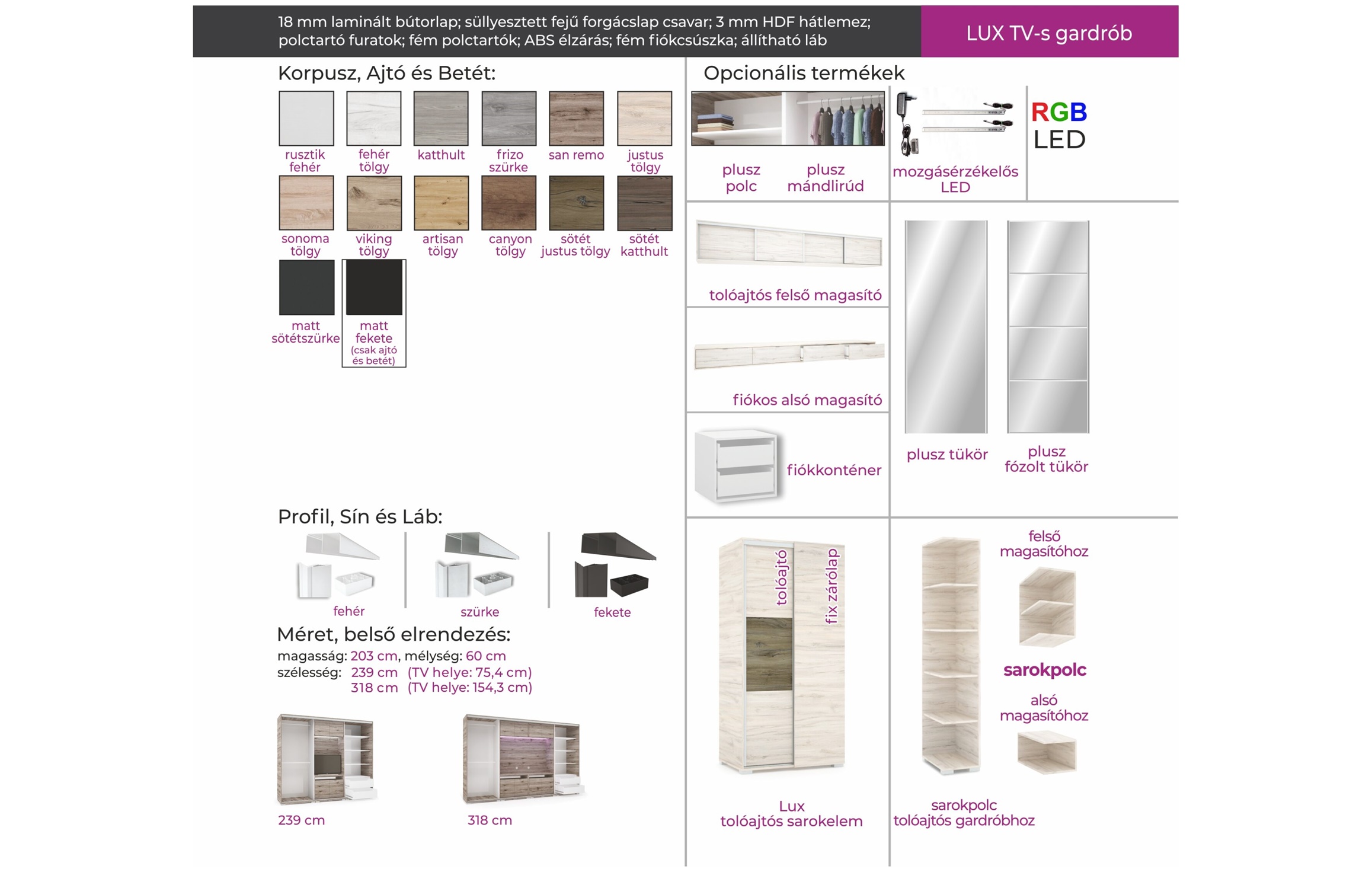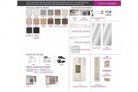 A Lux TV-s gardrób egyedisége abban rejlik, hogy a szekrény belső elrendezése nemcsak ruhák tárolását teszik lehetővé, hiszen a két ruhás elem között egy TV-s box került kialakításra. A gardrób egyik nagy előnye, hogy bútorlapos tolóajtaja nagyon jól variálható, hiszen 14 korpusz, 16 ajtó és 16 betét szín közül lehet kiválasztani a számunkra legideálisabb színösszeállítást. Az esztétikus és elegáns megjelenés mellett a tárolási kapacitás sem elhanyagolható: jól pakolhatóság jellemzi a bútort a fiókos, polcos és ruhaakasztós kialakításnak köszönhetően. A gardrób kizárólag 239 cm vagy 318 cm széles változatban rendelhető, figyelembe véve az adott TV és a szoba méretét. A 239 cm-es méretben 1 tükrös ajtóval készül, melyet az alapár tartalmaz.