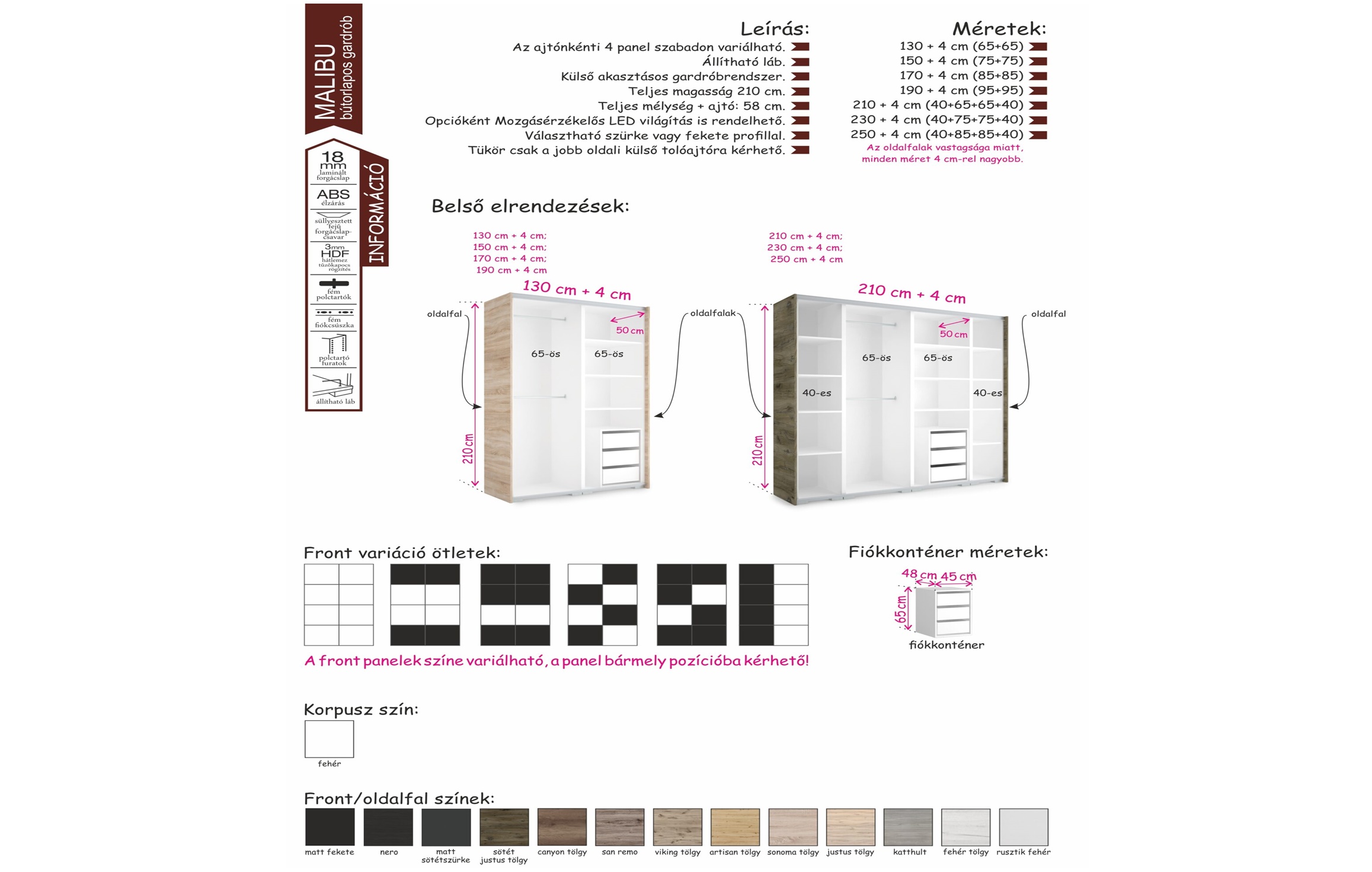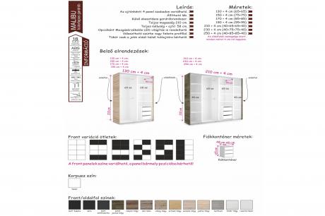 A Malibu gardrób az egyik legsokoldalúbb gardróbunk, hiszen praktikus belső elrendezése mellett a külső megjelenése is rendkívül jól variálható, testreszabható. Ez utóbbi annak köszönhető, hogy a gardróbon lévő 2 tolóajtó 8 panelből tevődik össze, melynek színösszeállítása és elrendezése a vásárlótól függ. Mind a panelek, mint az oldalfal 13-féle színben rendelhető, így a legkülönfélébb színvariációk állíthatóak össze: rendelhető egy színben, soronként vagy akár sakktábla minta szerint változó színű ajtóval is. Még a profil színe is választható, hiszen lehetőség van szürke vagy fekete profillal kérni a terméket. A 210 cm-es magasságnak és a 7-féle szélességnek köszönhetően remek választás a kisebb szobával rendelkezőknek és a nagy tárolóhelyre vágyók számára egyaránt. Belső részében fiókos, polcos és ruhaakasztós tárolók egyaránt megtalálhatóak, de opcionálisan további polcok és fiókkonténer is rendelhető hozzá. Amennyiben tükörrel kérné a terméket azt külön a megjegyzés rovatban kérjük feltüntetni. Ajtónként plusz 12.000 Ft, ha tükörrel szeretné kérni a gardróbot! Tükör csak a gardrób jobb oldalára kérhető!