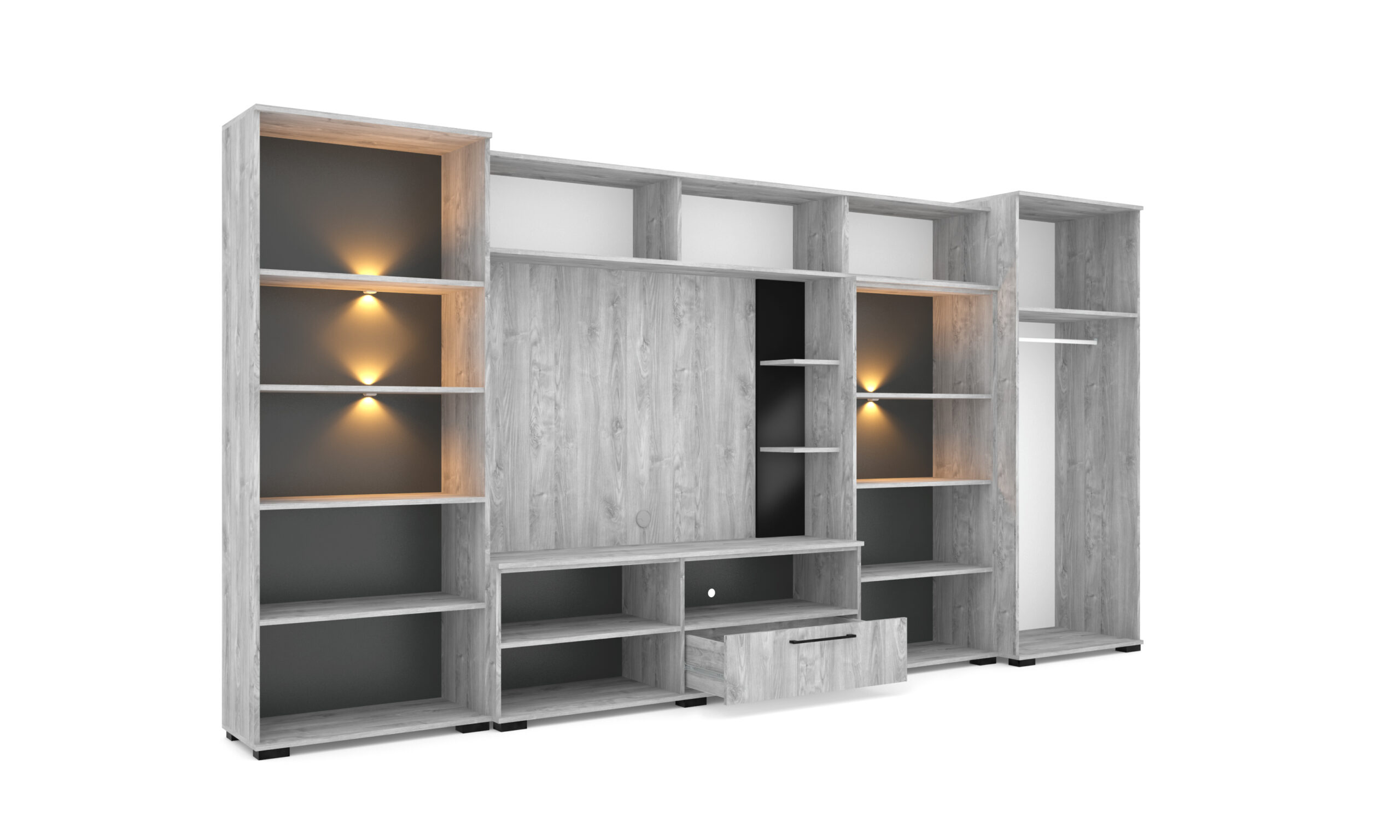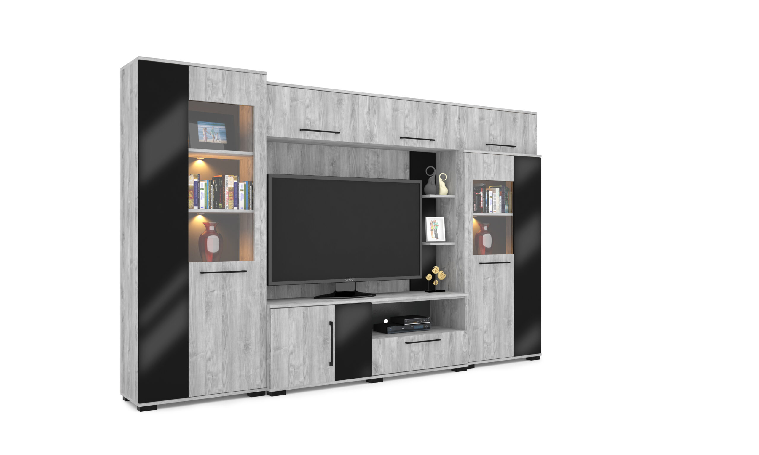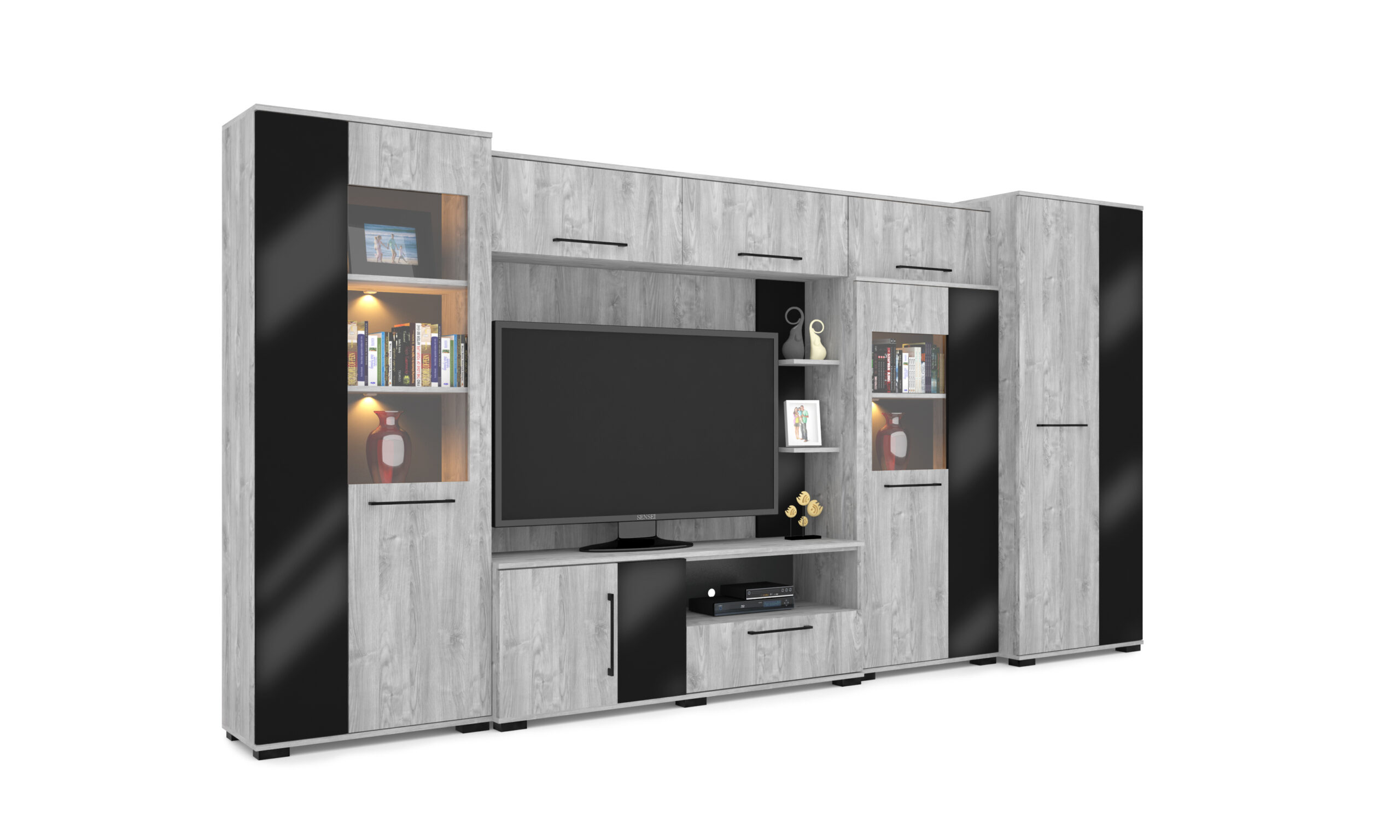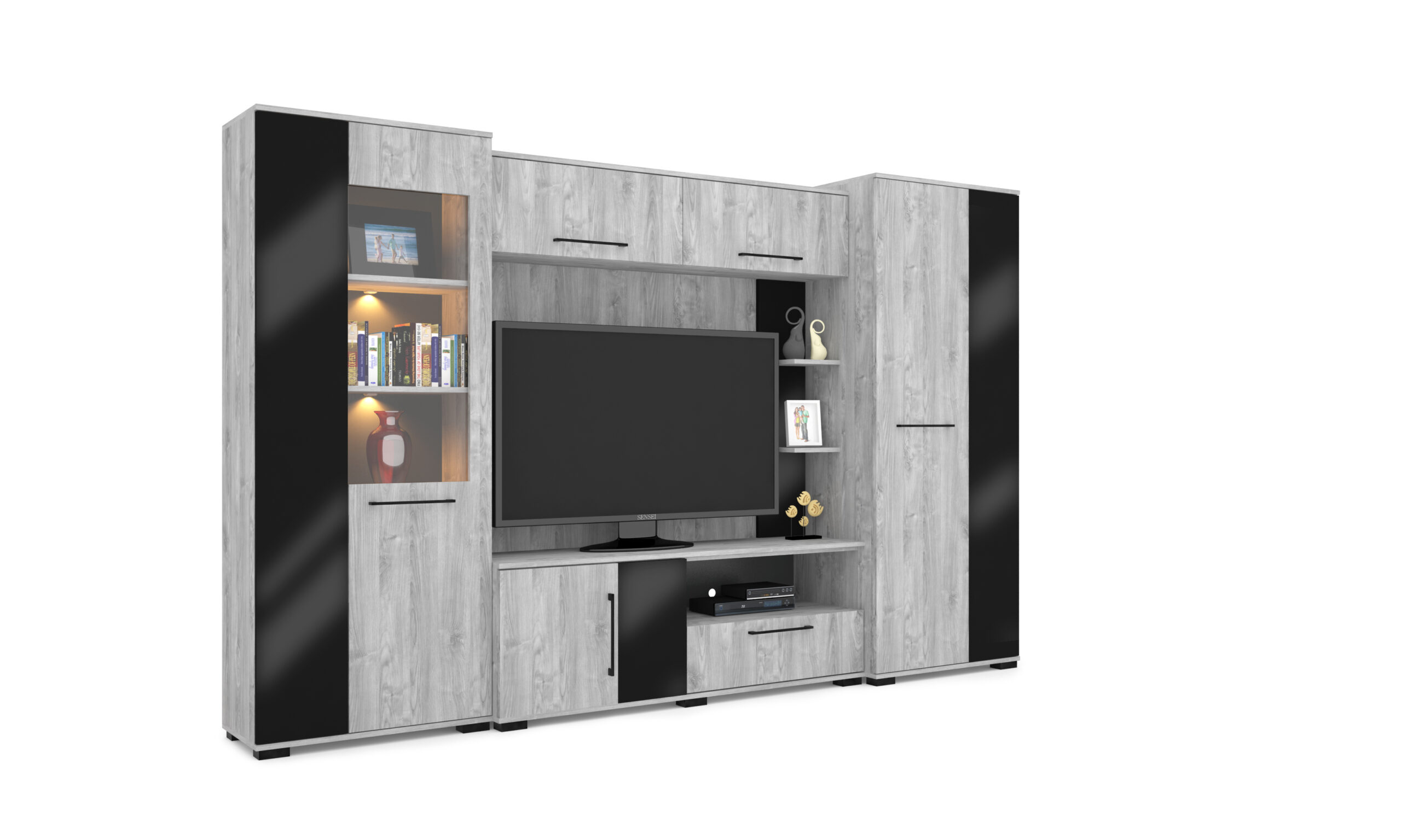 Merlin elemes szekrénysorunk letisztult, modern megjelenésű, elegáns magasfényű fekete MDF betéttel és Led világítással. A szekrénysor frizo szürke - magasfényű fekete színben rendelhető, valamint három méretvariációban. A kiválóan pakolható részek, melyek akár plusz polcokkal is kiegészíthetőek, valamint a TV számára kialakított 160 cm hosszú rész, egyaránt a praktikusságot bizonyítják.