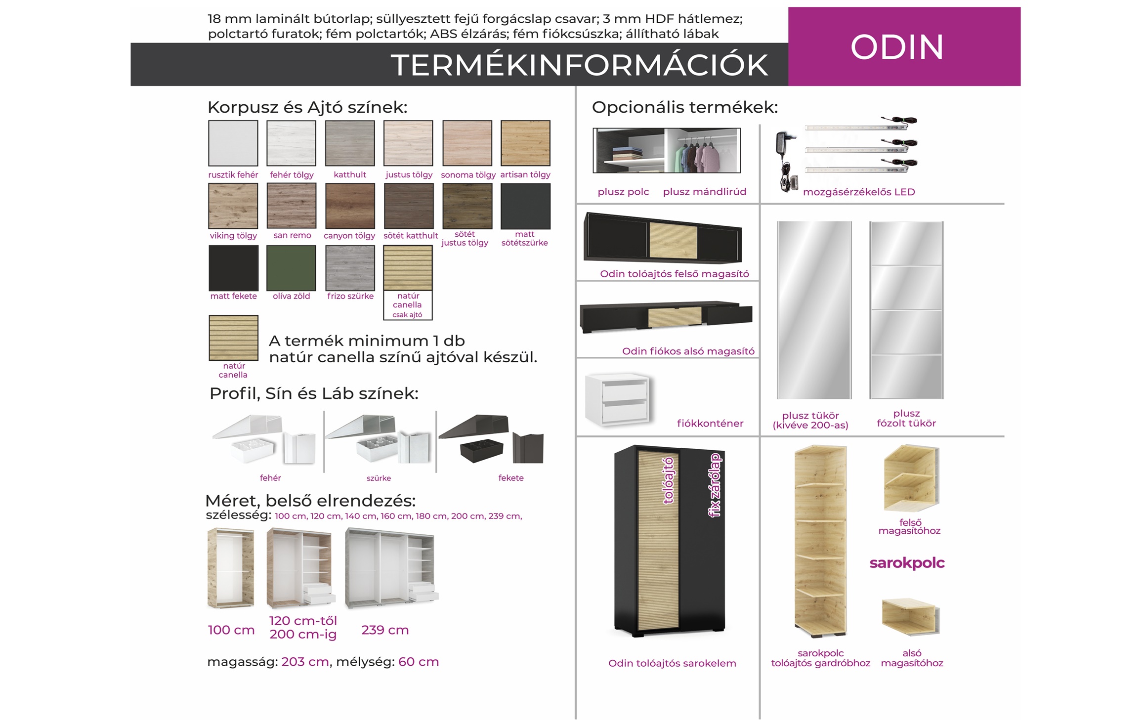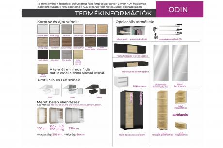 Az Odin gardrób különlegessége, hogy a natúr canella ajtószín mellé 15 féle ajtó – és korpusz szín, vagy akár tükör is választható. A bútor minimum 1 db natúr canella színű ajtóval készül. A kiválasztott színkombináció kérhető fehér, szürke vagy fekete profillal és lábbal. Akinek kisebb tér áll rendelkezésre, éppúgy megtalálhatja a megfelelő méretűt, mint a tágas hálószobával rendelkezők, hiszen 6 méretben is elérhető a gardrób. 2 ajtós kivitelben 5 méretben, illetve 3 ajtós kivitelben 239 cm-es méretben rendelhető.Belső elrendezését tekintve teljesen személyre szabható, köszönhetően az akár egymásra is helyezhető fiókdobozoknak, polcoknak, mándlirudaknak. Opcionálisan választható termékek: – sarokpolc – tolóajtós sarokelem natúr canella ajtóval és választható korpusz színnel – fózolt tükör – tükör – fiókos alsó magasító (a gardrób színeiben) – tolóajtós felső magasító (a gardrób színeiben). Amennyiben tükörrel kérné a bútort azt külön a megjegyzés rovatban kérjük feltüntetni. Ajtónként plusz 13.000 Ft, ha tükörrel szeretné kérni a gardróbot! Tükör a 200 cm széles gardróbon kívül bármelyik mérethez kérhető.