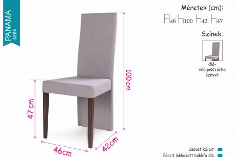 A Panama széket szövettel borított háttámlája teszi különlegessé. A szék világos szürke-dió színben rendelhető. Egyszerű, letisztult mégis elegáns megjelenésével kiválóan illik a modern hangulatú otthonokba. Nagyon kényelmes az ülőlap és a háttámla is. Ez utóbbi követi a hát vonalát, hogy még jobb támasztást nyújtson a hosszúra nyúlt családi beszélgetések alatt is.
