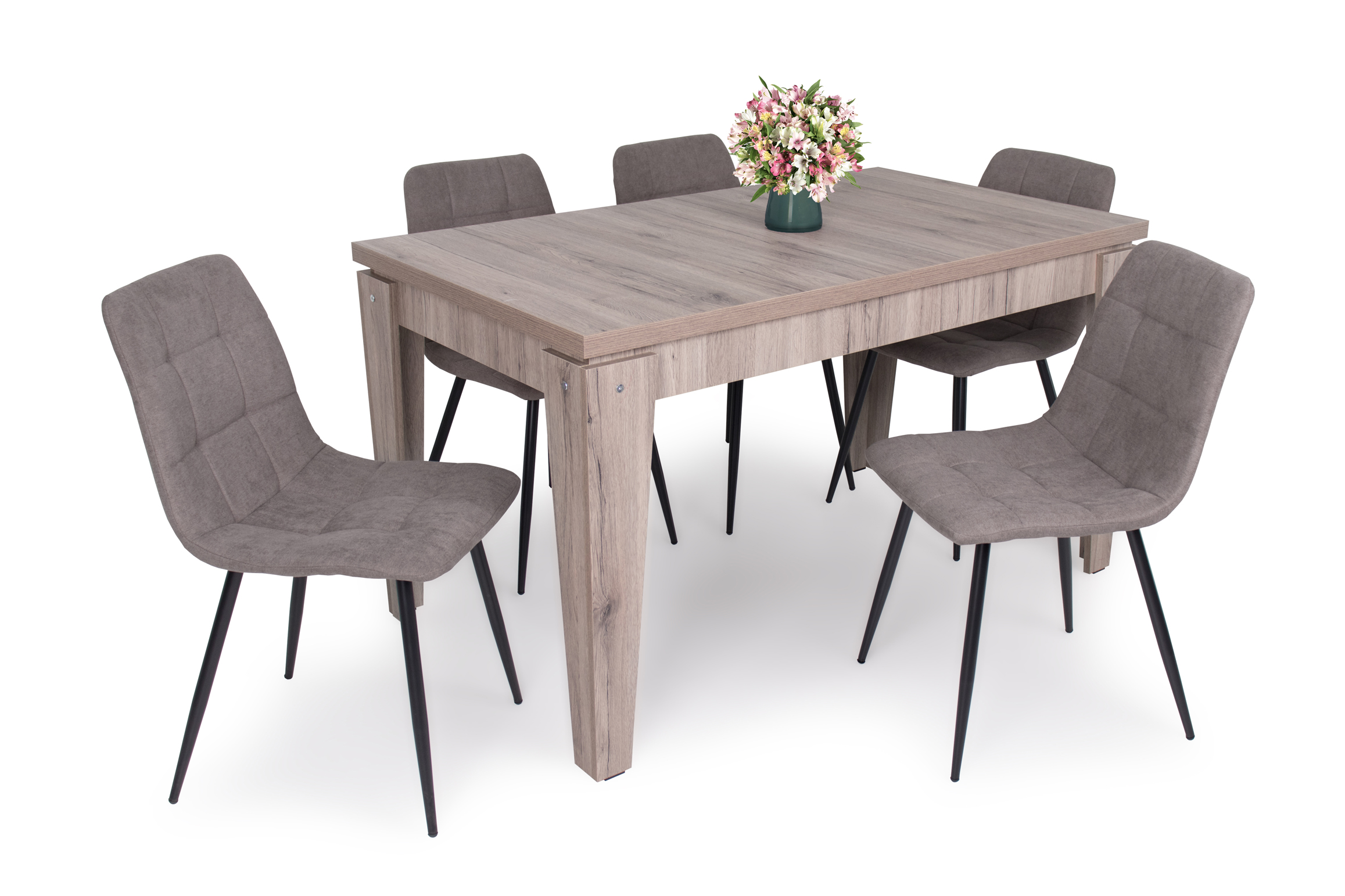 Az asztal 6db Kamil székkel egészül ki, mely az aktuális trendeknek megfelelő megjelenésével ideális döntés a modern stílusjegyeket magukon viselő otthonokba. Fekete porfestett fém lábával, barna színű kárpitozásával kiválóan passzol a san remo szinű Prága asztalhoz. Az étkezőgarnitúra ideális választás azoknak, akik az időtálló és egyben stílusos darabokat részesítik előnyben.