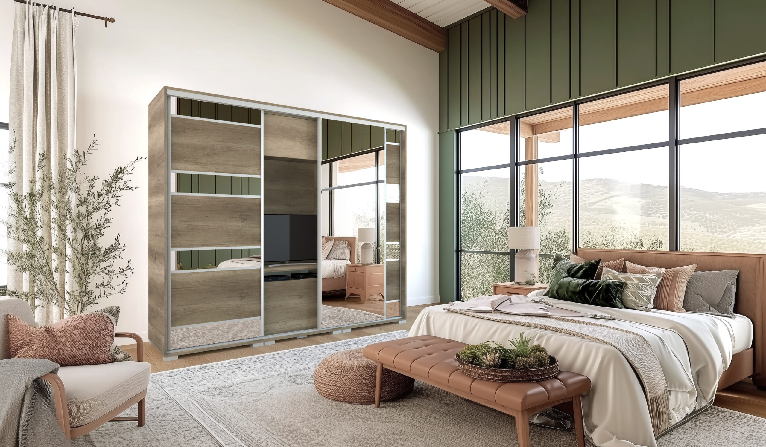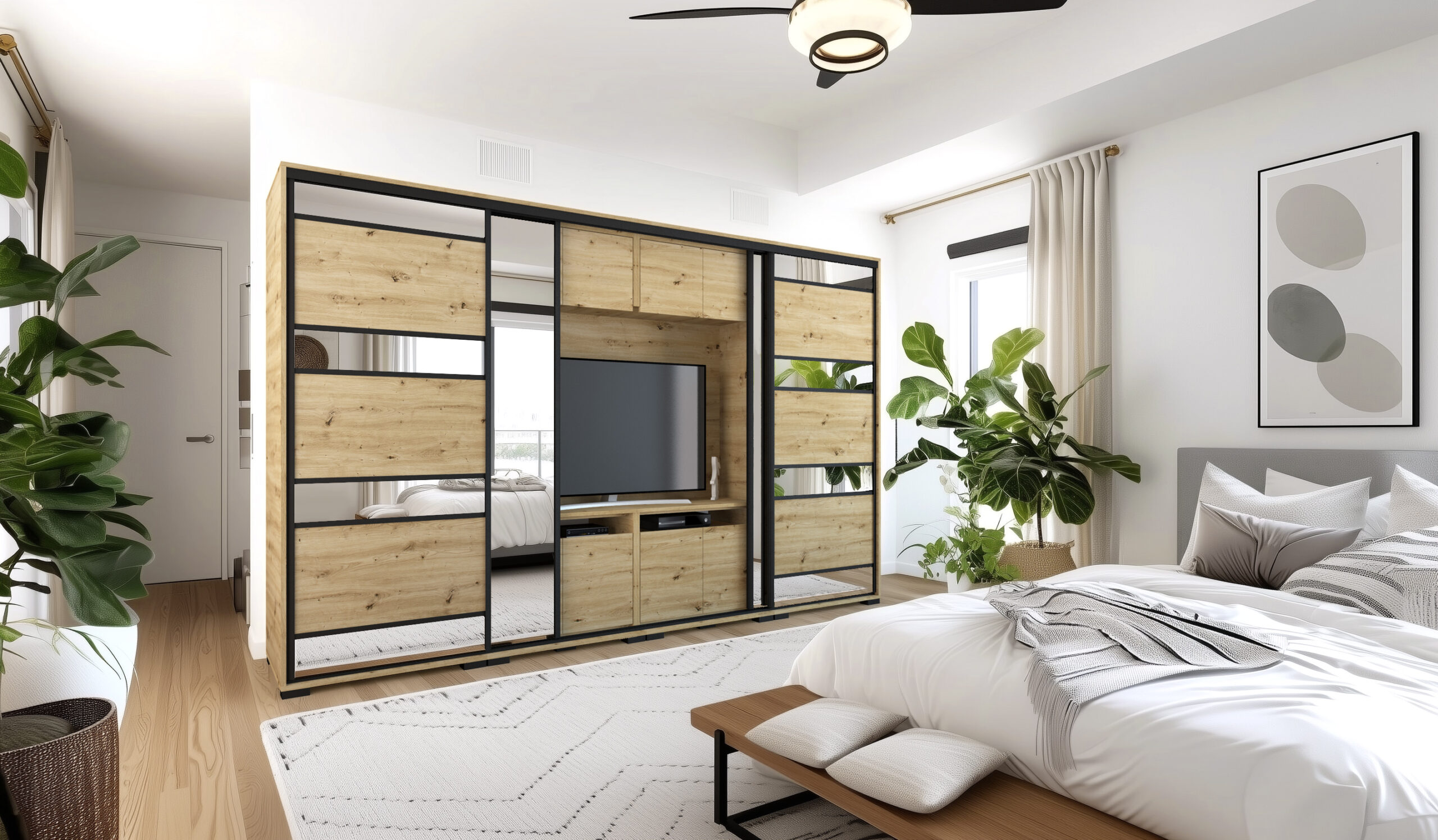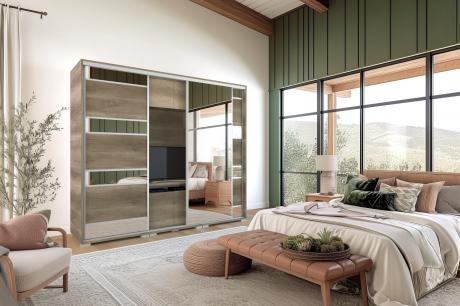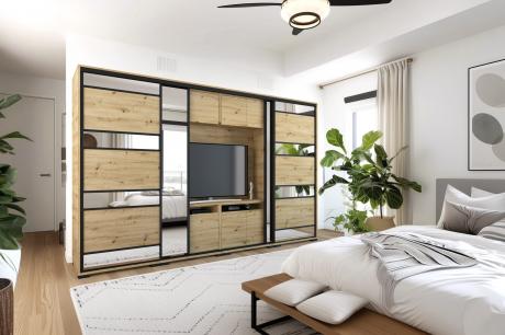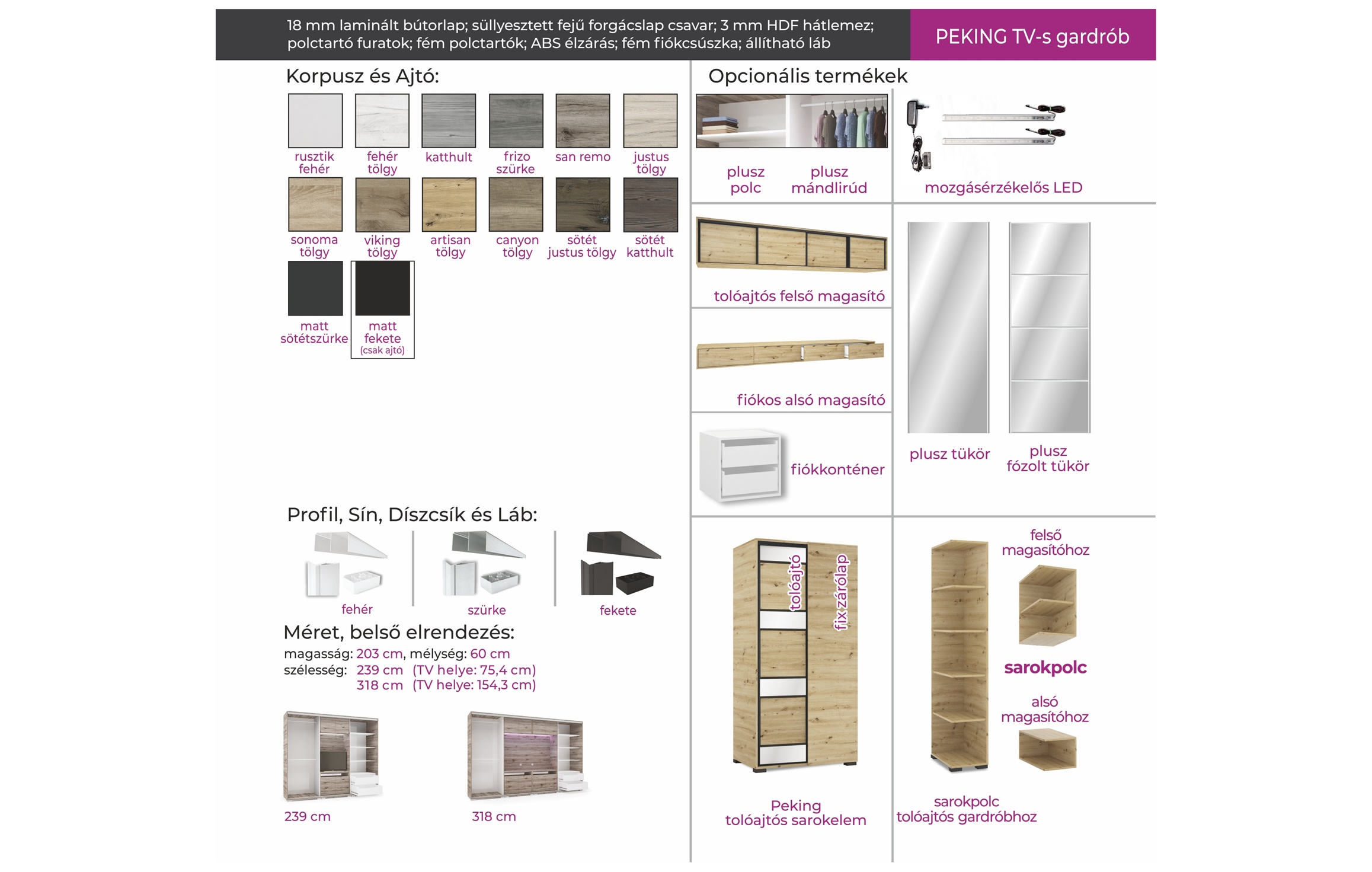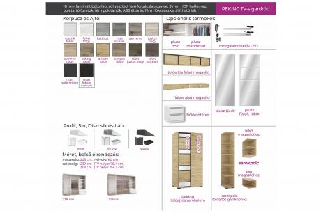 A Peking TV-s gardrób egyedisége abban rejlik, hogy a szekrény belső elrendezése nemcsak ruhák tárolását teszik lehetővé, hiszen a két ruhás elem között egy TV-s box került kialakításra. Elegáns tükör betéttel készül és a tükrös ajtók hatására a szobák tágasabbnak, világosabbnak tűnnek. Széles választékkal igyekszik mindenki igényeinek megfelelni, kétféle méret és megannyi bútorlapszín közül lehet választani. A tükrös tolóajtó mindkét méret alaptartozékát képzi. 14 bútorlapszínének köszönhetően könnyen kiválaszthatjuk a szobánkhoz leginkább passzoló árnyalatot. A bútor továbbá kérhető szürke - fehér vagy fekete profillal és lábbal is. Belső elrendezését tekintve teljesen személyre szabható, köszönhetően az akár egymásra is helyezhető fiókdobozoknak, a polcoknak és mándlirudaknak. A gardrób tárolókapacitása is tovább bővíthető fiókos alsó és tolóajtós felső magasítókkal. A gardrób kizárólag 239 cm vagy 318 cm széles változatban rendelhető, figyelembe véve az adott TV és a szoba méretét. A 239 cm-es méretben 1 tükrös ajtóval, a 318 cm-es méretben 2 tükrös ajtóval készül, melyet az alapár tartalmaz.