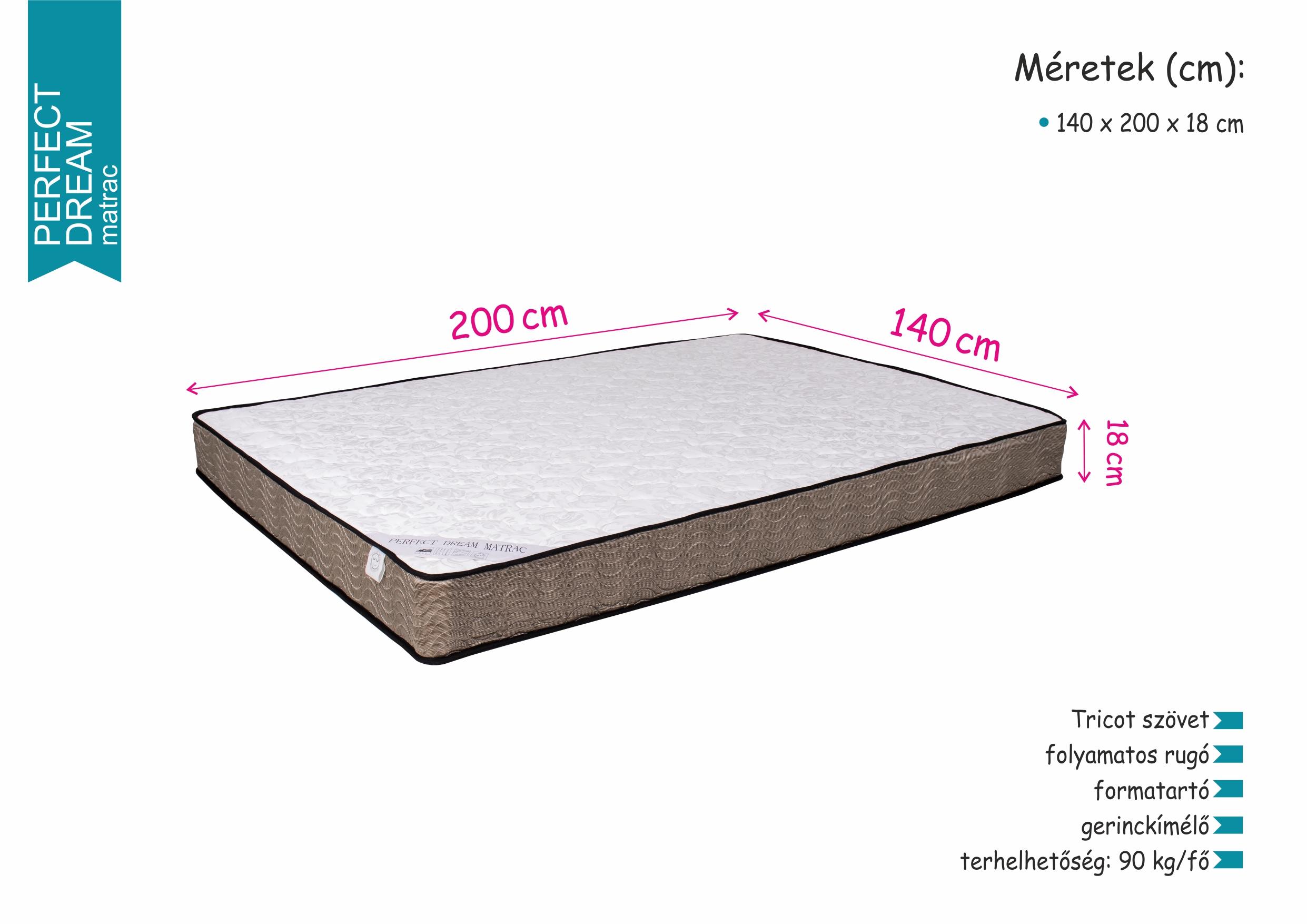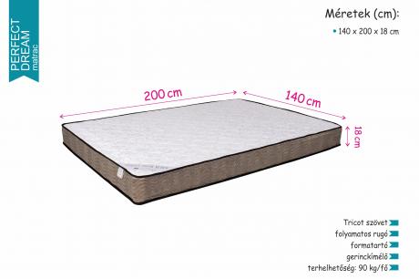 A Perfect Dream matrac folyamatos rugókból felépülő szerkezetének köszönhetően megfelelő rugalmasságú, ugyanakkor formatartó is egyben. Gerinckímélő kialakításának köszönhetően minőségi alvást biztosít. Felső rétege Tricot szövet, amely különleges szövésének köszönhetően kellemes tapintású, puha és tartós is egyben.