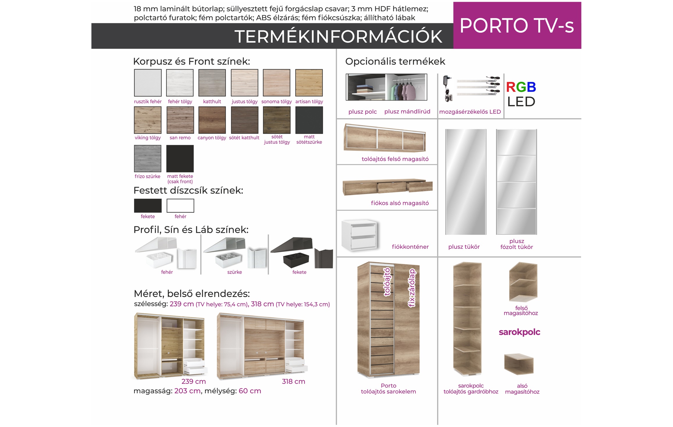 A Porto TV-s gardrób a gardróbok legújabb generációját képviseli, ami annak köszönhető, hogy belső kialakítása már nemcsak ruhák tárolását teszik lehetővé, hanem a televíziónkat is el tudjuk benne "rejteni". A két ruhás elem között egy TV-s box lett kialakítva, ami tökéletesen beintegrálódik a gardrób egészébe. A bútor egyedi elegáns megjelenésű, melyet a jellegzetes festett csíkozással ér el. A vízszintes vonalak harmóniája nyugalmat és eleganciát kölcsönöznek a bútornak. Az esztétikus megjelenés mellett a tárolási kapacitás sem elhanyagolható: jól pakolhatóság jellemzi a bútort a fiókos, polcos és ruhaakasztós kialakításnak köszönhetően, mely opcionálisan variálható és bővíthető, így mindenki a maga ízlésére tudja szabni. 15-féle bútorlapszín közül választhatjuk ki az otthonunk stílusához leginkább passzoló darabot. A gardrób kizárólag 239 cm vagy 318 cm széles változatban rendelhető, figyelembe véve az adott TV és a szoba méretét. Sima tükrös és fózolt tükrös ajtóval/ajtókkal is kérhető a gardrób, melyet a méretek opció alatt lehet kiválasztani (a képeken a fózolt tükrös változat látható).