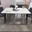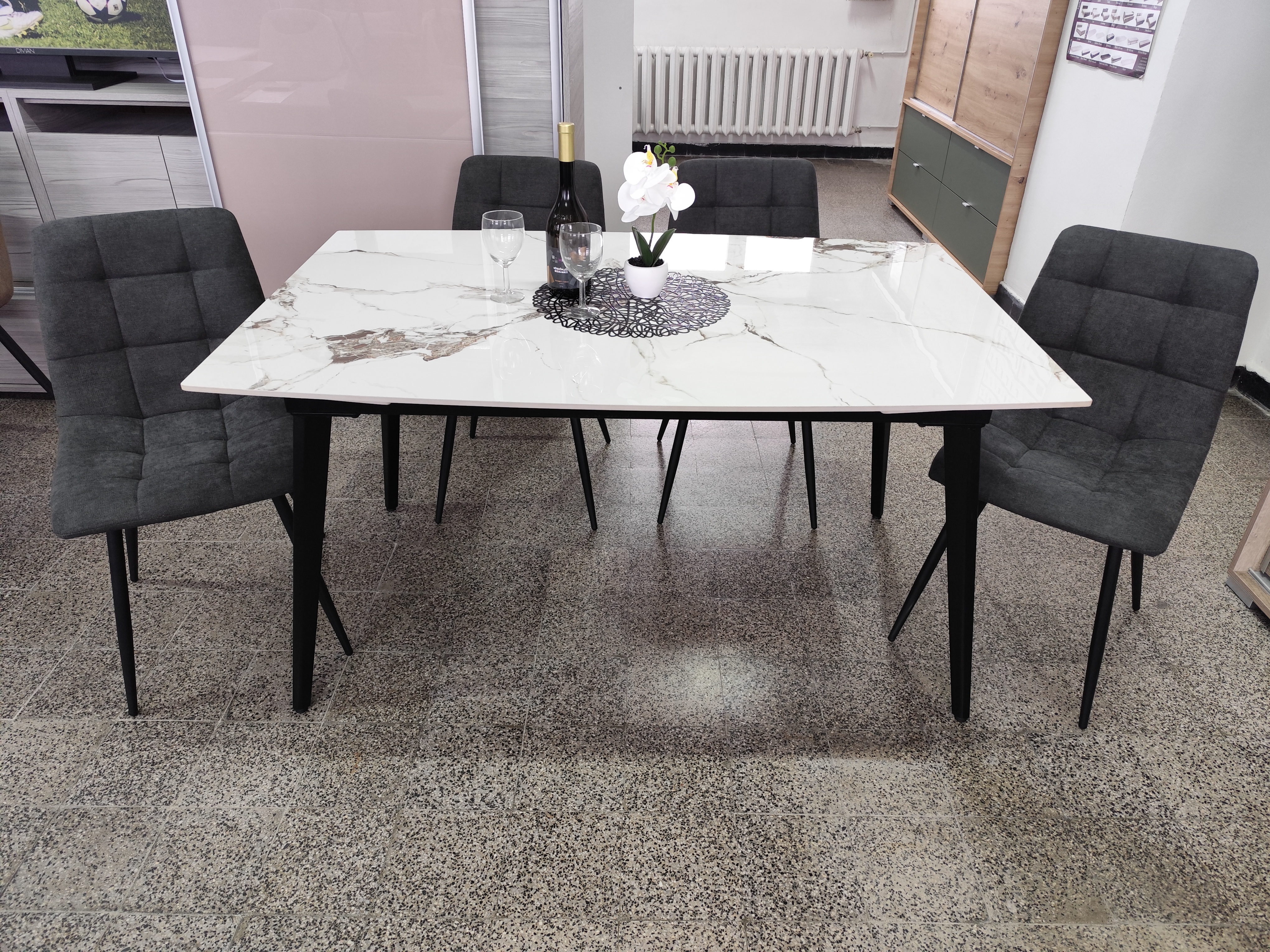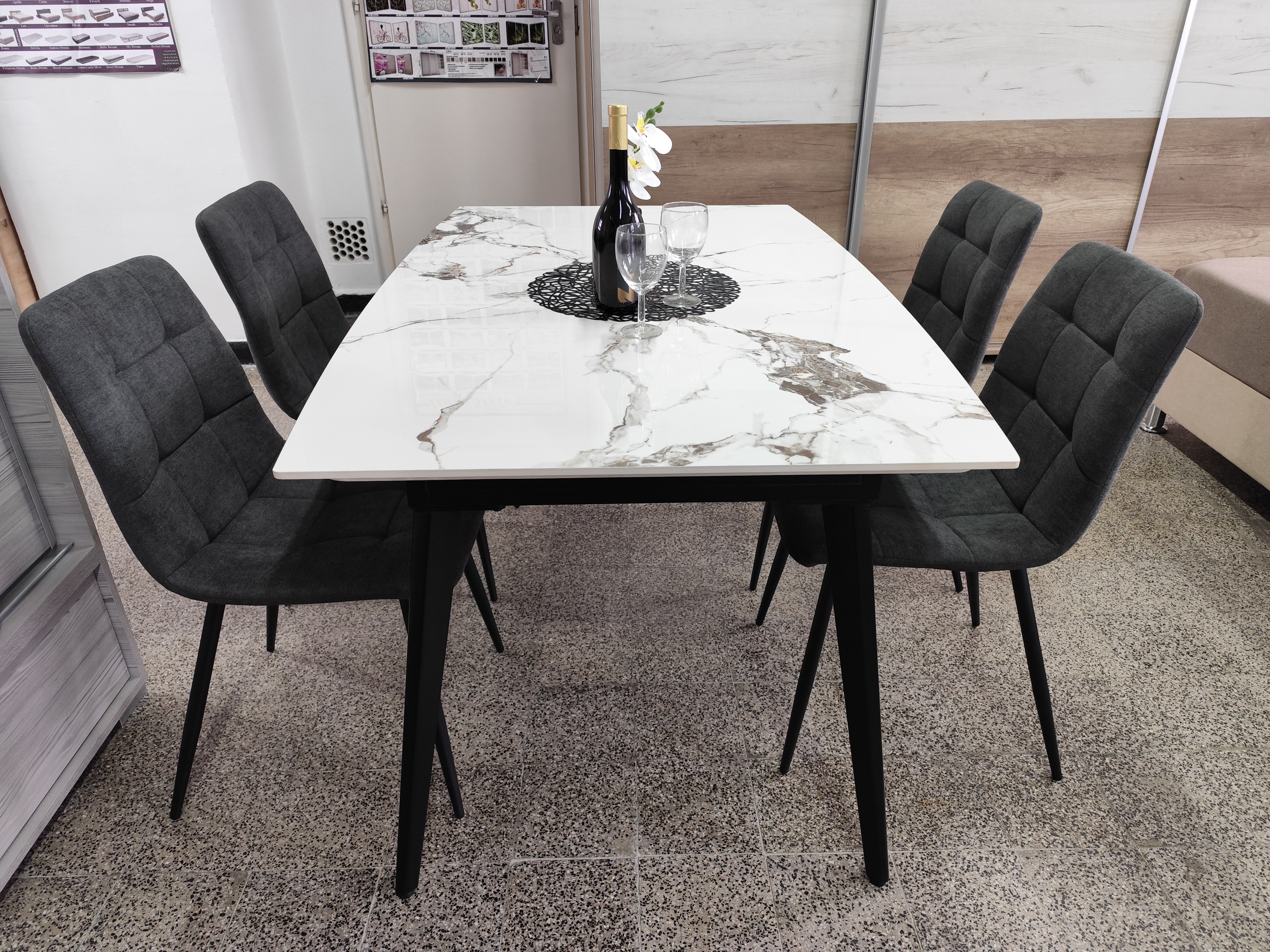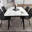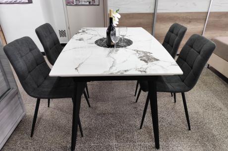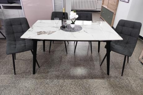 Az asztal 4 db Kamil székkel egészül ki, mely az aktuális trendeknek megfelelő megjelenésével ideális döntés a modern stílusjegyeket magukon viselő otthonokba. Fekete porfestett fém lábával, szürke színű kárpitozásával kiválóan passzol a márvány asztalhoz. Az étkezőgarnitúra ideális választás azoknak, akik az időtálló és egyben stílusos darabokat részesítik előnyben.