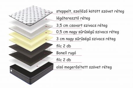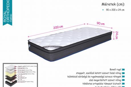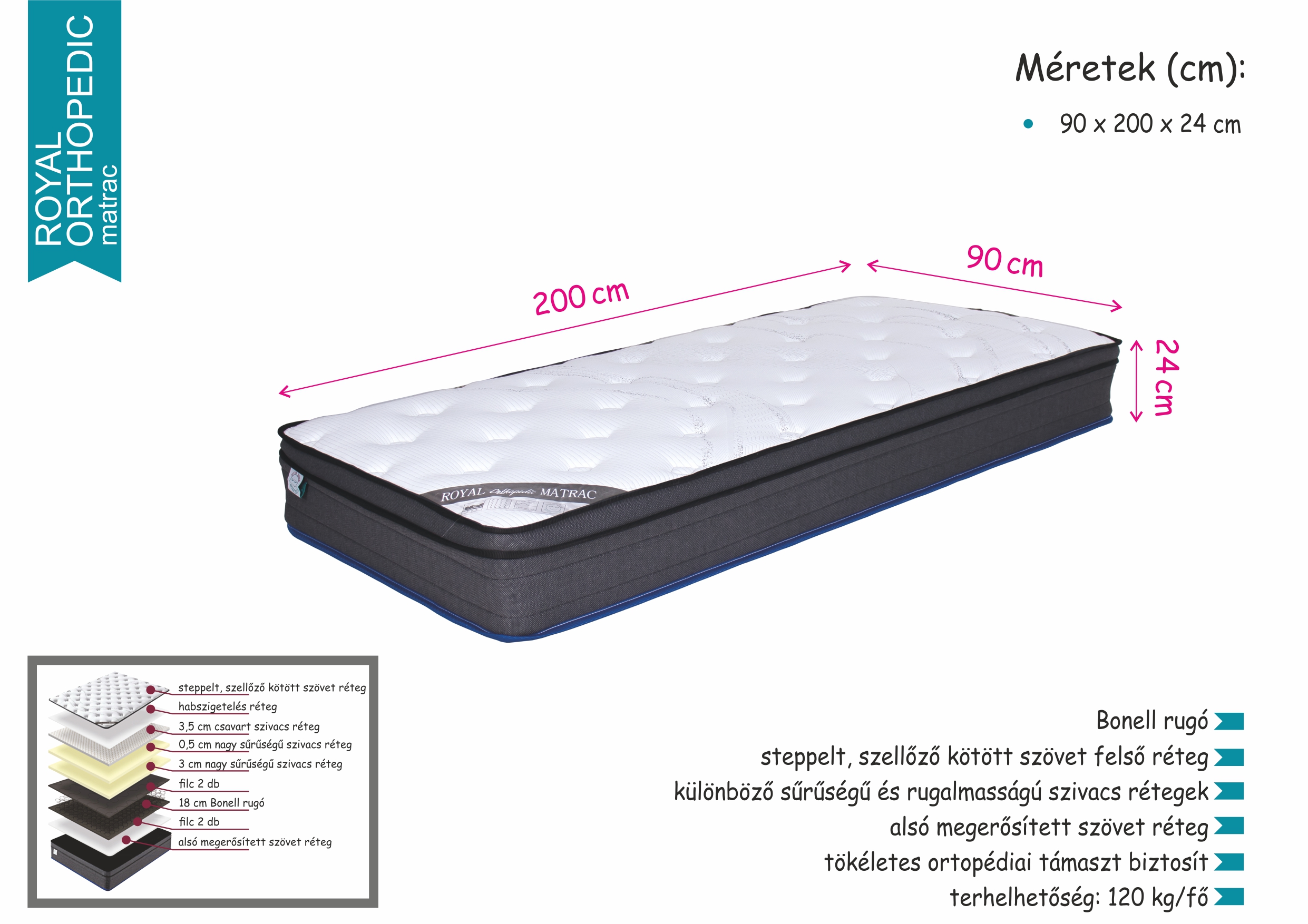 A Royal Orthopedic matrac a különböző sűrűségű és rugalmasságú szivacsrétegeknek, valamint a Bonell rugóknak köszönhetően tökéletes ortopédiai támaszt nyújt a testnek. A felső steppelt, légáteresztő rétegnek köszönhetően kiválóan átszellőzik. A középső rész három eltérő szivacsrétege a tökéletes alátámasztásért felel. Az alsó réteg 18 cm magas Bonell rugóit filc borítja, amely elválasztja a rugózatot a szivacsrétegtől, illetve erősíti a matrac szerkezetét. A matrac tulajdonságainak köszönhetően optimálisan alátámasztja a testet, így nyugodtabb, pihentetőbb alvást tesz lehetővé.