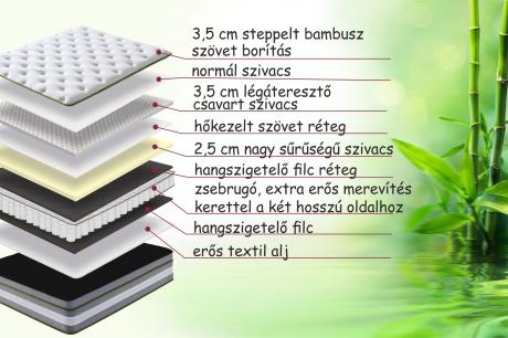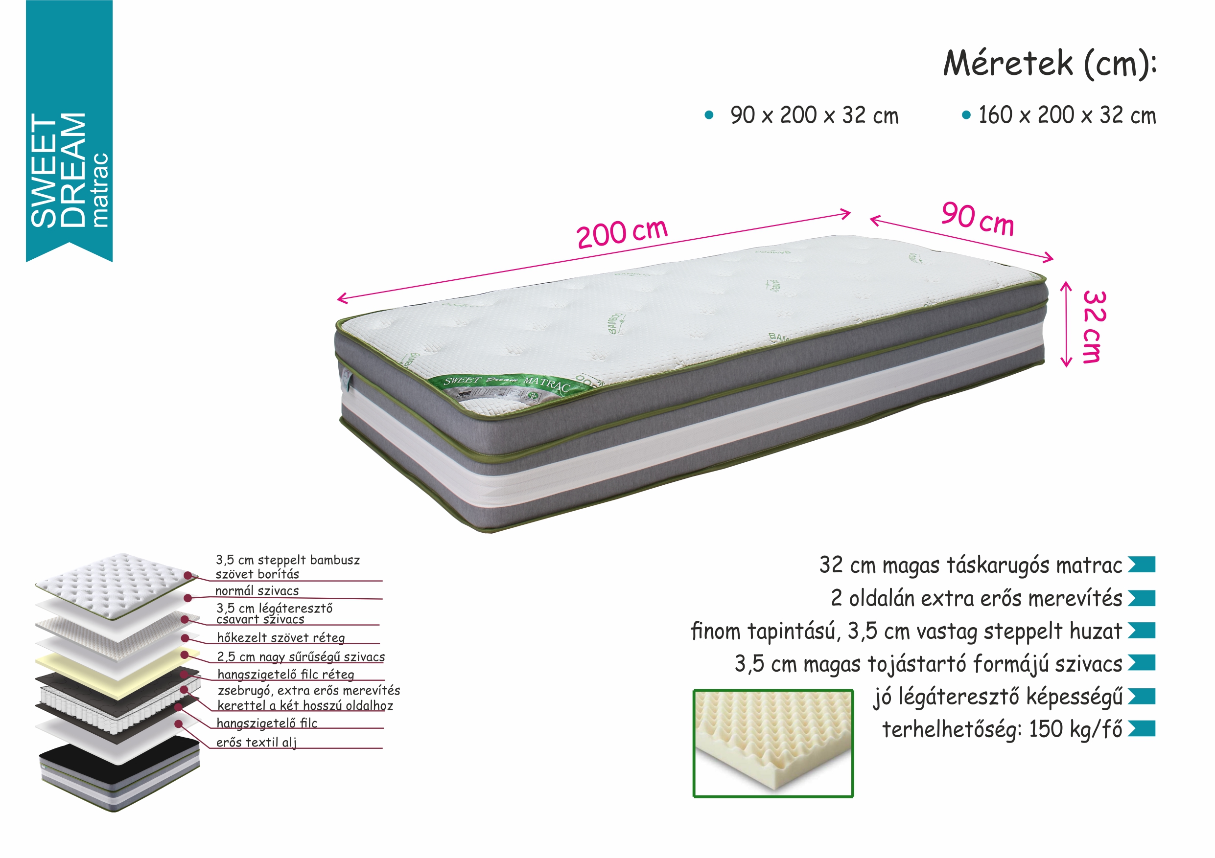 Magas terhelhetőséggel (150 kg/fő) bíró, 32 cm magas táskarugós matrac, amelynek 2 oldalán extra erős merevítés erősíti a matrac tartását. Puha, finom tapintású 3,5 cm vastag steppelt huzat borítja a matracot. Tökéletes légáteresztését a 3,5 cm magas csavart vagy más néven tojástartó formájú szivacs biztosítja. Tökéletes ortopédiai alátámasztást biztosít a testnek.