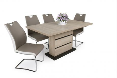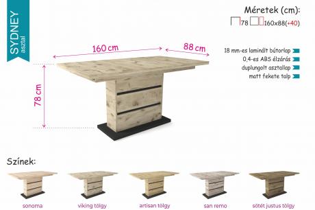 A Sydney asztal igazán jó választás, ha trendivé szeretné varázsolni étkezőjét. 5 színben rendelhető: viking tölgy, artisan tölgy, sonoma tölgy, san remo és sötét justus tölgy. Az asztal talpa matt fekete, mely a lábrészen is megjelenik dekorcsík formájában az asztallap színével kiegészülve. Az asztal kizárólag 160 x 88 cm-es méretben rendelhető, mely vendégek fogadása esetén egy 40 cm-es vendéglappal bővíthető.