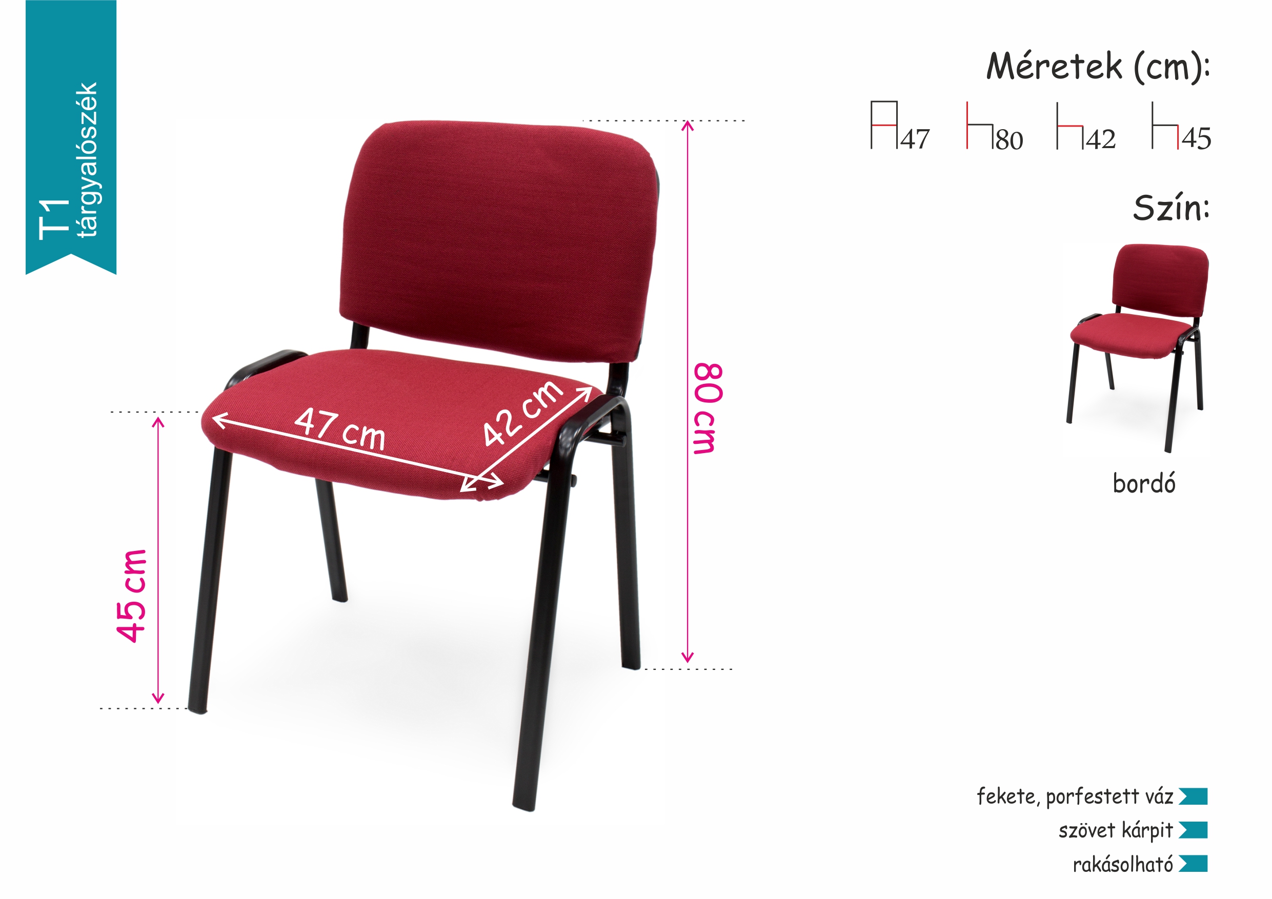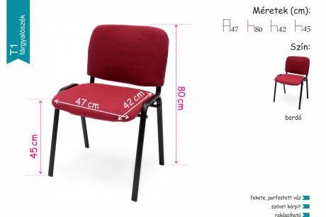 A  tárgyalószék stabil, kényelmes, ráadásul rakásolható, tehát sok tárolható belőle kis helyen. Szinte bármilyen nagyobb létszámú rendezvénynél alkalmazható, legyen szó professzionális konferenciákról, esküvőkről vagy egyéb alkalomról. A szék piros színben rendelhető.