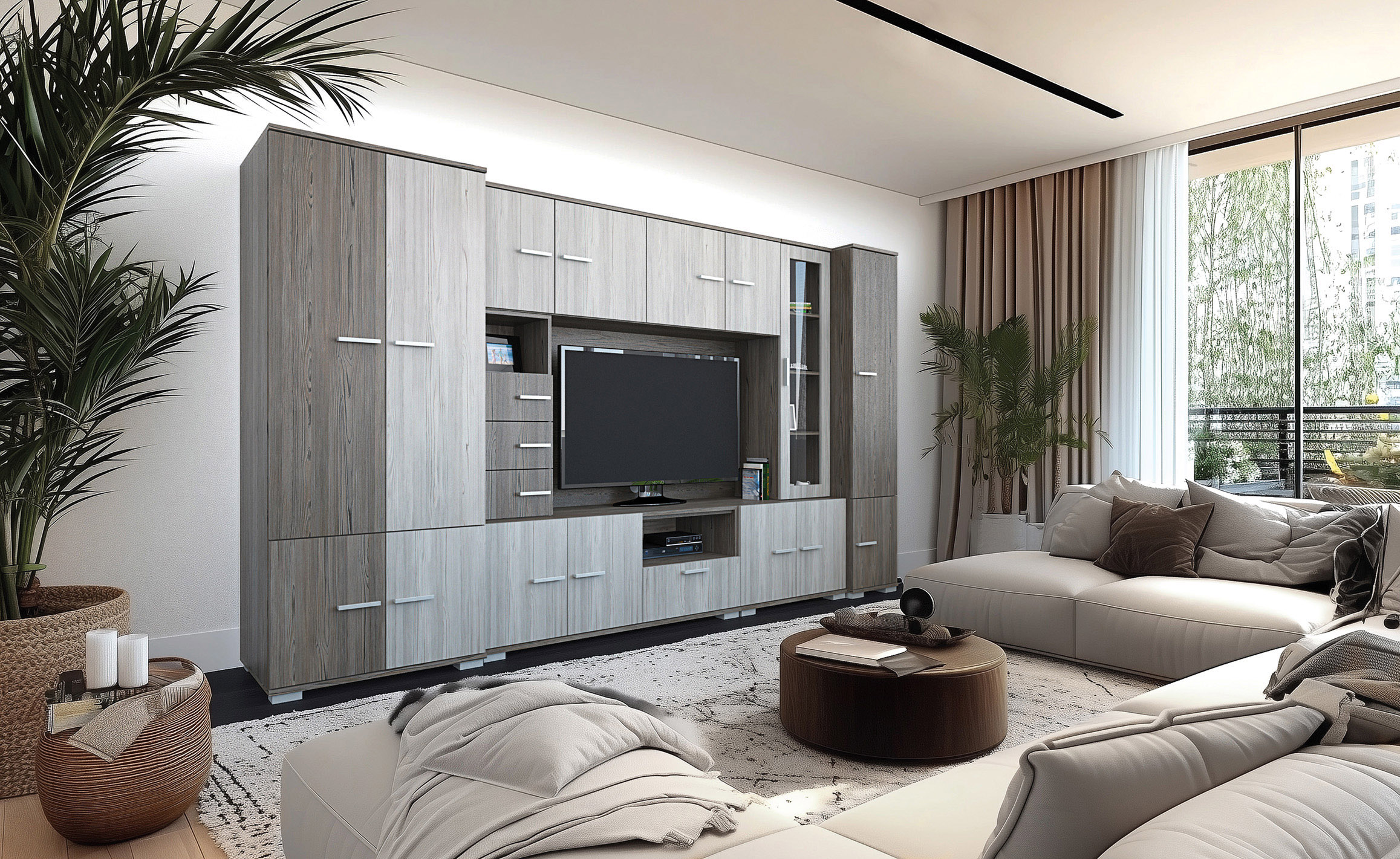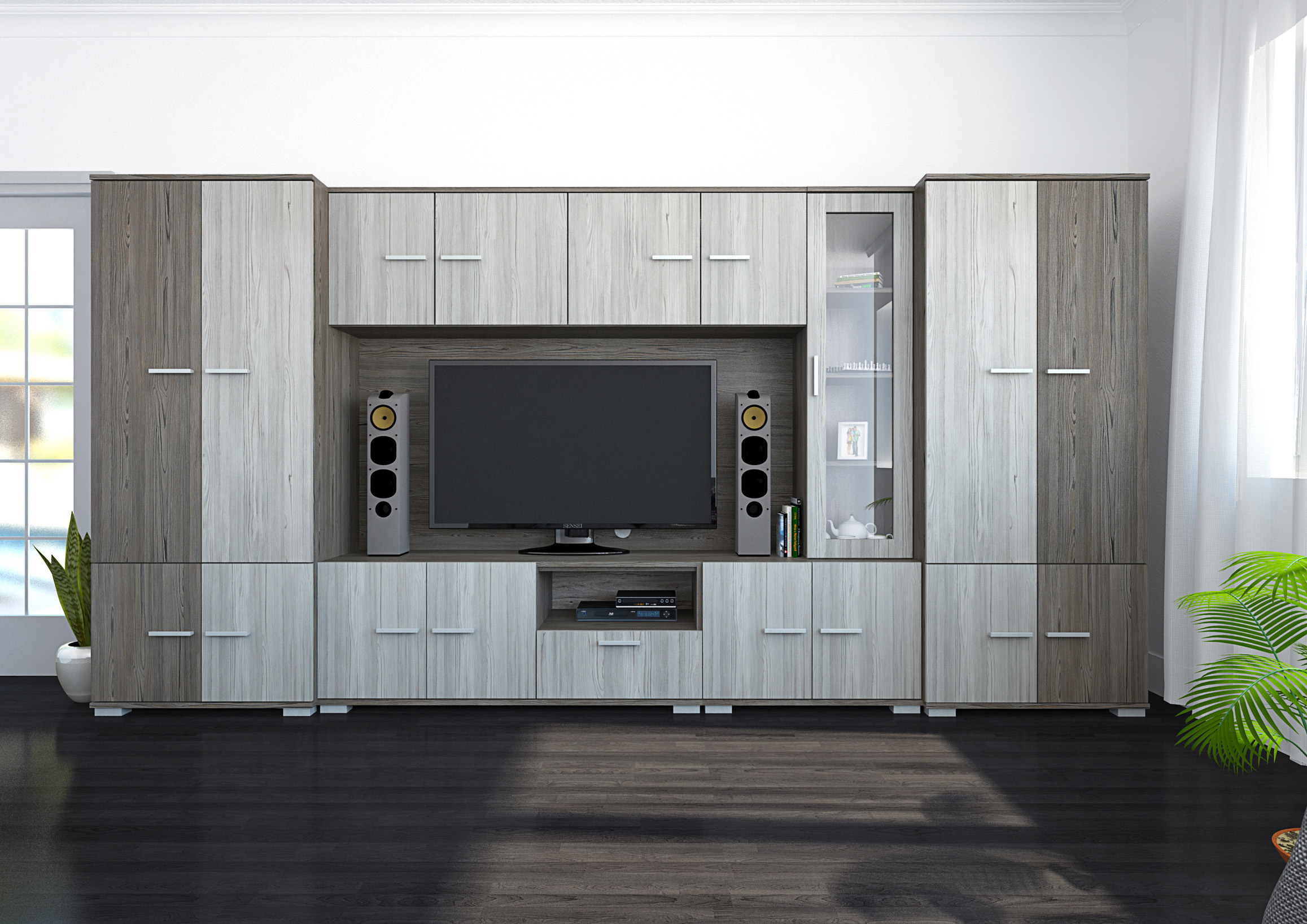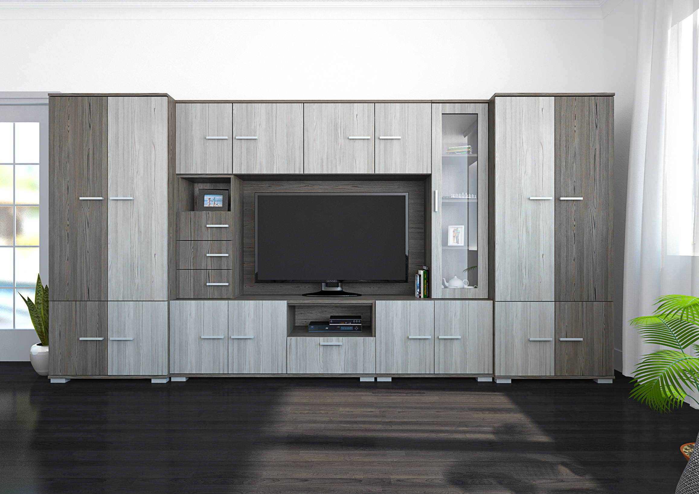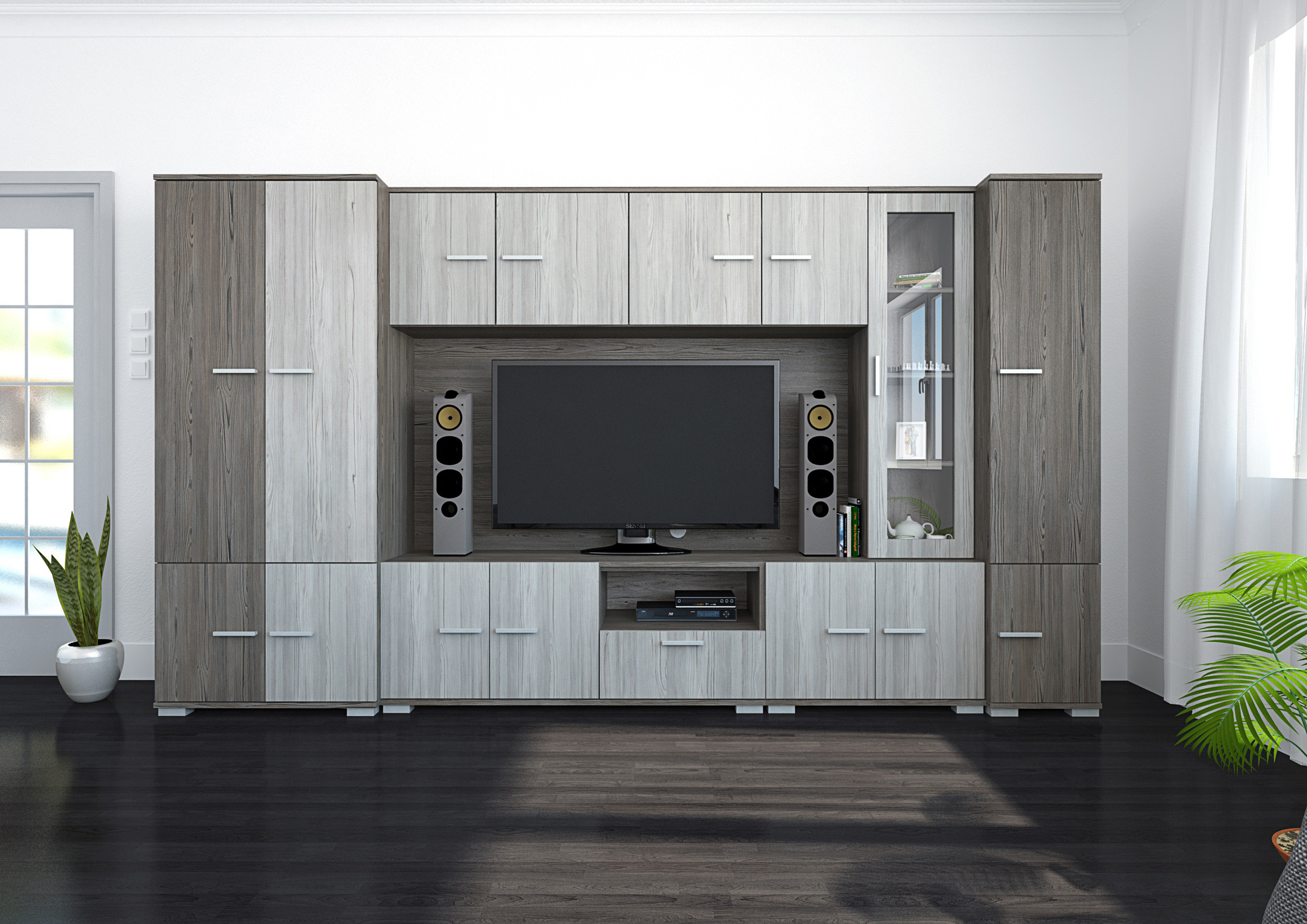 A Verona szekrénysor megjelenésével, letisztult formájával bármely nappaliba könnyedén beilleszthető. Sötét katthult-katthult színkombinációjával világos és sötét falszín mellett is jól mutat. Nagyon jól pakolható, jól tervezett belső tereiben mindennek meglesz a megfelelő helye, hiszen polcos, fiókos és ruhatárolós elemek egyaránt megtalálhatóak benne. 340 és 380 cm széles kivitelben is rendelhető. A szekrénysor egyik nagy előnye, hogy nagyobb és kisebb TV elhelyezésére is van lehetőség, ugyanis a TV-s box úgy lett kialakítva, hogy a 140 cm széles TV-s rész, a felső 40 cm-es fiókos elem kihagyásával, 180 cm szélesre növelhető. A fiókos elem a sor részét képezi.